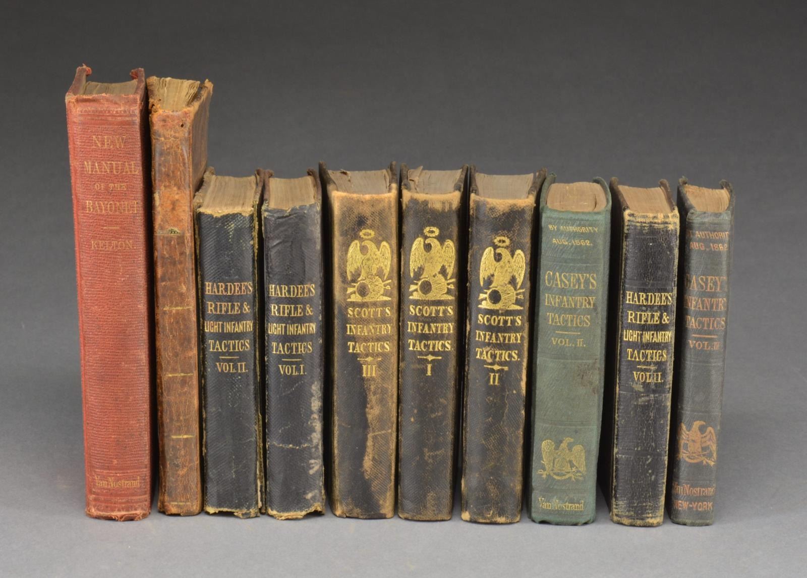 1) INFANTRY EXERCISE OF THE UNITED STATES ARMY ABRIDGED FOR THE USE OF THE MILITIA OF THE UNITED STATES. This manual was published in Montpelier, VT in 1820 & printed by EP Walton. CONDITION: appears complete w/ light wear overall & expected wear/losses to corners & edges. 2) NEW MANUAL OF THE BAYONET. This manual was published in 1862 & printed by D. Van Nostrand. Written by Lt. JC Kelton. CONDITION: light wear overall. Plates appear complete. Spine loose. 3-5) 3 VOLUME SET OF INFANTRY TACTICS. This 3 volume set was printed in New York in 1840 by Harper & Brothers & was written by Major General Winfield Scott. CONDITION: all 3 volumes seem complete w/ light wear overall. 6-8) 3 VOLUME SET OF INFANTRY TACTICS. This 3 volume set was printed in Philadelphia in 1861 by J.B. Lippincott & was written by Lt. Col. W.J. Hardee. CONDITION: all 3 volumes seem complete w/ light wear overall. Spines are unbroken but getting weak. 9-10) VOLUME 2 & 3 OF INFANTRY TACTICS. These 2 volumes of a 3 volume set were printed in New York in 1862 by D. Van Nostrand & was written by Brigadier General Silas Casey. CONDITION: vol. 2 has a bit of water damage. Vol. 3 shows light overall wear. (02-14265(10)/BF). $1,000-1,500.