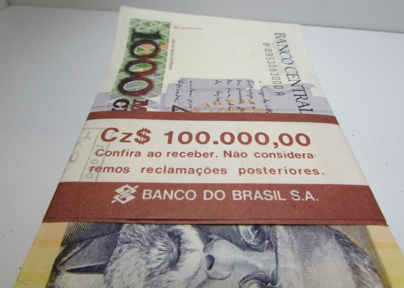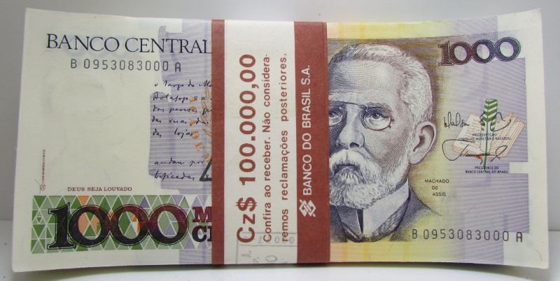 100 Consecutive Brazil Central Bank 1000 Cruzados Bank Notes (Brick) With Bank Wrapper