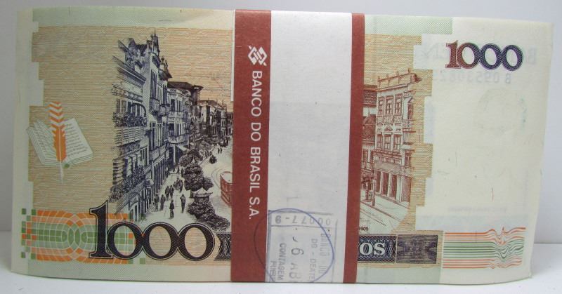 100 Consecutive Brazil Central Bank 1000 Cruzados Bank Notes - Bank Wrapper Still In-Tact With Date Stamp (1990)