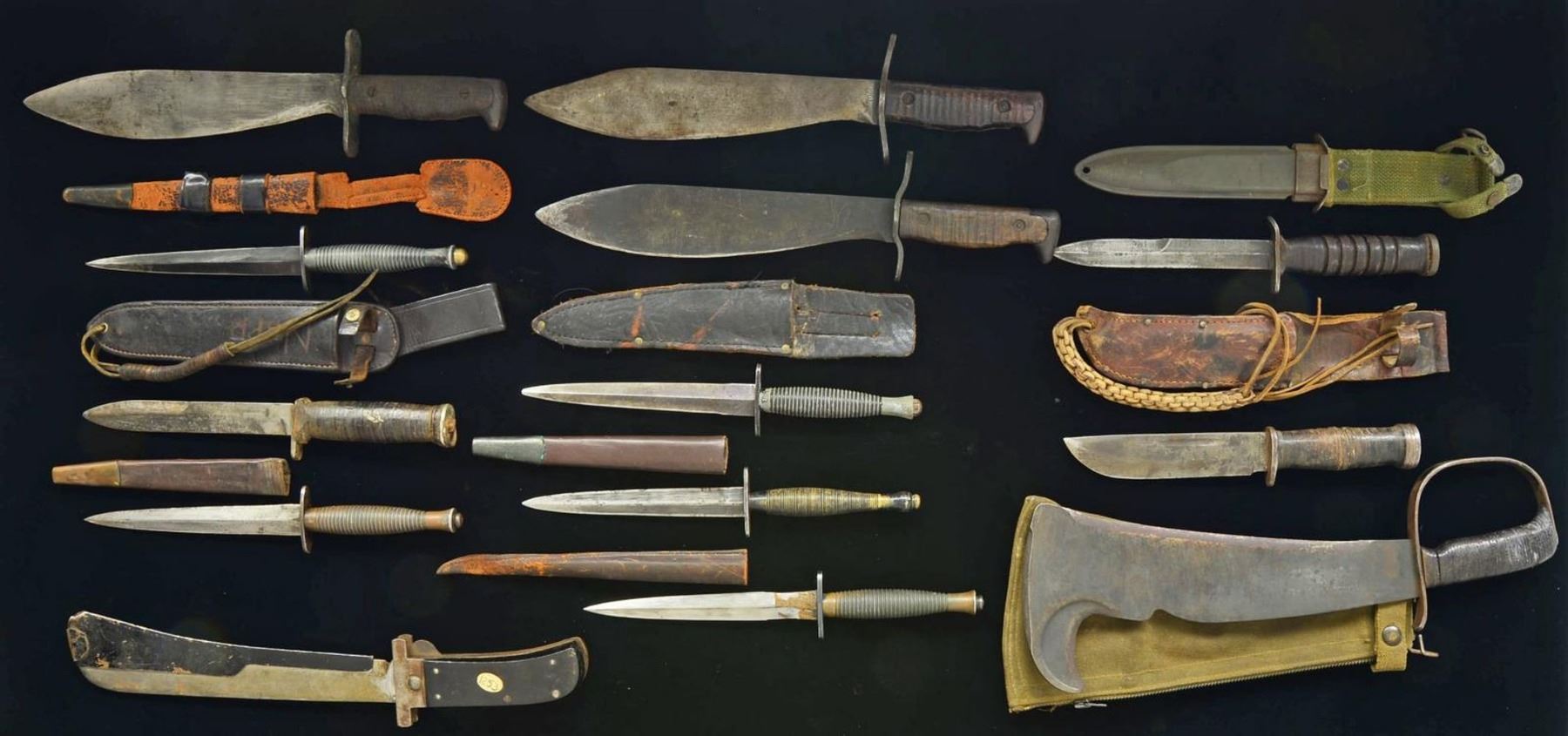 This interesting group of knives includes 1 US Air Force survival knife/folding machete marked, “CATTARAUGUS”. / 3 US M1910 bolo knives, no scabbards. / 1 US Army LC-14-B survival knife & green canvas scabbard & instruction book. / 5 Different Sykes Fairbairn commando knives, all having varying degrees of complete scabbards. / 2 WWII US fighting knives & leather scabbards. / 1 US M3 fighting knife & scabbard. CONDITION: most knives show moderate wear but are complete & functional. (02-14397-2(13)/BF). $800-1,100.