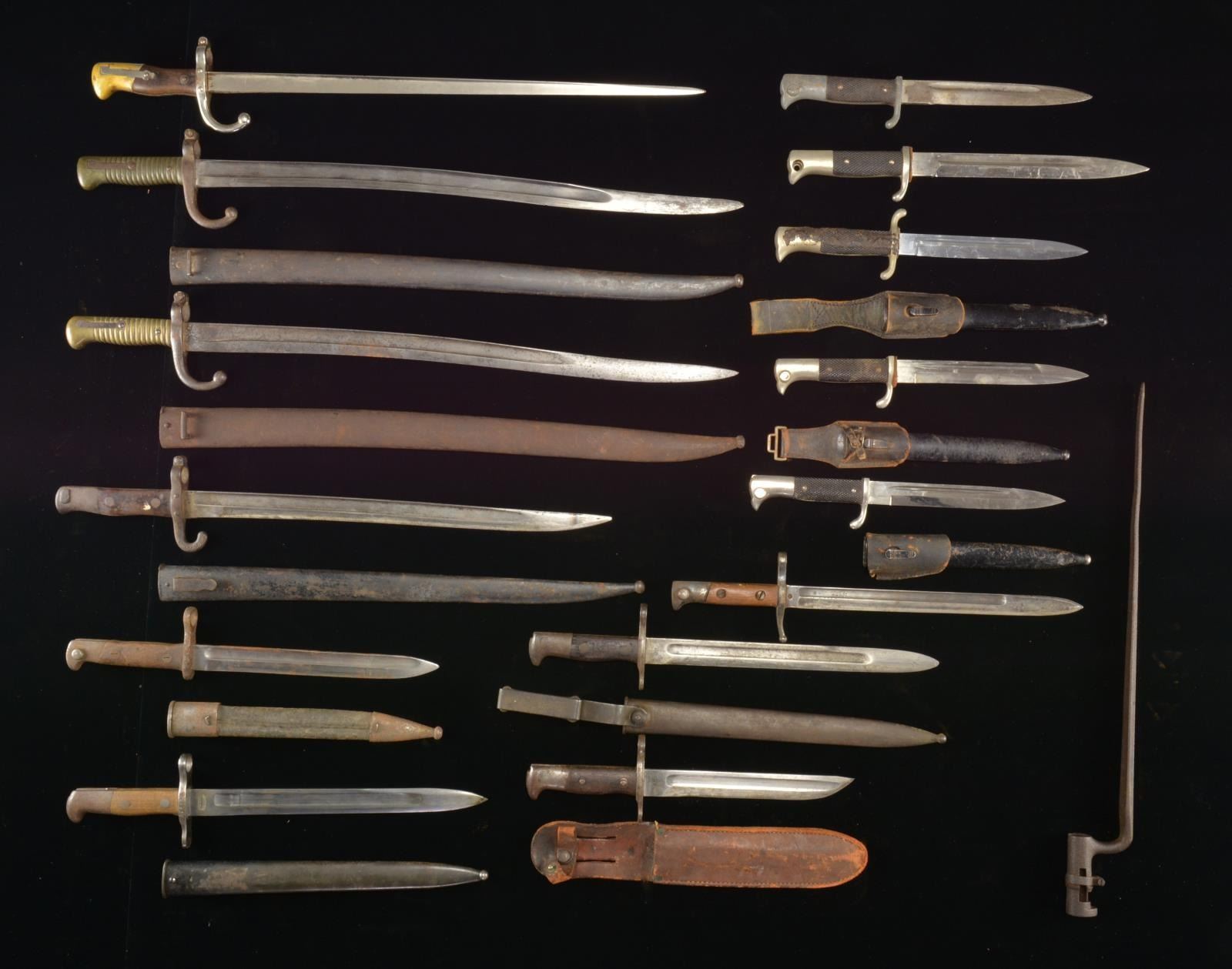 This group consists of 2 M1866 French Chassepot bayonets & scabbards. / 1 1874 French Gras bayonet, no scabbard. / 2 WWII German Infantry dress bayonets w/ scabbards & frogs. / 2 WWII German Infantry dress bayonets in poor condition, no scabbards. / 1 WWII German fireman’s dress bayonet having deposits on the handle. / 1 Italian M1891 Carcano bayonet, no scabbard. / 1 1892 Krag Jorgensen bayonet & scabbard. / 1 US 58 cal. triangular bayonet in excavated condition, no scabbard. / 1 Swiss M1889 Schmidt Rubin bayonet & scabbard. / 1 1892 Krag Jorgensen bayonet made into a belt knife w/ leather scabbard. / 2 European bayonets & scabbards. CONDITION: all bayonets show light to moderate wear except as noted. (02-14495(15)/BF). $600-900.