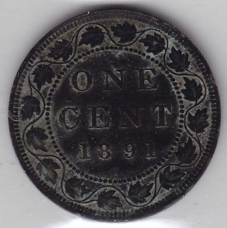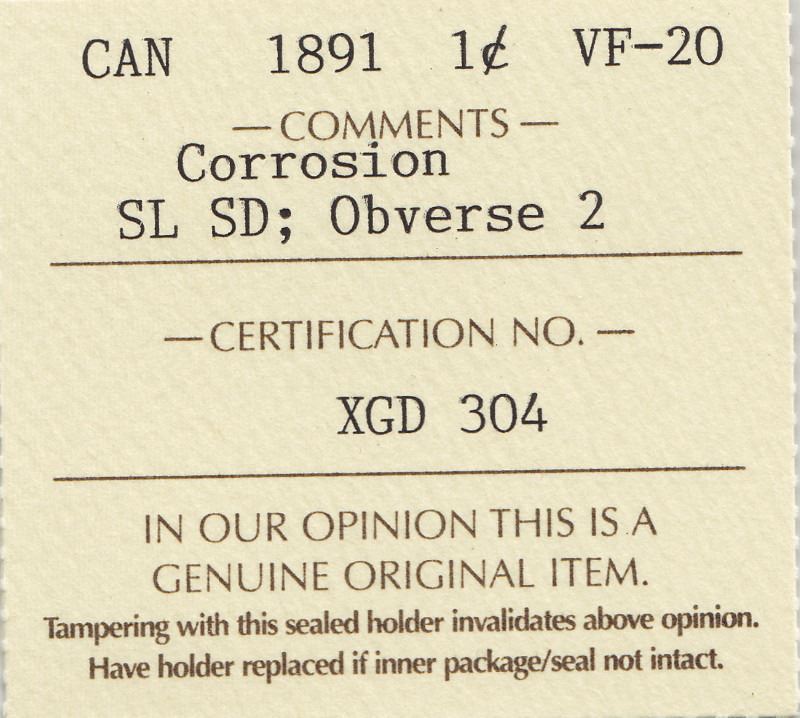 1891 Canadian Large Cent Coin - Graded By ICCS VF-20 - SL SD - OBV 2 -- (XGD 304) -- Book Value $200