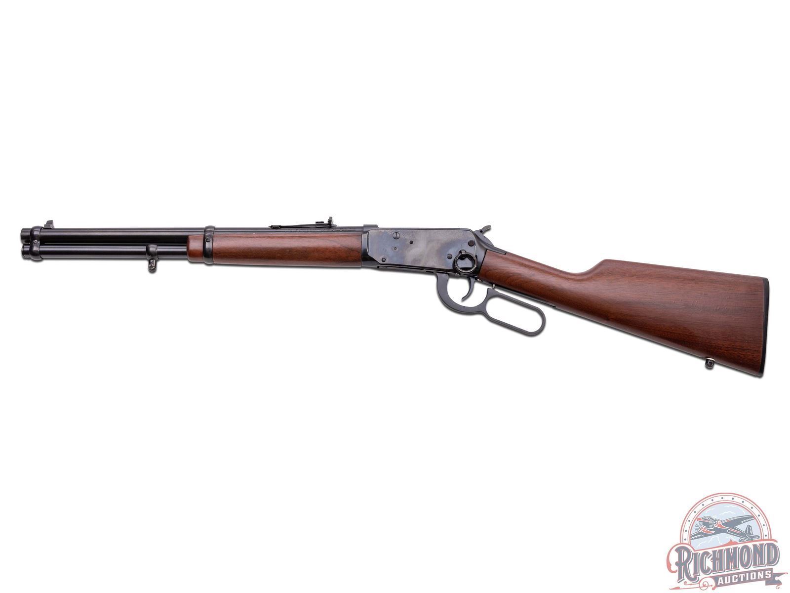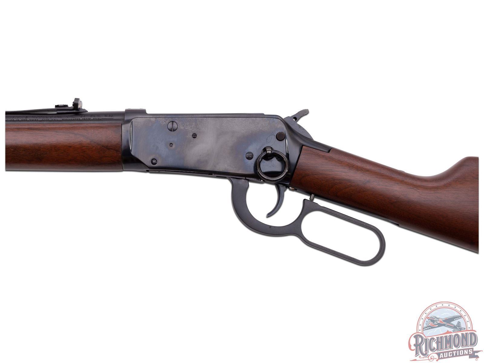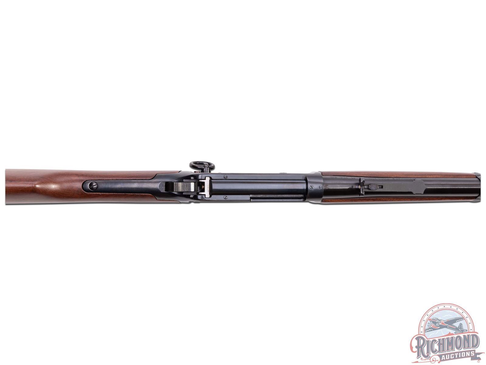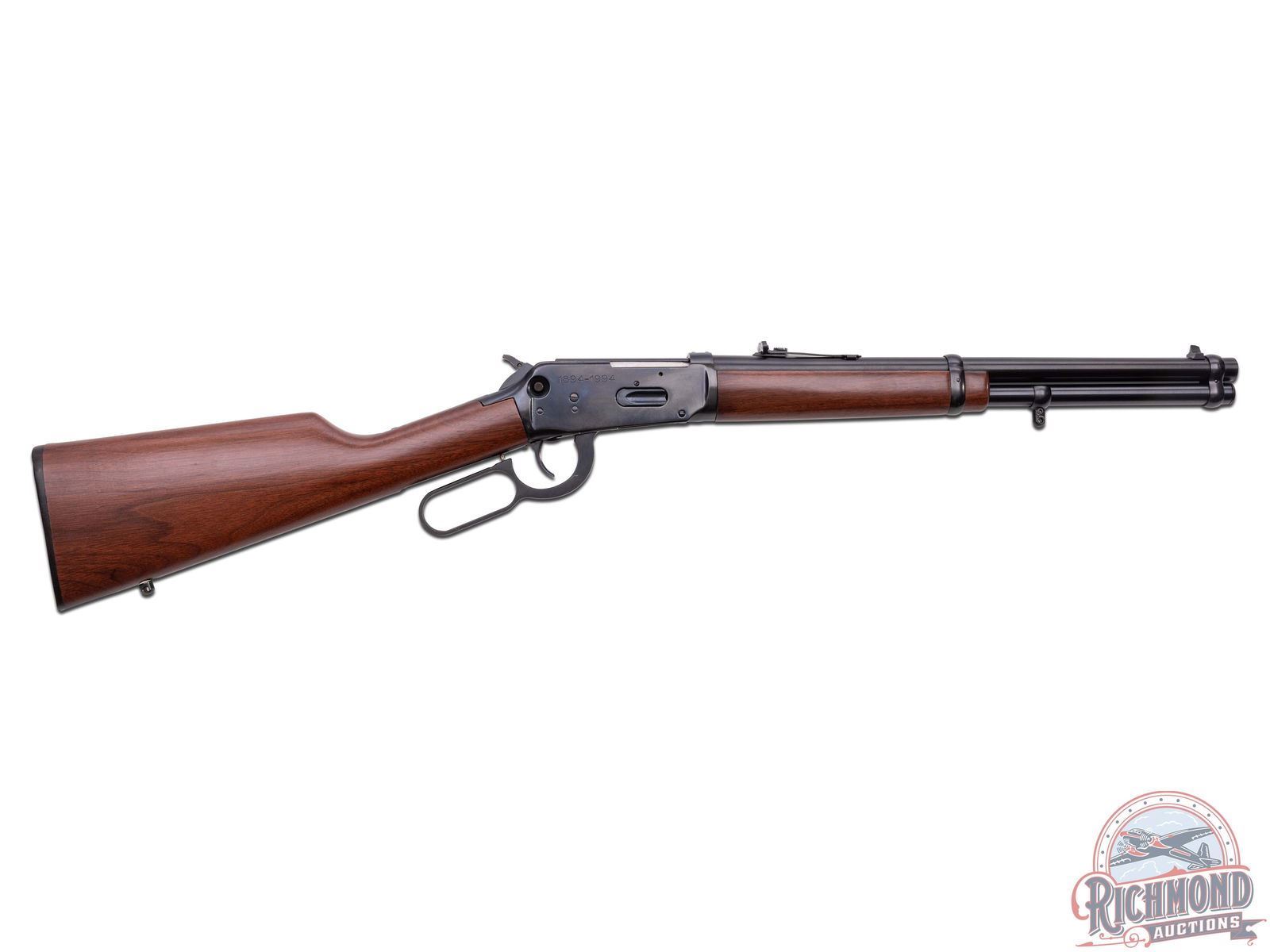 Made by U.S. Repeating Arms Company in 1994. 16" blued round Winchester Proof Steel barrel with blade front sight, Rocky Mountain rear adjustable sight, and Winchester two-line address in 44 Remington Magnum caliber. Blued solid "Angle Eject" frame with push button safety, plain trigger, and marked "1894-1994" with blued full tubular magazine. Reddish brown walnut plain stocks with Winchester hard rubber butt plate and added sling swivel bases. CALIBER: 44 Rem Mag. S/N: 6129781. FFL STATUS: Modern.