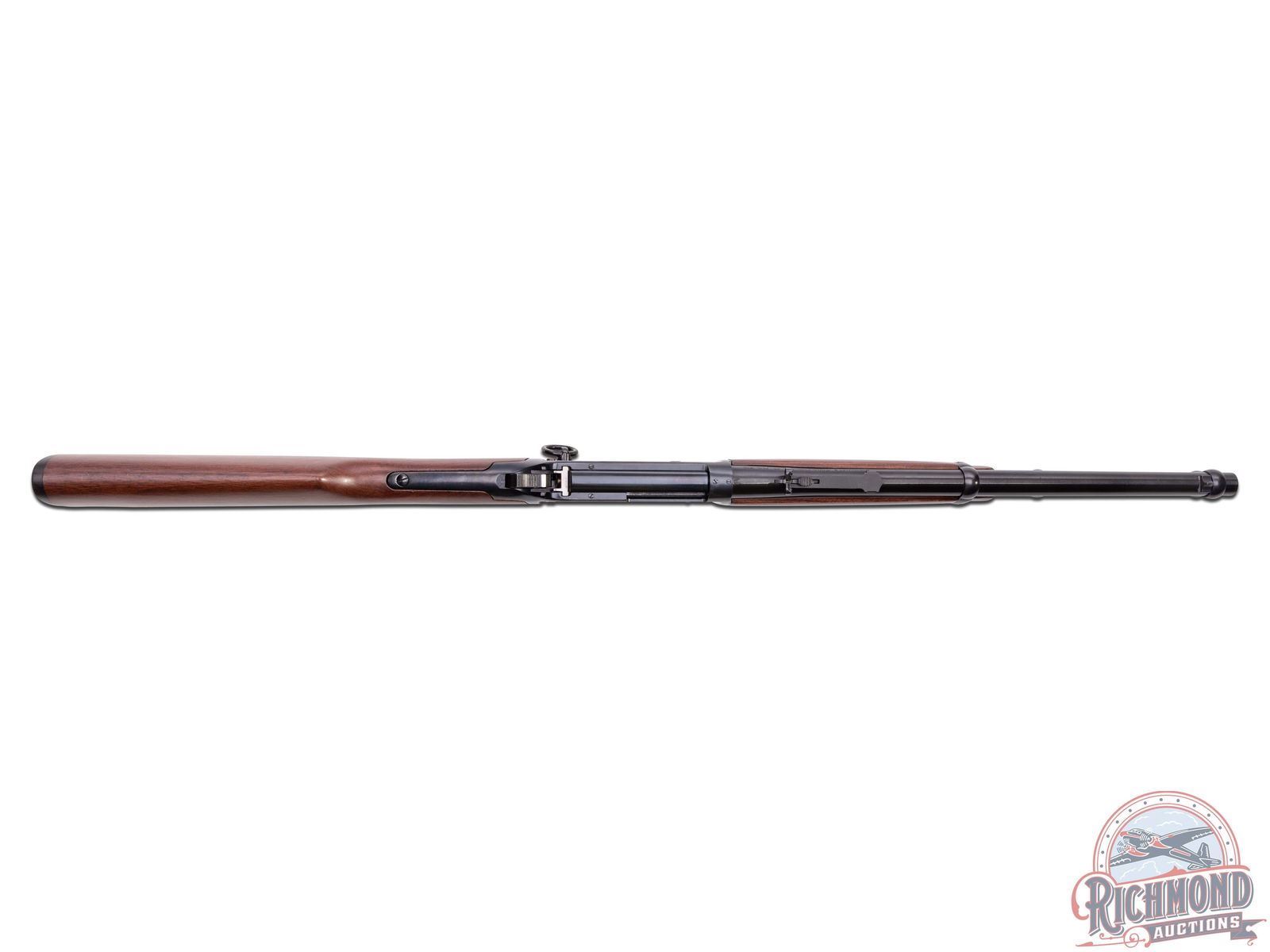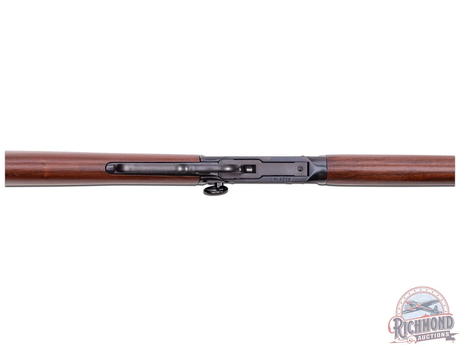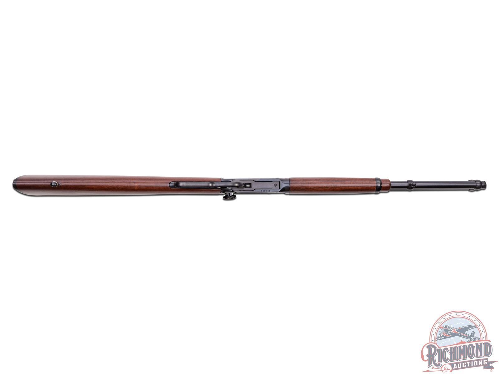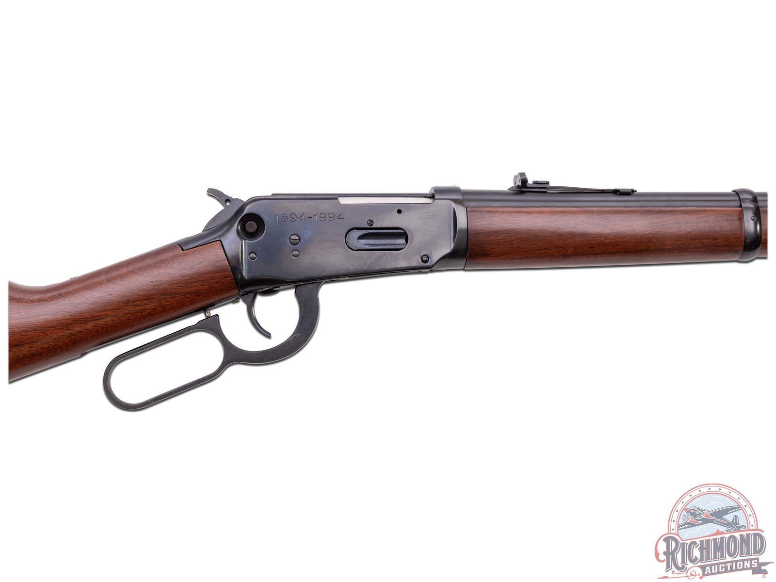 Made by U.S. Repeating Arms Company in 1994. 16" blued round Winchester Proof Steel barrel with blade front sight, Rocky Mountain rear adjustable sight, and Winchester two-line address in 44 Remington Magnum caliber. Blued solid "Angle Eject" frame with push button safety, plain trigger, and marked "1894-1994" with blued full tubular magazine. Reddish brown walnut plain stocks with Winchester hard rubber butt plate and added sling swivel bases. CALIBER: 44 Rem Mag. S/N: 6129781. FFL STATUS: Modern.