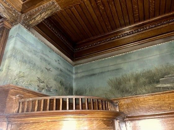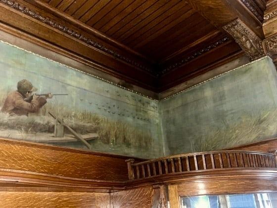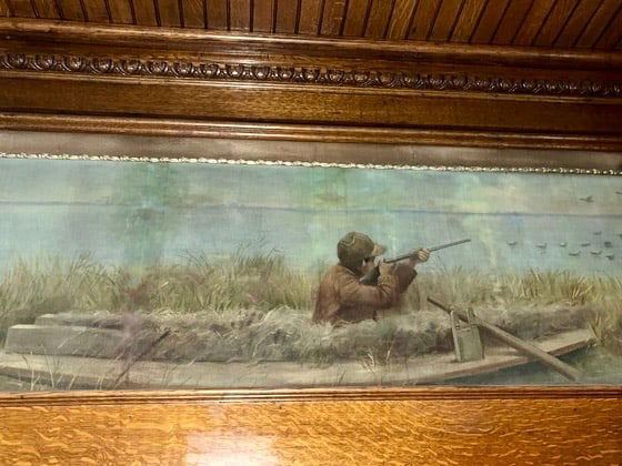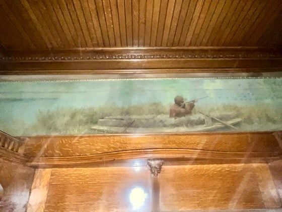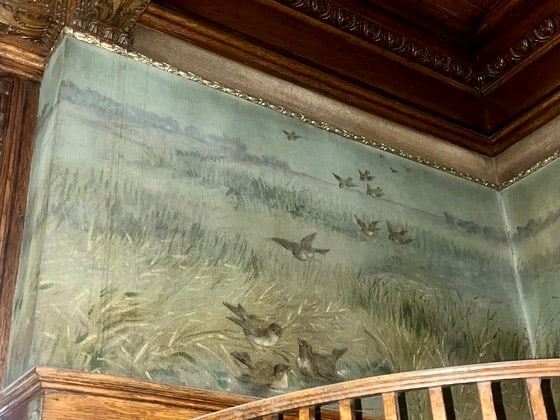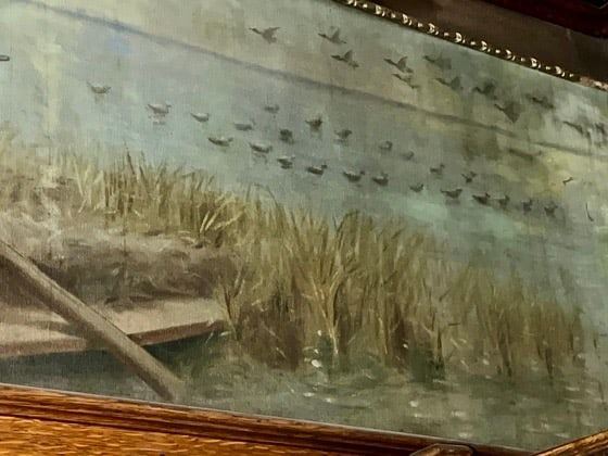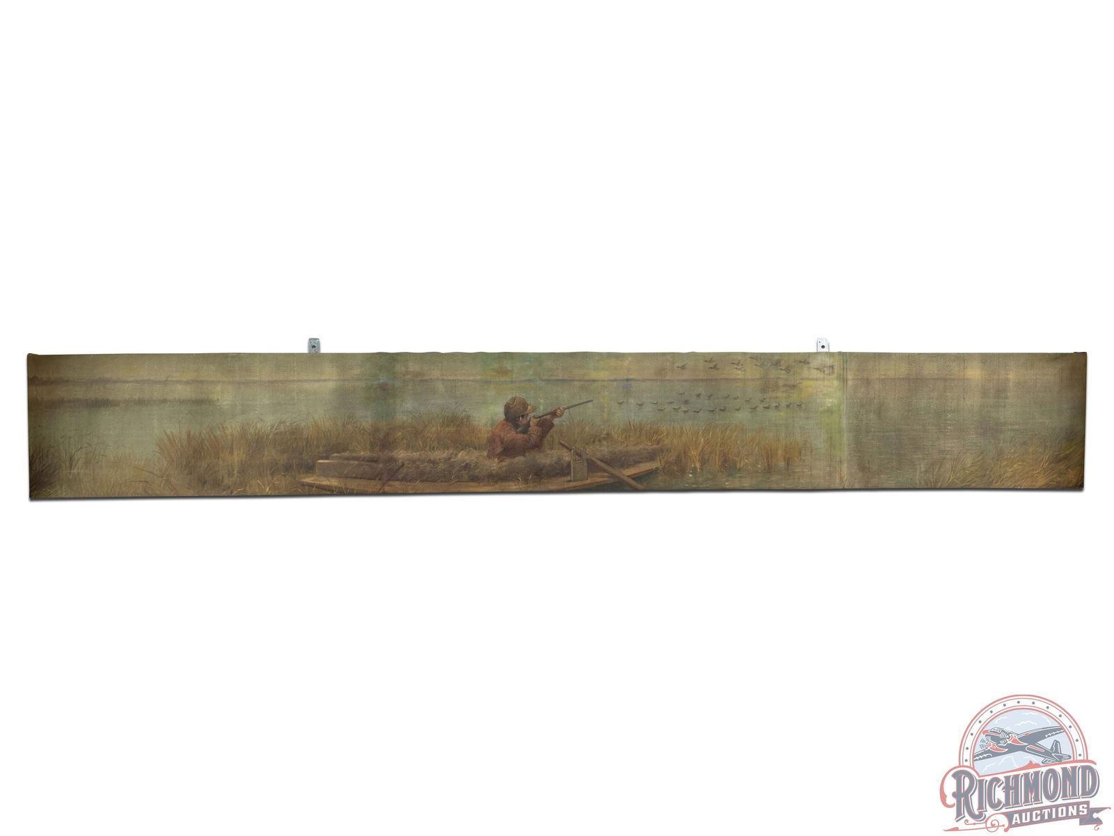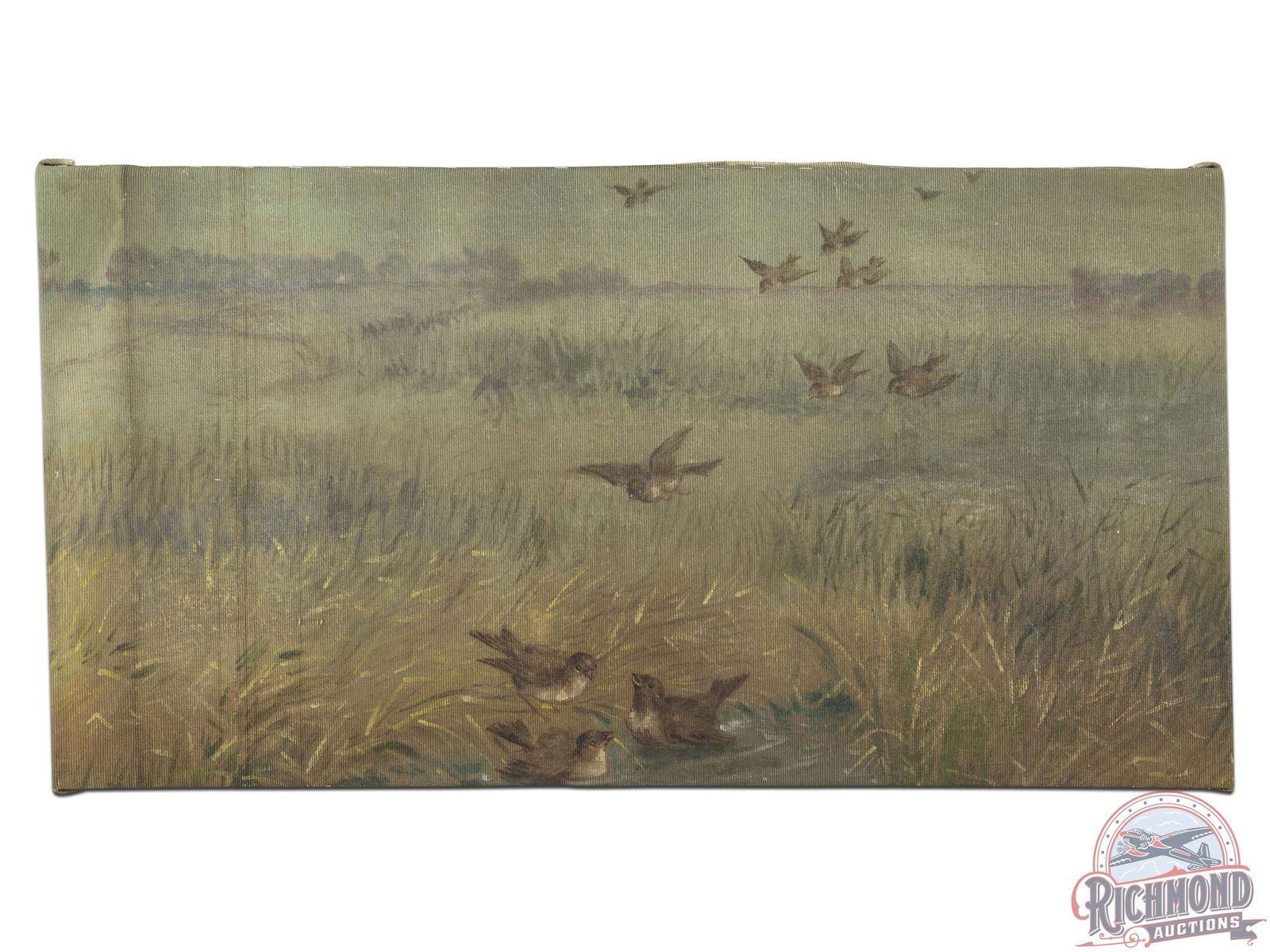 First panel painting measures 18" tall by 11.5' long. Second panel measures 18" tall by 35" long. This section of the painting was along the top of the wall that moved around the corner. This beautiful large painting depicts a marsh scene with a sportsman pointing his shotgun toward a flock of ducks in flight from his wood boat. Smaller section features a flock of birds flying in and nesting in a tall grass field. This piece closely resembles A.B. Frost's original "Shooting Ducks from a Blind" that is part of his 1895 publication "Shooting Pictures", Charles Scribner's Sons Binding of the Portfolio booklet, as well as "The Sporting Art of Arthur Burdett Frost" by Colleen F. Storey, James A. Casada, Ph.D. and Charles Wechsler on page 164. Part of the Vandling mansion wallpaper collection.