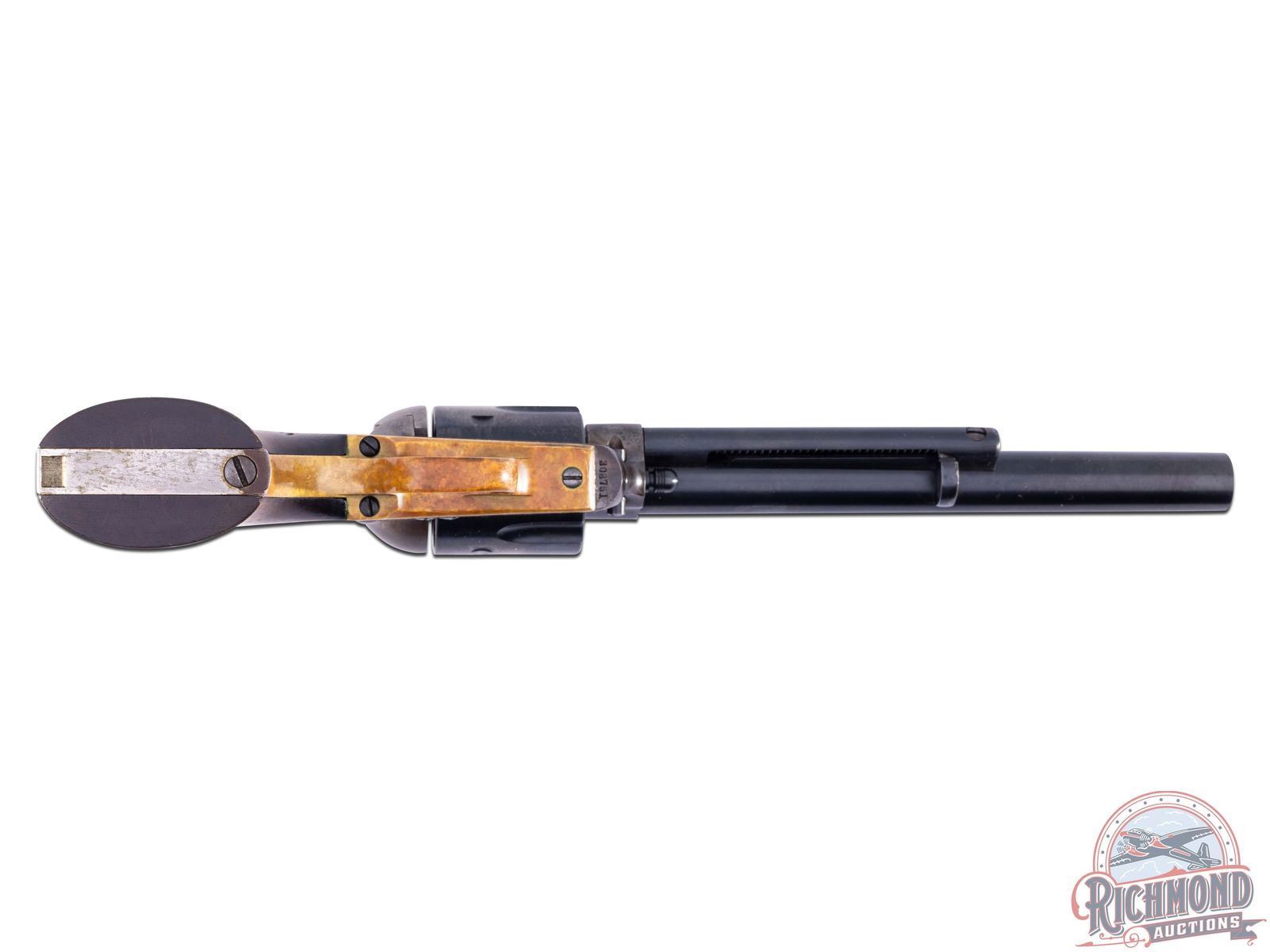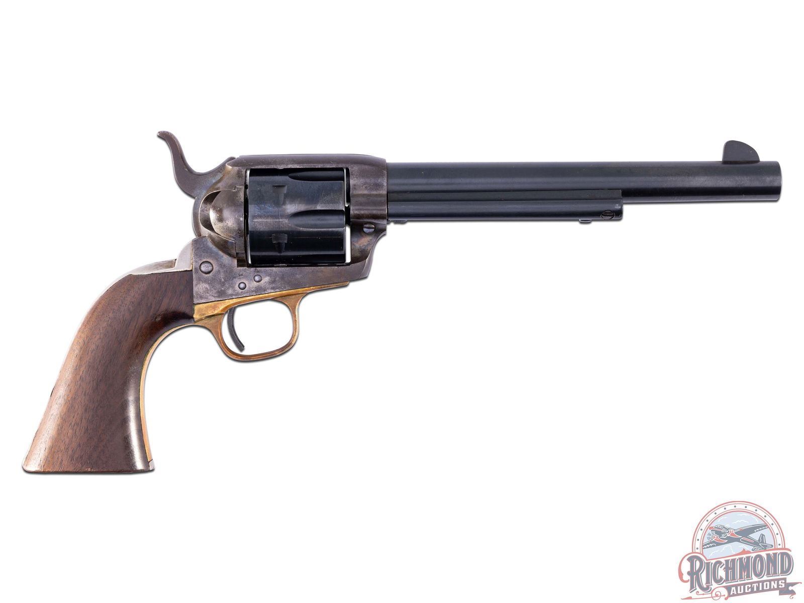 Manufactured in 1909 making it as pre-war first generation SAA. Features a calvary standard 7-1/2" blued barrel with blade front sight and rear integrated notch. Top of the barrel is stamped with Colt's single line address with "COLT SINGLE ACTION ARMY 45" stamped on the left side of the barrel. Case-hardened receiver is stamped with Patent dates "SEPT 19 1871 / JULY 2,72 JAN 19, 75" on the bottom left side with the rampant Colt logo. Non-factory parts include blued fluted 6 round cylinder chambered for 45 Colt, brass (uncleaned) trigger guard, nickel plated grip strap and smooth hardwood grips. CALIBER: 45 Colt. S/N: 308751. FFL STATUS: Curio & Relic.