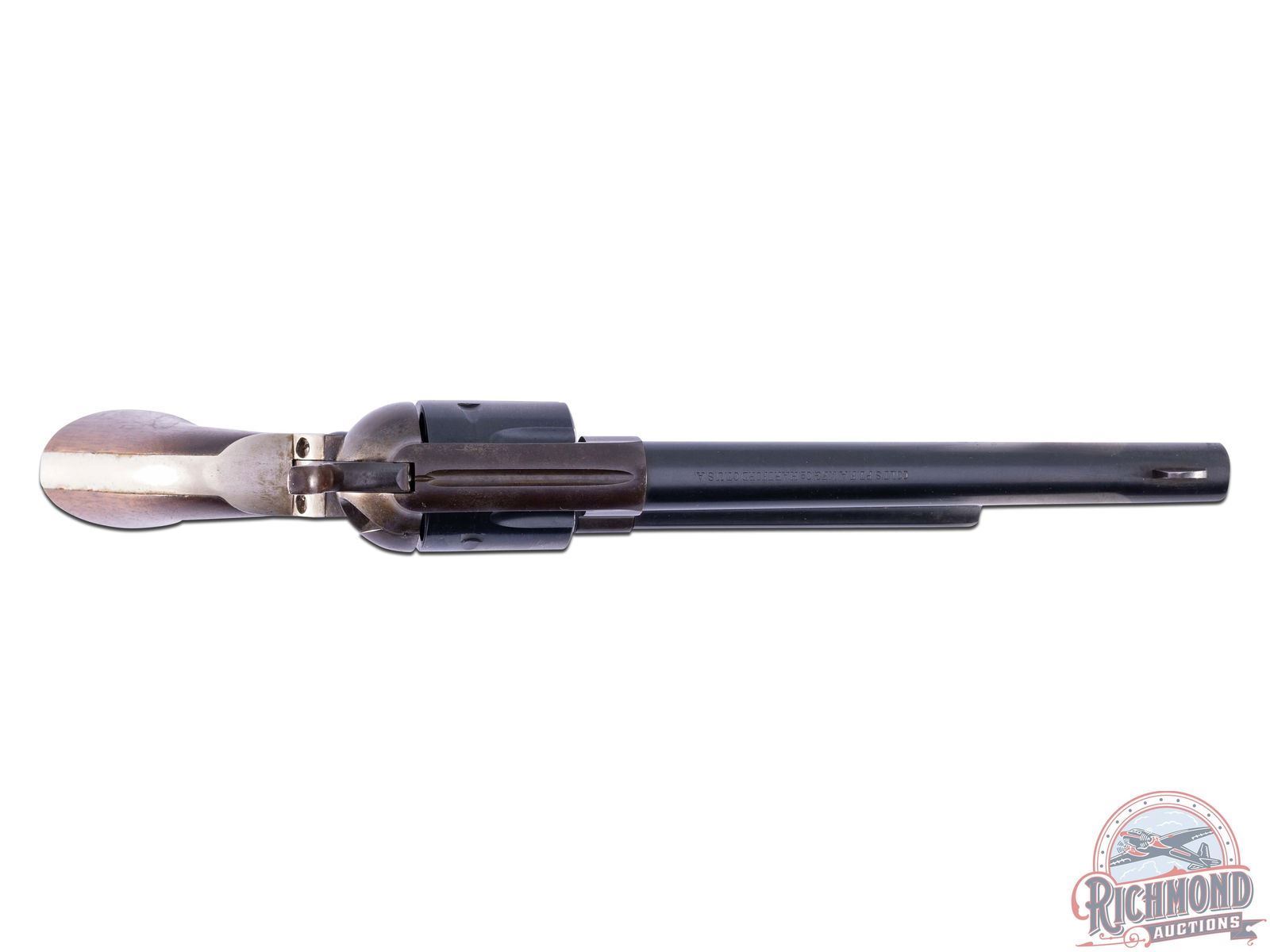 Retains 90% original blue finish with only a few oxidation spots along the top of the ejector shroud and at the tip of the muzzle. Case hardening has mostly turned to a brown-gray patina. Hammer appears to have been altered for a higher stance. A small chip of nickel plating missing on the bottom toe of the grip. Grips show some very light dings on the edges. Nice bore and good mechanics.