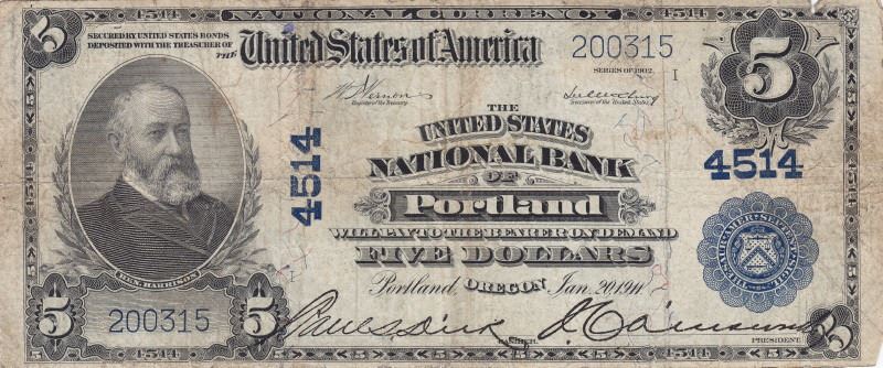 1911 USA National Bank $5 Note - Portland Oregon - #4514 - Serial 200315, Book Value 200-250
