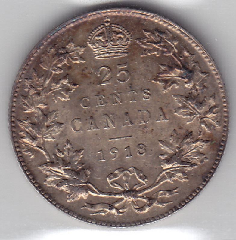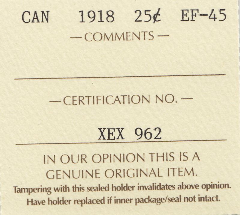1918 Canadian Silver 25-Cent Quarter Coin - Graded By ICCS EF-45 -- Book Value $60 (XEX 962)