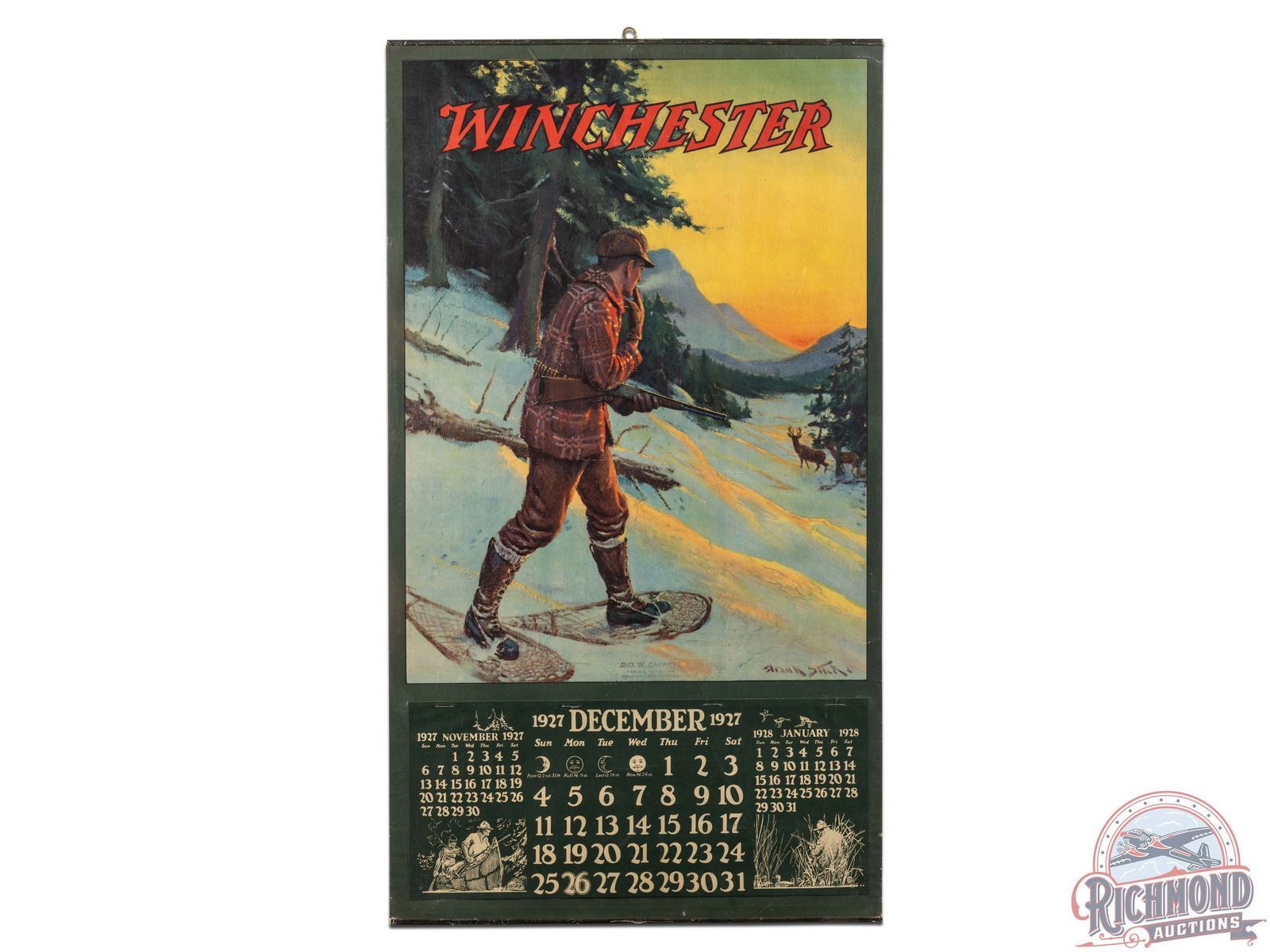 Nice paper advertising calendar with unique deer hunting snow scene by artist Frank Stick. Exhibits very well with light wear including a few minor creases, slight tears and loss. Small mounting hole at bottom band. Stamped with "JNO W. Garrett, Colorado Springs, CO" at bottom of the scene, most likely a Winchester dealer. Retains December 1927 calendar page with top and bottom bands. Shrink wrapped and secured to foamboard. 26.75" H x 15" W.