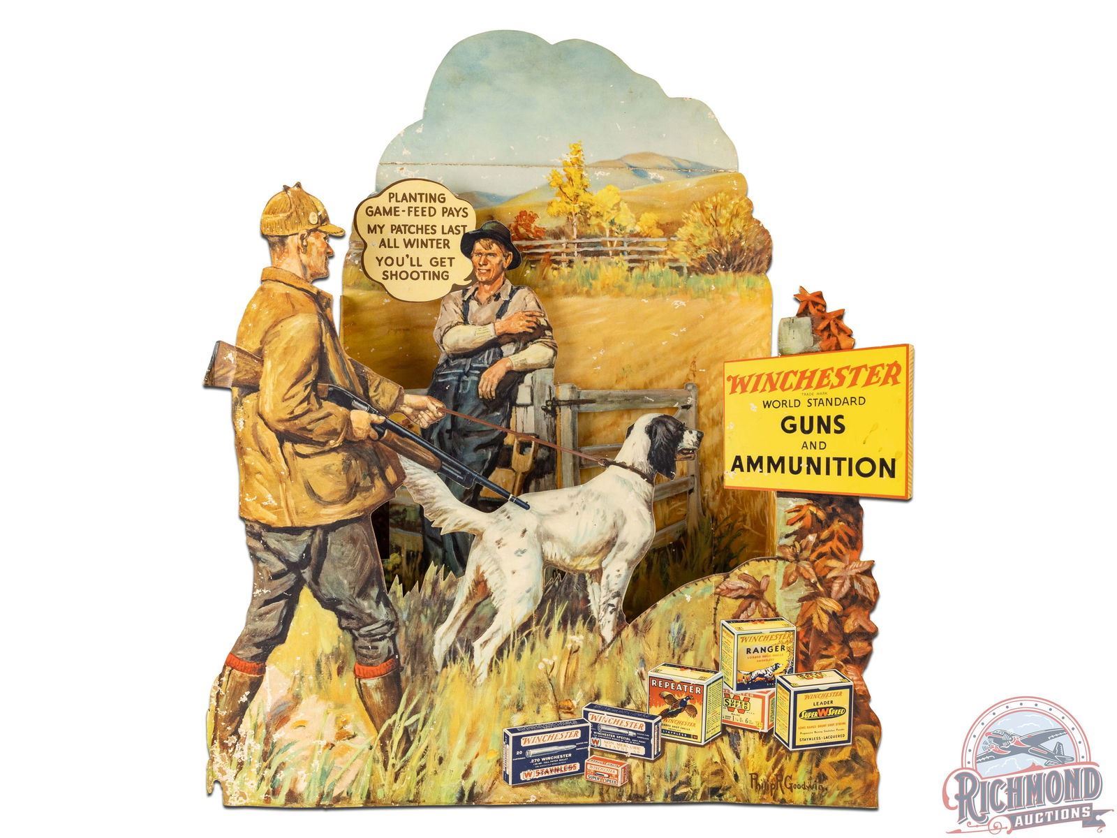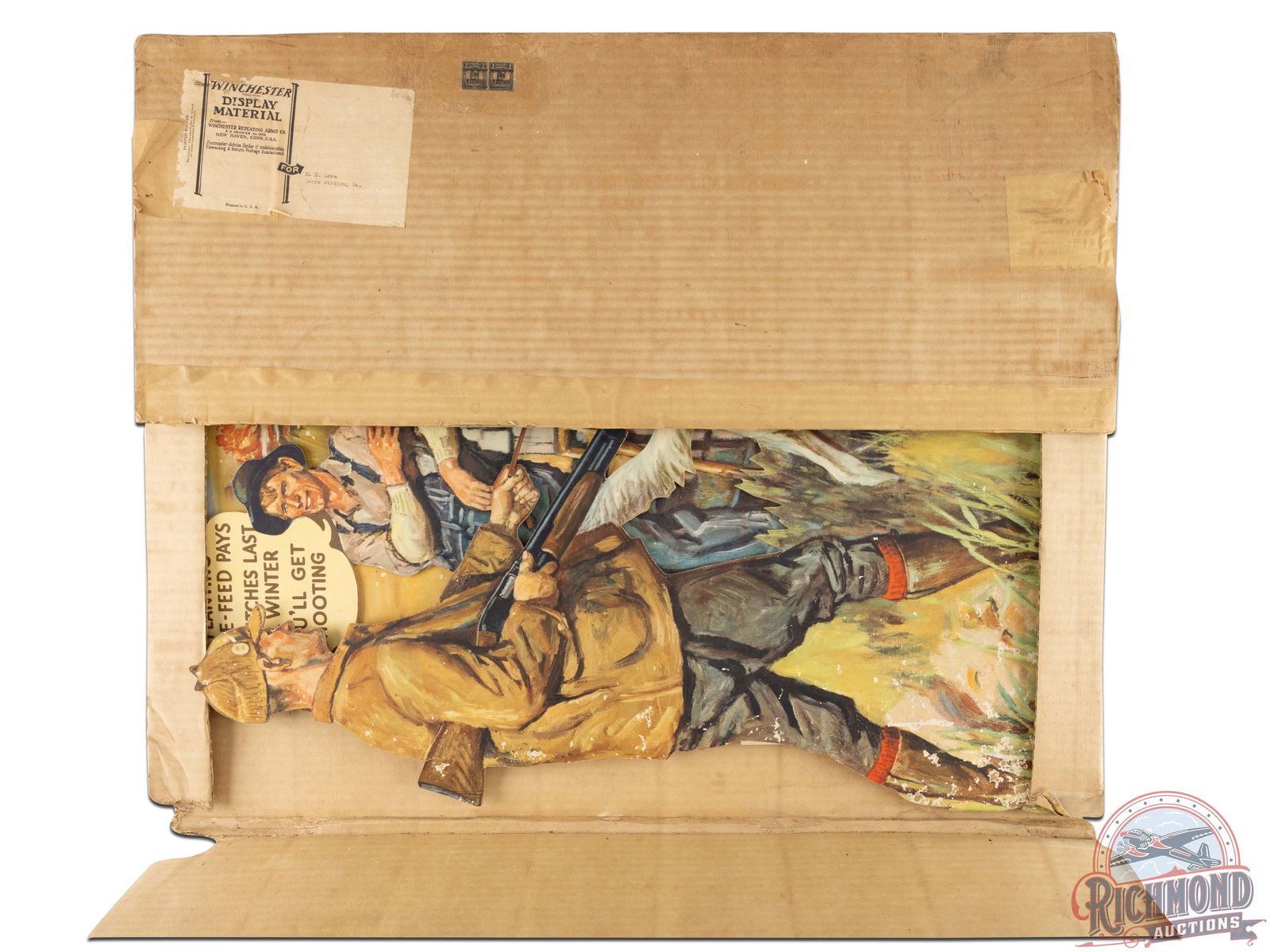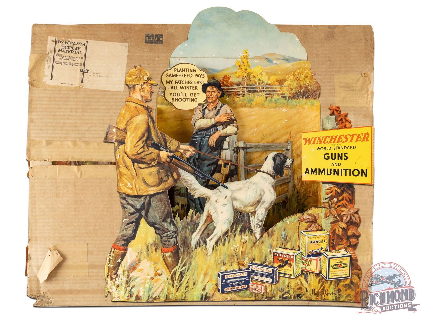 Circa early to mid 1930's. Scarce NOS (new old stock) Winchester 3D cardboard countertop display with an incredible scene by renowned artist Philip R. Goodwin, who rarely painted upland game scenes. Includes box with original "Winchester Display Material" label addressed to E.H. Lowe in Carrs Station, GA. Fantastic colors with a farm and hunting scene and multiple Winchester ammunition boxes including Leader Super W Speed, Ranger and Repeater shotgun shells and .270 Winchester, .32 Winchester Special and .22 LR rifle cartridges. The display has areas of surface loss throughout. Bottom left corner has wear and some bending. Minor residue along the Guns & Ammunition sign. The die cut edges have wear including a tear at the shotgun barrel and bends at the buttstock. Sign topper is present but has detached. Reverse retains partial label with assembly instructions Overall an early and seldom seen Winchester point of purchase display. 37" H x 31" W.