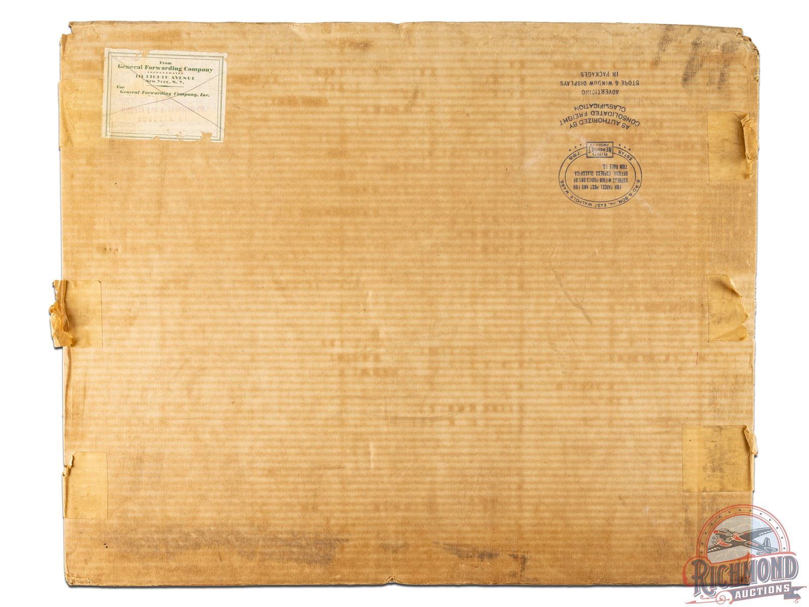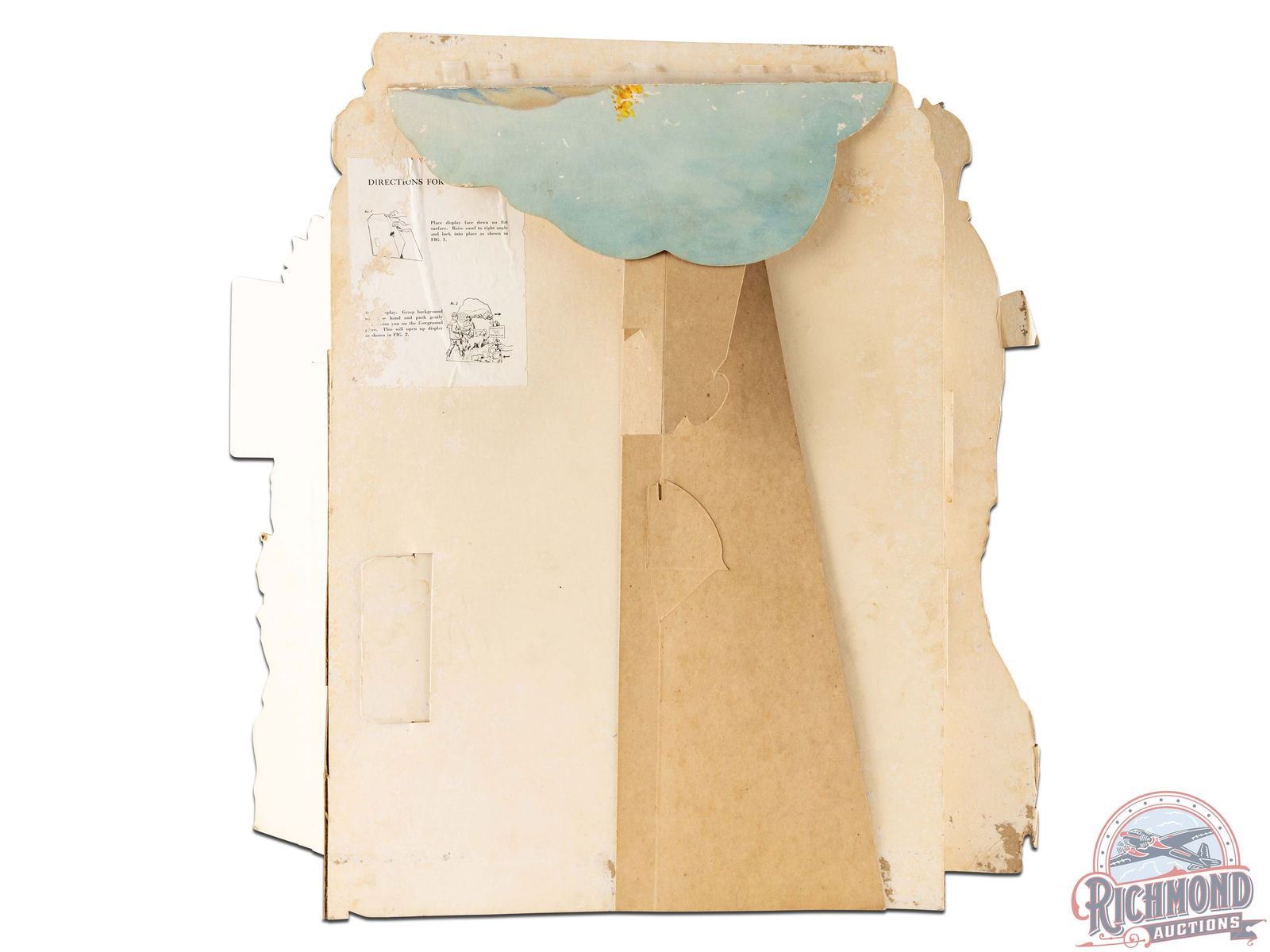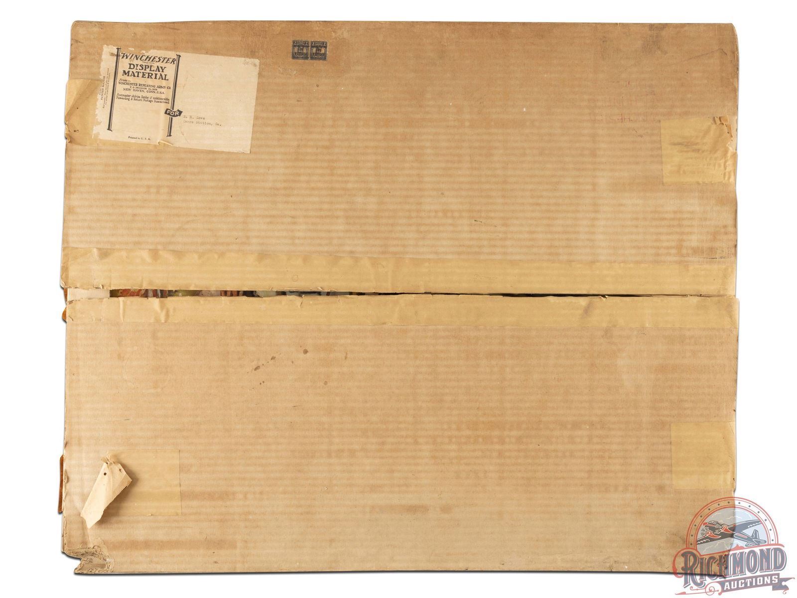Circa early to mid 1930's. Scarce NOS (new old stock) Winchester 3D cardboard countertop display with an incredible scene by renowned artist Philip R. Goodwin, who rarely painted upland game scenes. Includes box with original "Winchester Display Material" label addressed to E.H. Lowe in Carrs Station, GA. Fantastic colors with a farm and hunting scene and multiple Winchester ammunition boxes including Leader Super W Speed, Ranger and Repeater shotgun shells and .270 Winchester, .32 Winchester Special and .22 LR rifle cartridges. The display has areas of surface loss throughout. Bottom left corner has wear and some bending. Minor residue along the Guns & Ammunition sign. The die cut edges have wear including a tear at the shotgun barrel and bends at the buttstock. Sign topper is present but has detached. Reverse retains partial label with assembly instructions Overall an early and seldom seen Winchester point of purchase display. 37" H x 31" W.