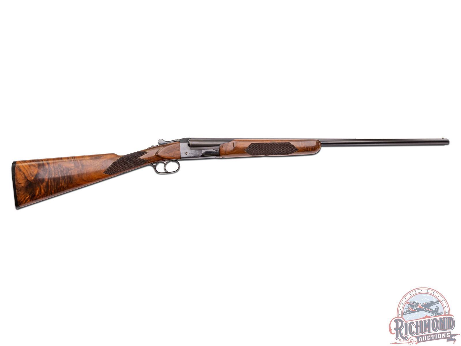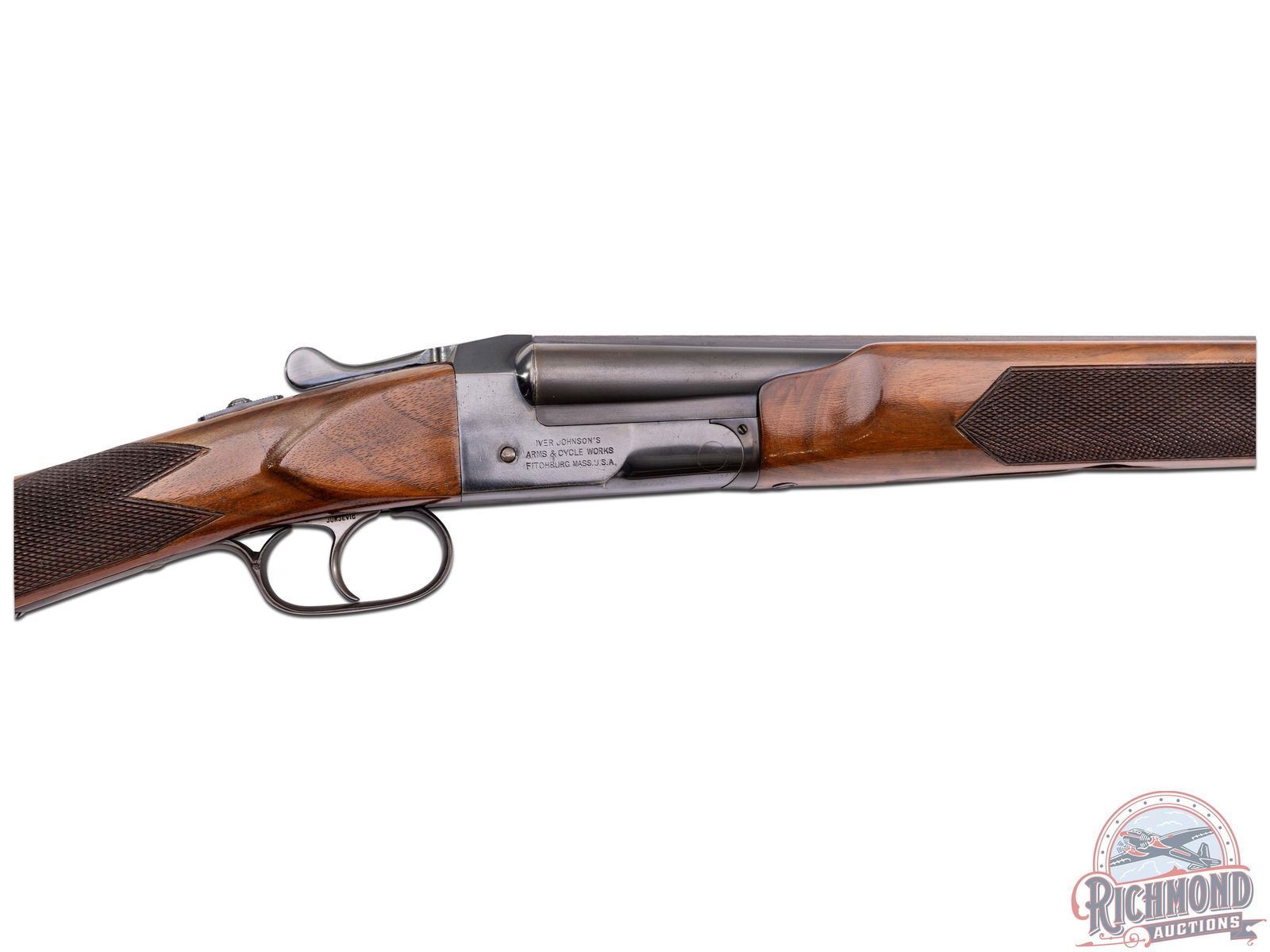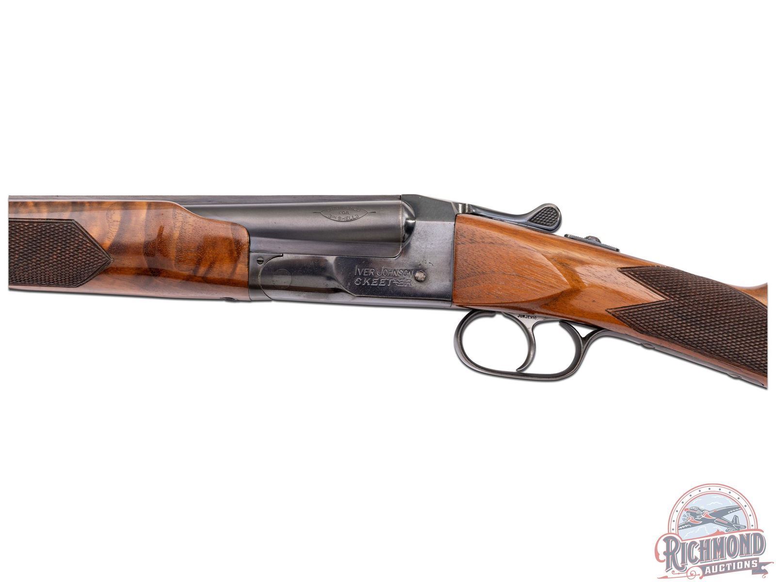 Manufactured between 1935 and 1939 by Iver Johnson Arms and Cycle Works. This double barrel features 26" solid rib barrels chambered for 3" shells and both choked Modified. White bead front sight and nickel bead mid-barrel. Blued boxlock receiver stamped on the left side "IVER JOHNSON / SKEET-ER" and on the right "IVER JOHNSON'S / ARMS & CYCLE WORKS / FITCHBURG MASS U.S.A.". Retrofitted with a Jurjevic non-selective single trigger and ejectors, also features a tang mounted safety switch. High figured walnut stock and forearm with hand checkering 16 LPI. Fitted with a factory Iver Johnson owl logo synthetic butt plate. LOP: 13-7/8". DAC: 1-1/4". DAH: 1-1/2". CALIBER: 410. S/N: S2750E. FFL STATUS: Curio & Relic.