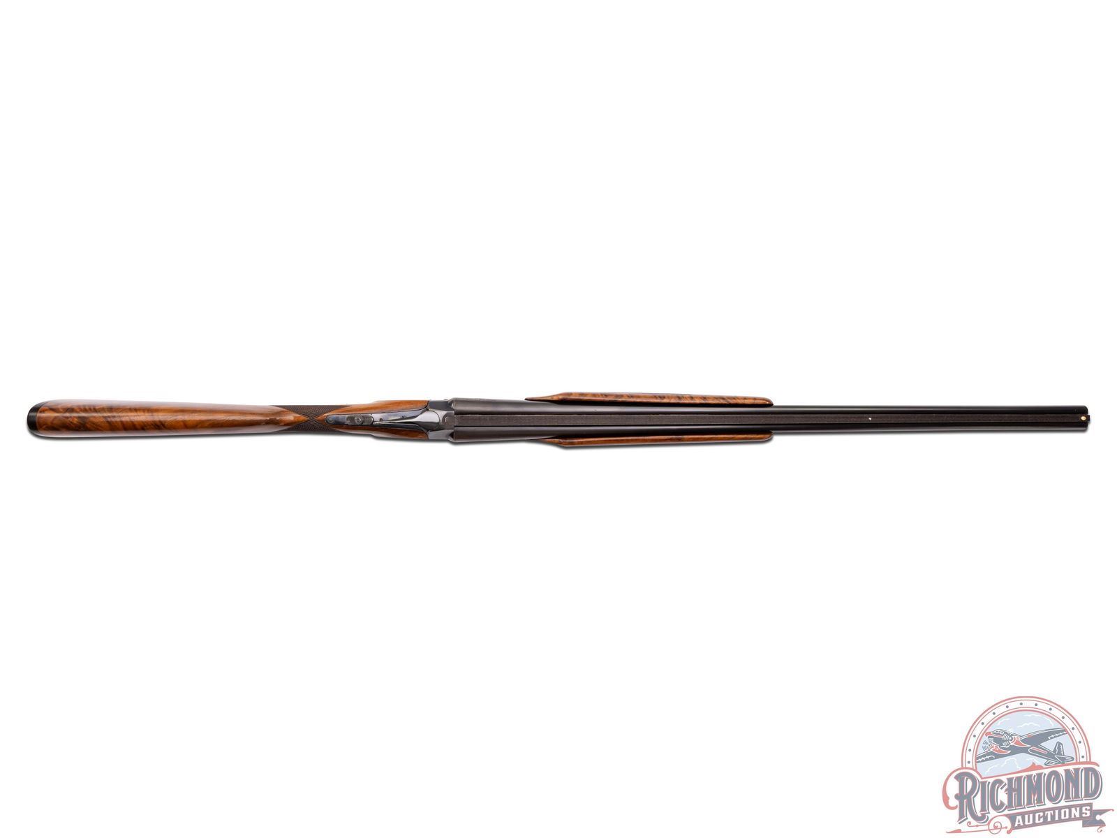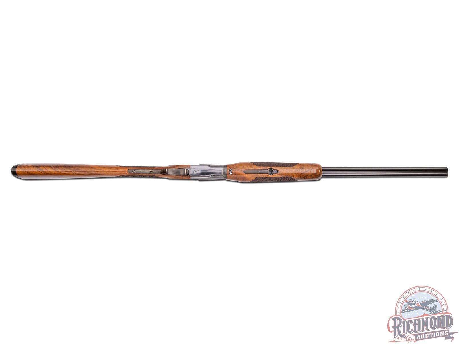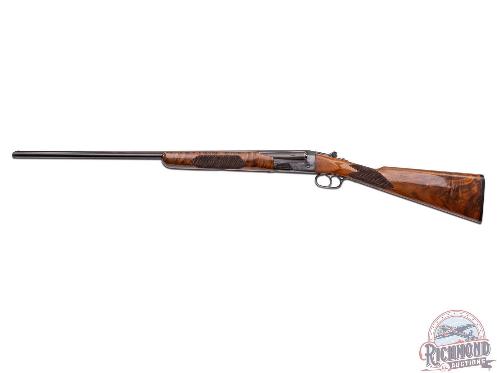 Manufactured between 1935 and 1939 by Iver Johnson Arms and Cycle Works. This double barrel features 26" solid rib barrels chambered for 3" shells and both choked Modified. White bead front sight and nickel bead mid-barrel. Blued boxlock receiver stamped on the left side "IVER JOHNSON / SKEET-ER" and on the right "IVER JOHNSON'S / ARMS & CYCLE WORKS / FITCHBURG MASS U.S.A.". Retrofitted with a Jurjevic non-selective single trigger and ejectors, also features a tang mounted safety switch. High figured walnut stock and forearm with hand checkering 16 LPI. Fitted with a factory Iver Johnson owl logo synthetic butt plate. LOP: 13-7/8". DAC: 1-1/4". DAH: 1-1/2". CALIBER: 410. S/N: S2750E. FFL STATUS: Curio & Relic.