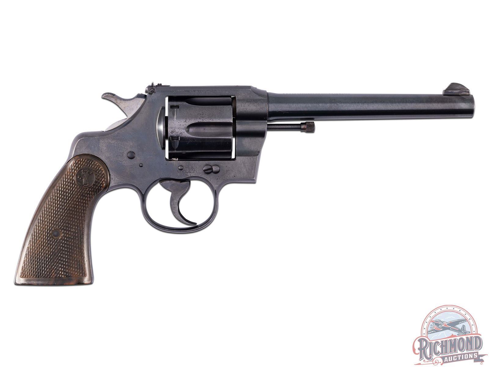 Manufactured in 1933. This well-kept Police features a 6" tapered barrel with rear adjustable notch sight and blade front sight. Left side is stamped "COLT / OFFICIAL POLICE / 32-20". Blued finish with a six round fluted, swing-out cylinder chambered for .32-20 WIN. Fitted with Colt factory brown checkered synthetic grips. CALIBER: 32-20 WIN. S/N: 583535. FFL STATUS: Curio & Relic.