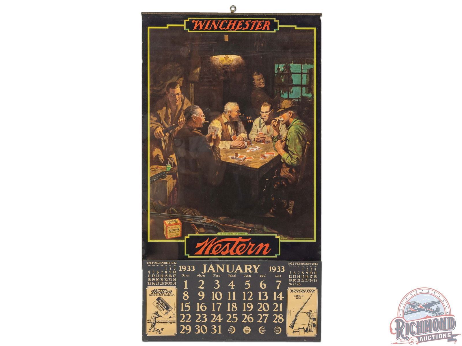 Exceptional lithograph paper advertising calendar sign featuring a hunting lodge poker scene, several shotguns and a box of Western Super-X shotgun shells by renowned artist William Eaton. Overall in great condition with only minor wear, tear and loss along small spots along the edges and at top band. Calendar pad appears complete and features ads for Western Super-X Long Range .22's and the Winchester Model 61. Includes top band. Shrink wrapped and secured to foam board. Marked Forbes-Boston Litho USA on bottom left and Corp 1932 Western Cartridge Co. No E-20 on bottom right. 27.5" H x 15" W.