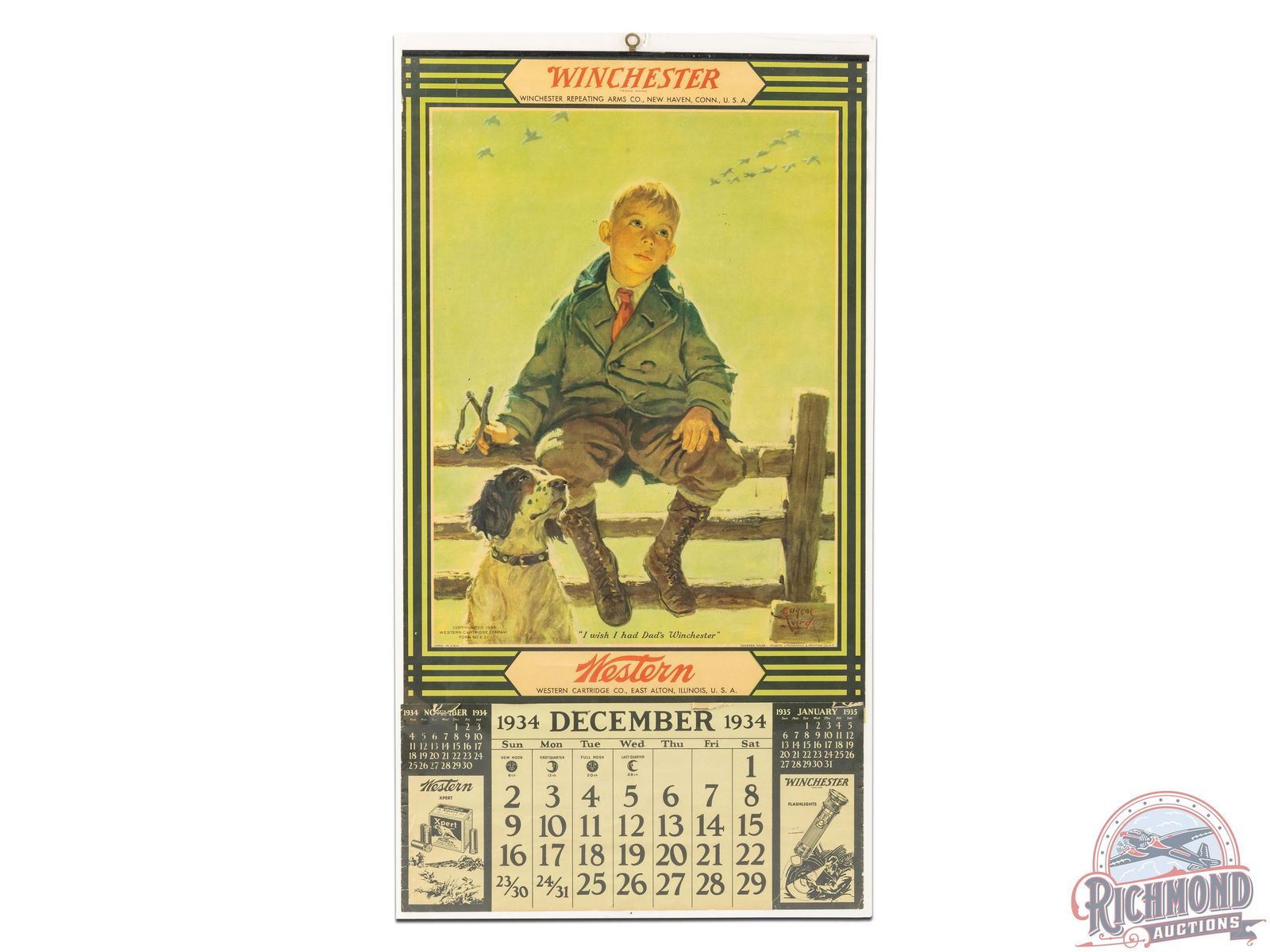 Iconic lithograph paper advertising calendar sign featuring a boy sitting on a fence with his slingshot and English Setter by renowned artist Eugene Iverd. The calendar is in very good condition overall with only minor creases and a few tiny spots of paper loss. The pad shows December and features an ad for Winchester flashlights and Xpert shotgun shells. More wear and tear to the pad, mostly along the edges. Includes only the top band. Shrink wrapped and secured to foam board. Marked Copyrighted 1934 Western Cartridge Company Form No E21 on left and Illustra Color - Atlantic Lithographic & Printing Co NY on right. 27.75" H x 15.25" W.
