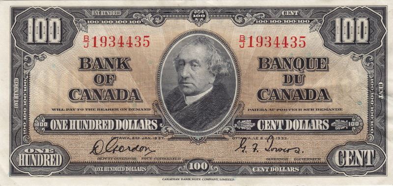 1937 Bank Of Canada $100 Bank Note - Gordon/Towers