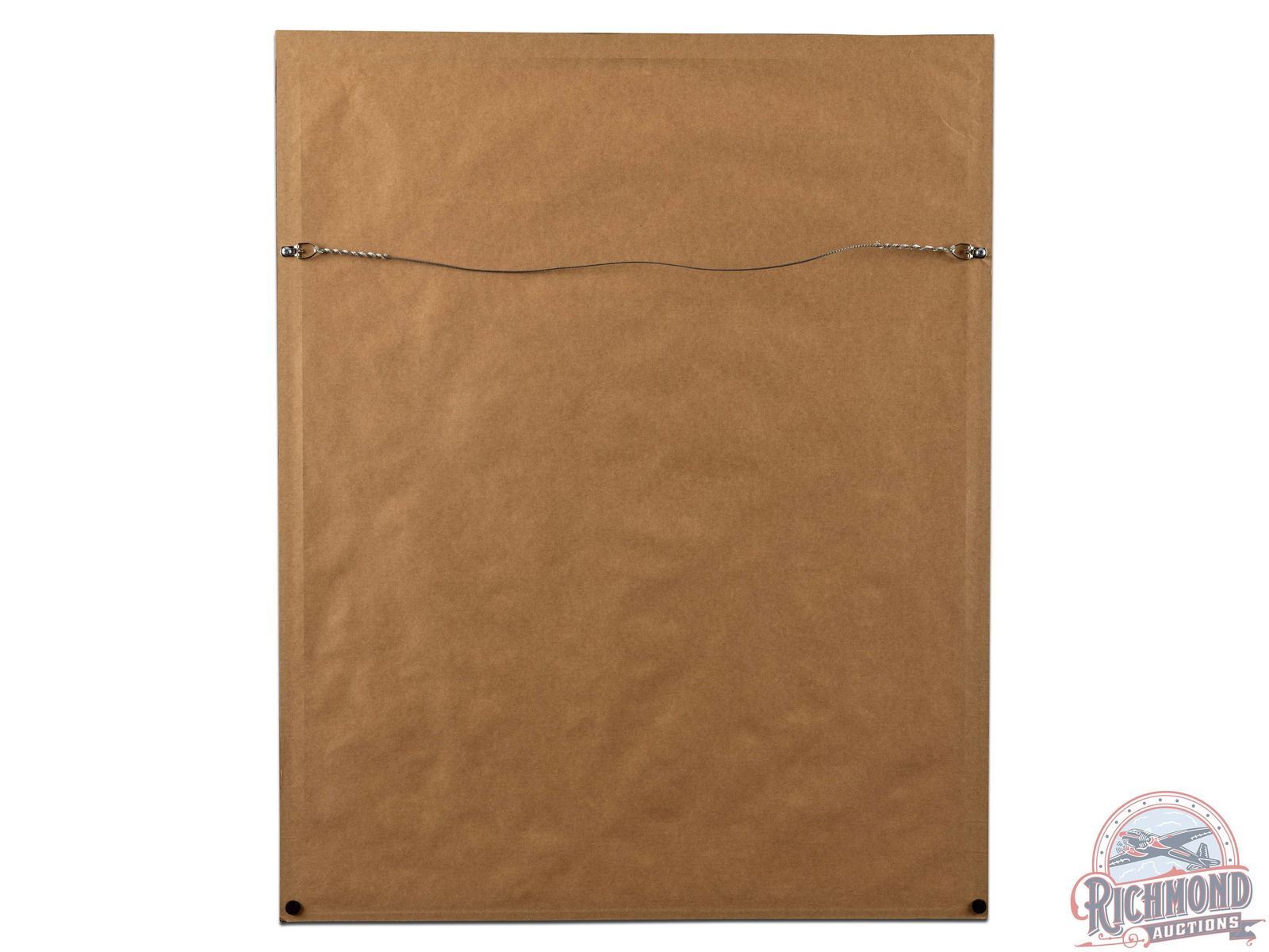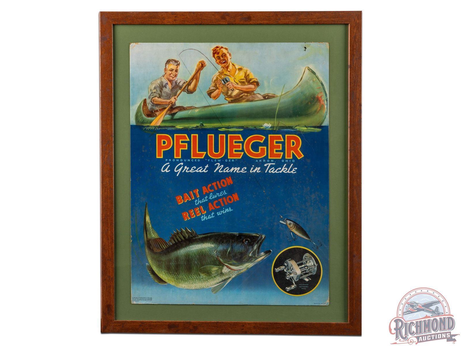 Circa 1940's. Very nice cardboard easel back counter top sign with great graphics, featuring a father and son fishing on a canoe, a largemouth bass about to strike and a Supreme model reel. Exhibits excellent color with general age and storage wear including two creases in the right of the canoe, corner wear and discoloration/spotting in the top right corner. The dark blue has spotting throughout as well. Professionally framed and behind glass. Sign measures 26" H x 19.5" W. Marked Copyright 1946 Enterprise Mfg. Co. Akron Ohio, Litho USA Form No. 707. 31.75" H x 25.5" W.