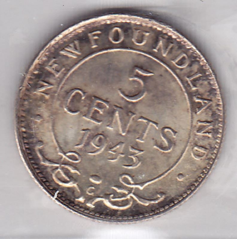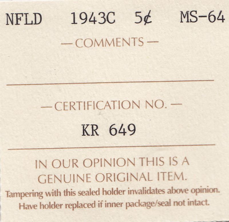 1943-C Newfoundland Canada Silver 5-Cent Coin - Graded By ICCS MS-64 -- Book Value $150 (KR 649)