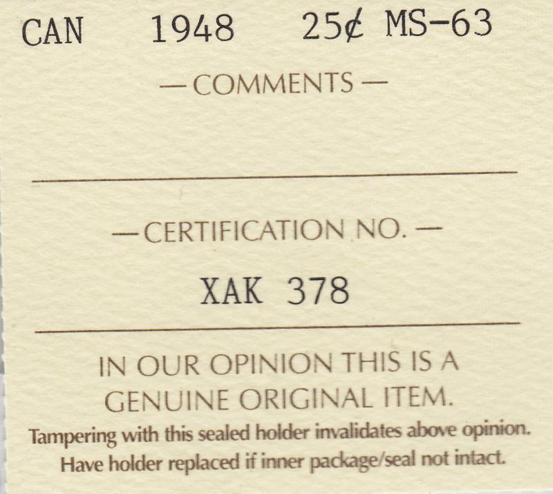 1948 Canadian Silver 25-Cent Quarter Coin - Graded By ICCS MS-63 - Book Value $150 (XAK 378)