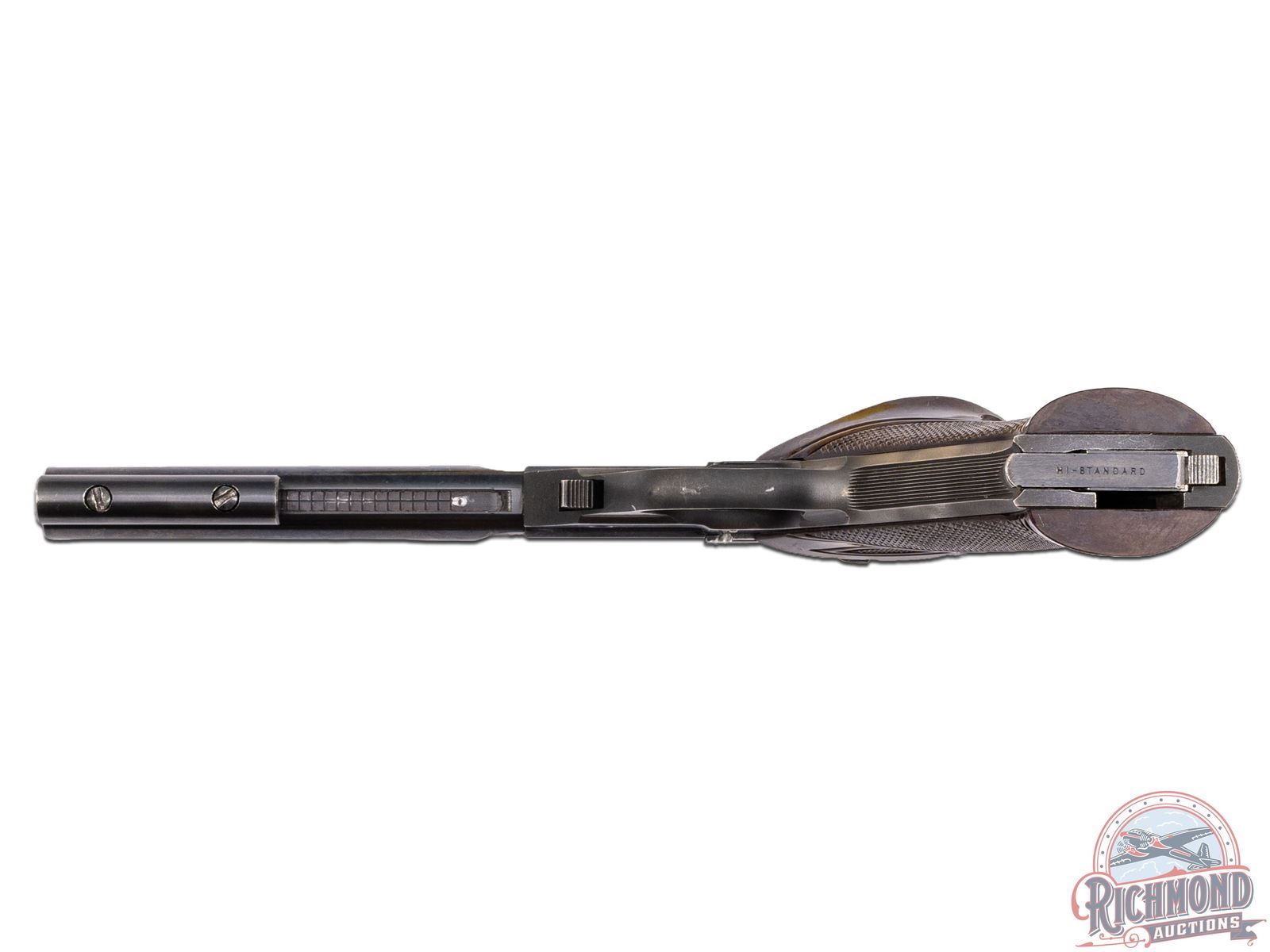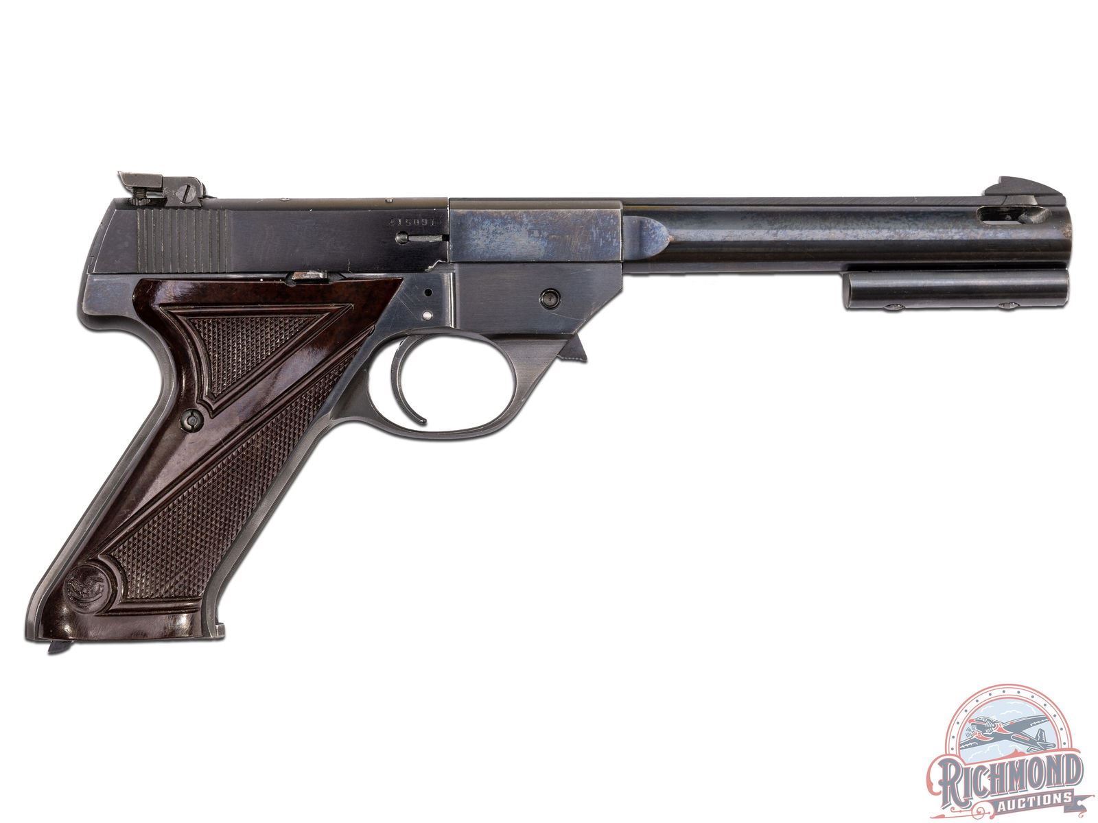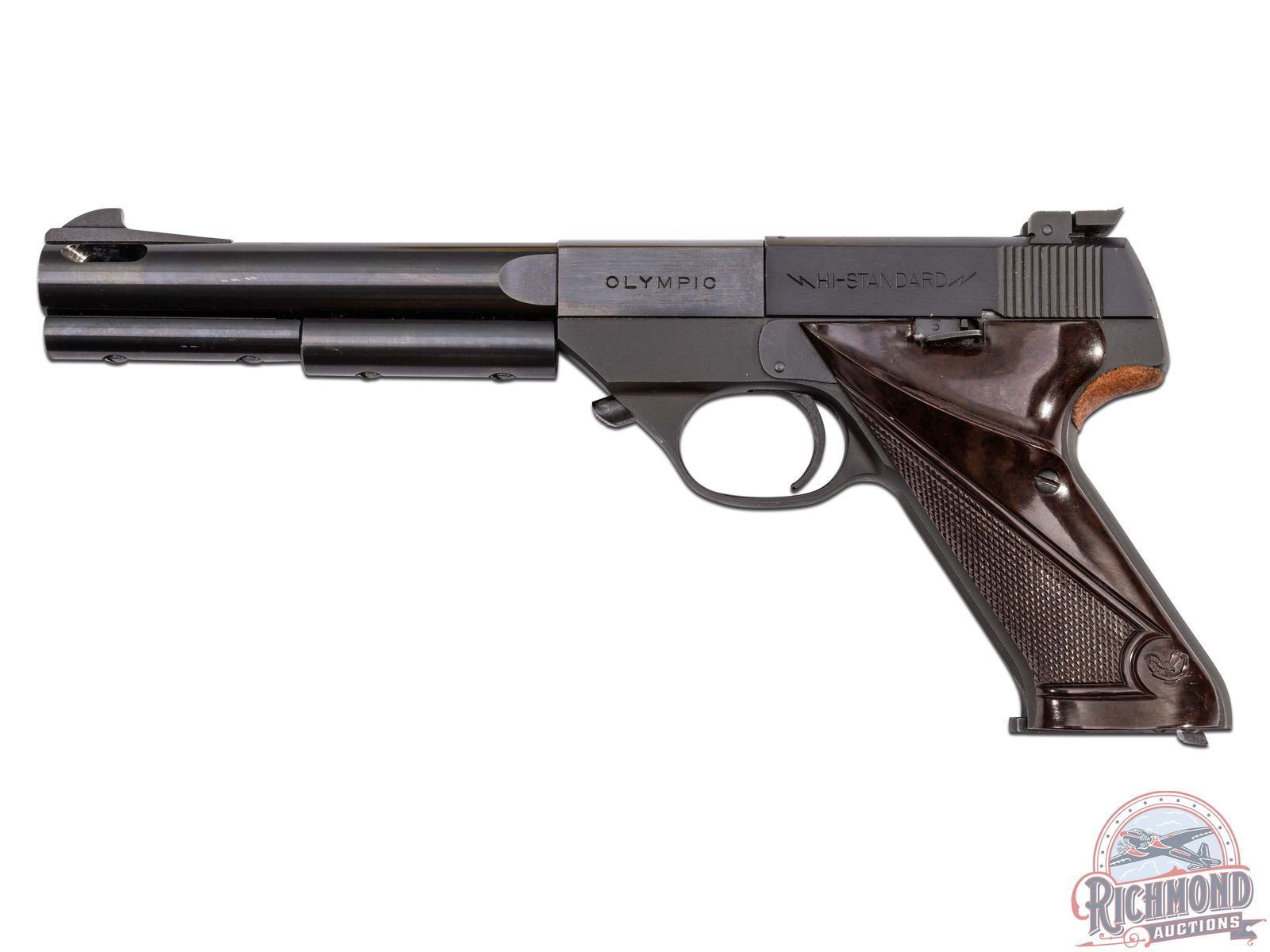 Manufactured in 1952. This great target pistol features a 6-3/4" blued ported barrel with a factory weight. Rear adjustable notch sight and ramped blade front sight. Left side of the slide is stamped with the two-line High Standard address and "OLYMPIC". Left side of the frame above the trigger guard is stamped "CAL.22 SHORT". Right side of the slide is stamped with the serial number. Grooved front and back grip straps. Fitted with factory brown checkered synthetic target style grips with right hand thumb rest. Includes factory 10 round magazine. CALIBER: 22 SHORT. S/N: 415091. FFL STATUS: Curio & Relic.