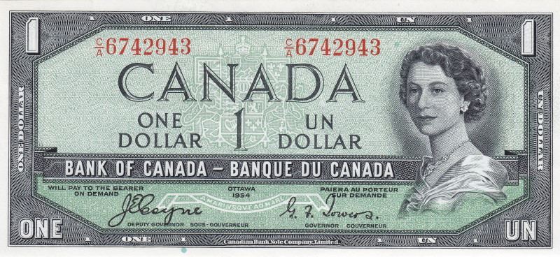 1954 Bank Of Canada $1 Devil's Face Bank Note - Coyne/Towers Signatures - C/A Serial - Book Value $175