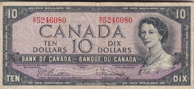 1954 Bank Of Canada $10 Bank Note - Beattie/Rasminsky - S/T Serial - Modified Portrait - Book Value $15