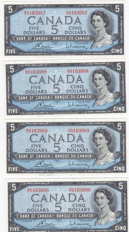 4 Consecutive 1954 Bank Of Canada $5 Bank Notes - Mis-Cut - S/X Series - Bouey/Rasminsky Signatures - Book Value $200