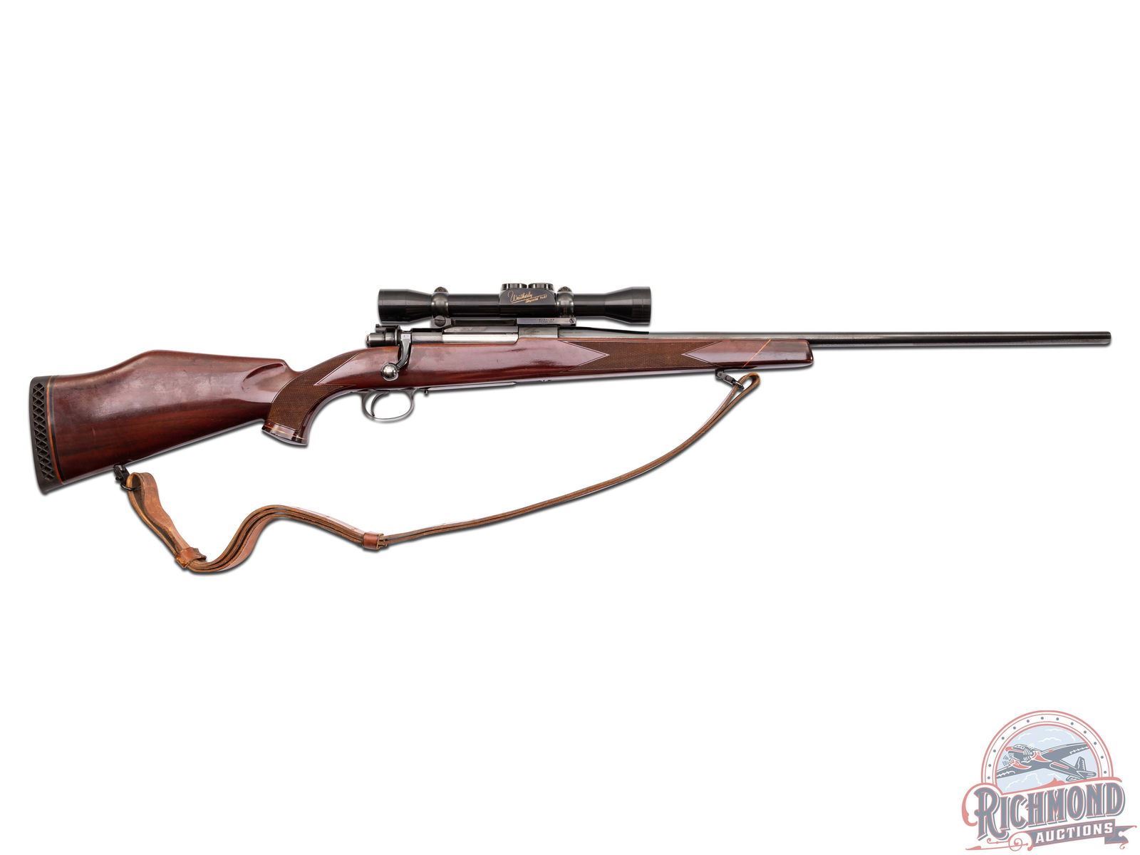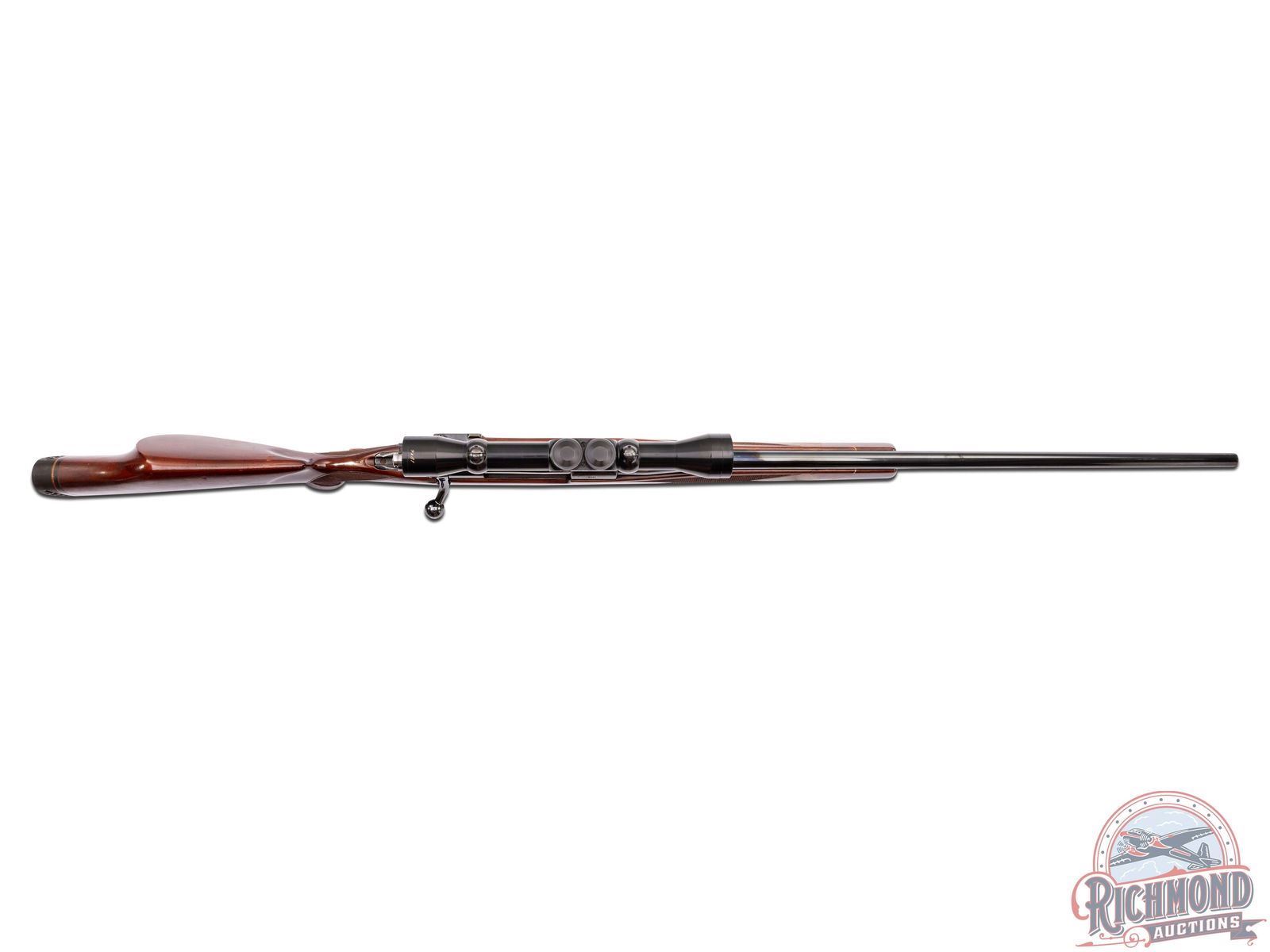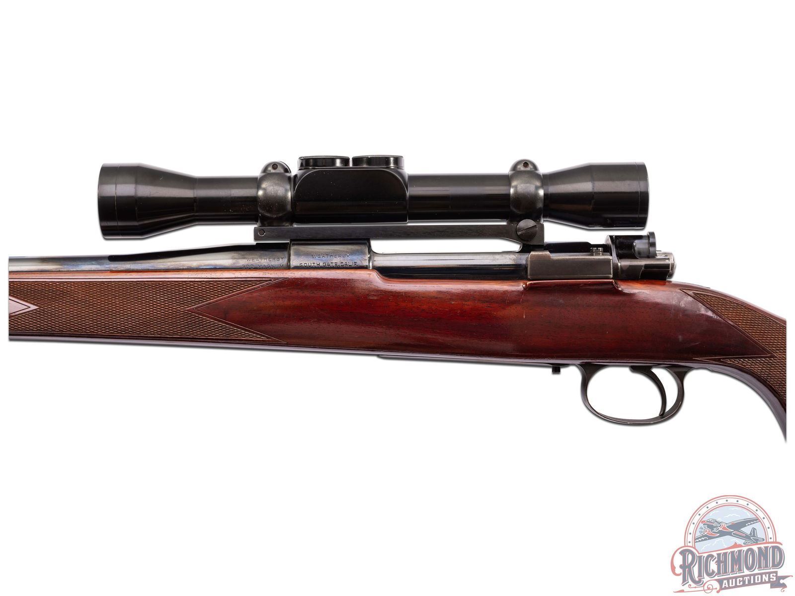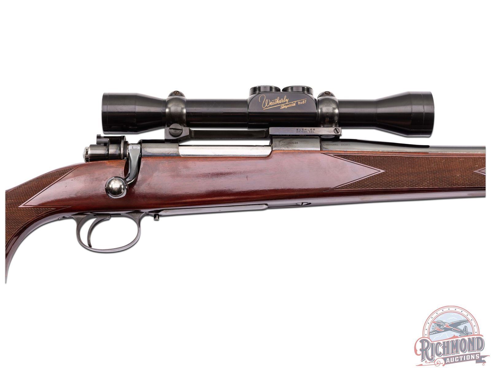 Manufactured in 1954, an early American made four digit Weatherby. Features a 24" blued sightless barrel stamped "CHROME BORE". FN Supreme Mauser action stamped Weatherby South Gate, Calif, safety lever has been removed. Action is fitted with a factory Weatherby Imperial 4x81 scope. Standard Mauser left side bolt release. Stock is a single piece right hand Monte Carlo walnut with white lined forearm tip, and slightly exaggerated pistol grip. Hand-checkered, 18 LPI forearm and pistol grip. Bottom of pistol grip is rosewood with a lighter rosewood diamond inlay. butt stock fitted with a factory "Weatherby's Tomorrows Rifle Today" ventilated recoil pad. Equipped with swivel rings and an adjustable military style leather sling. LOP: 13-1/4". CALIBER: 300 WBY MAG. S/N: 2681. FFL STATUS: Curio & Relic.