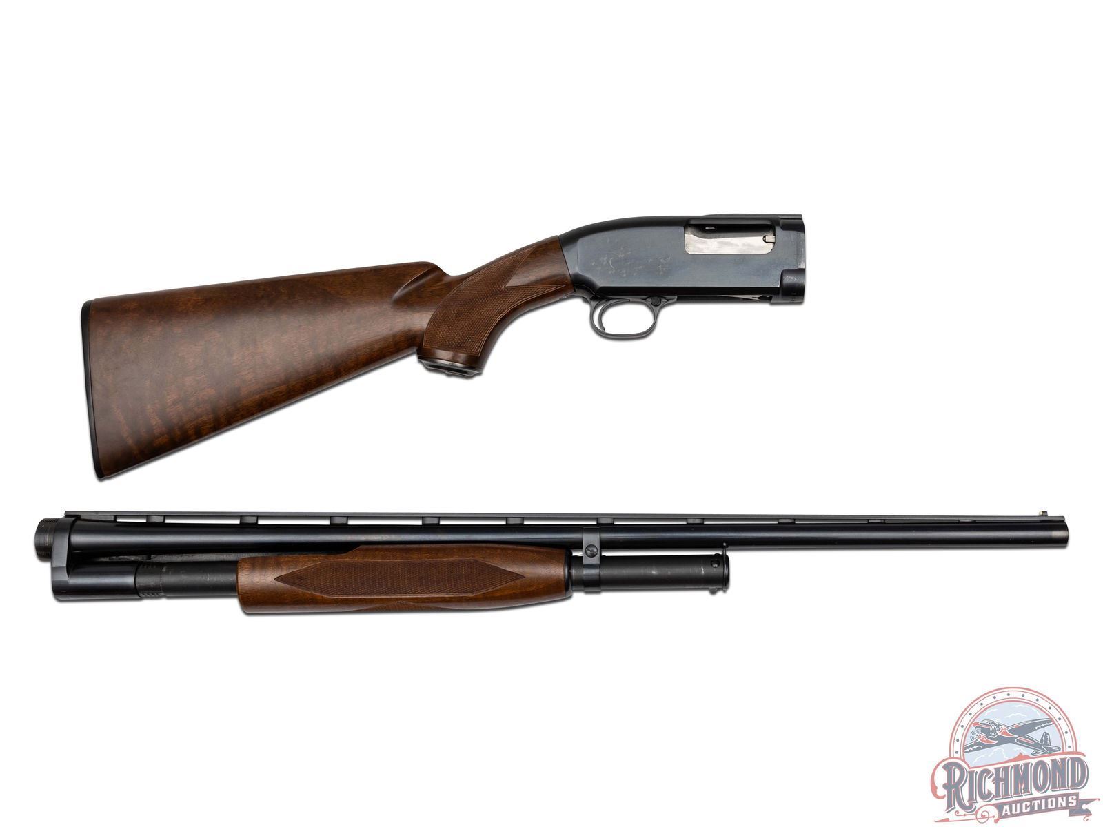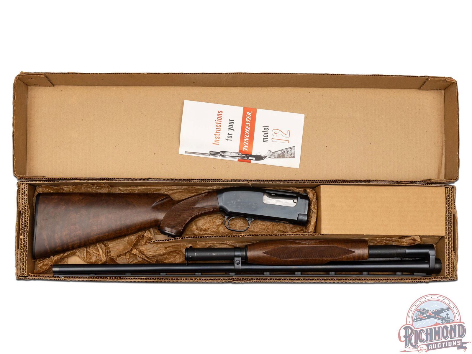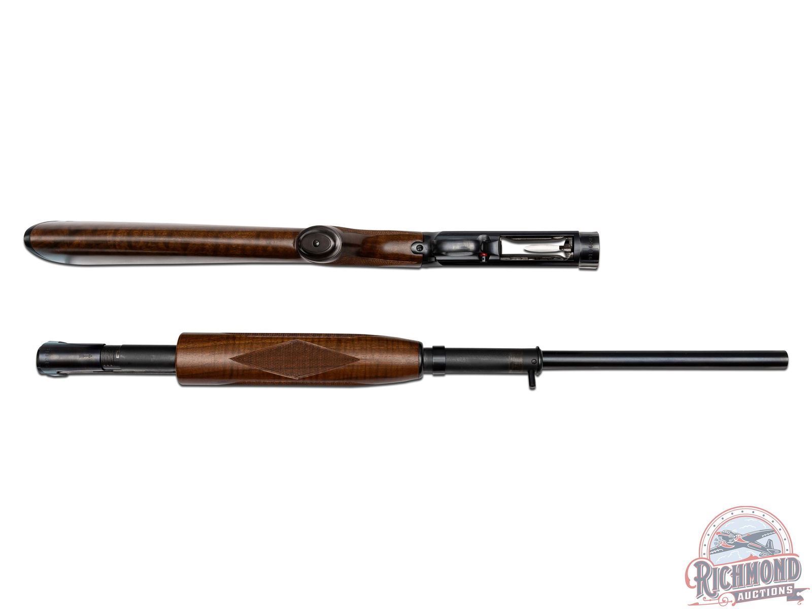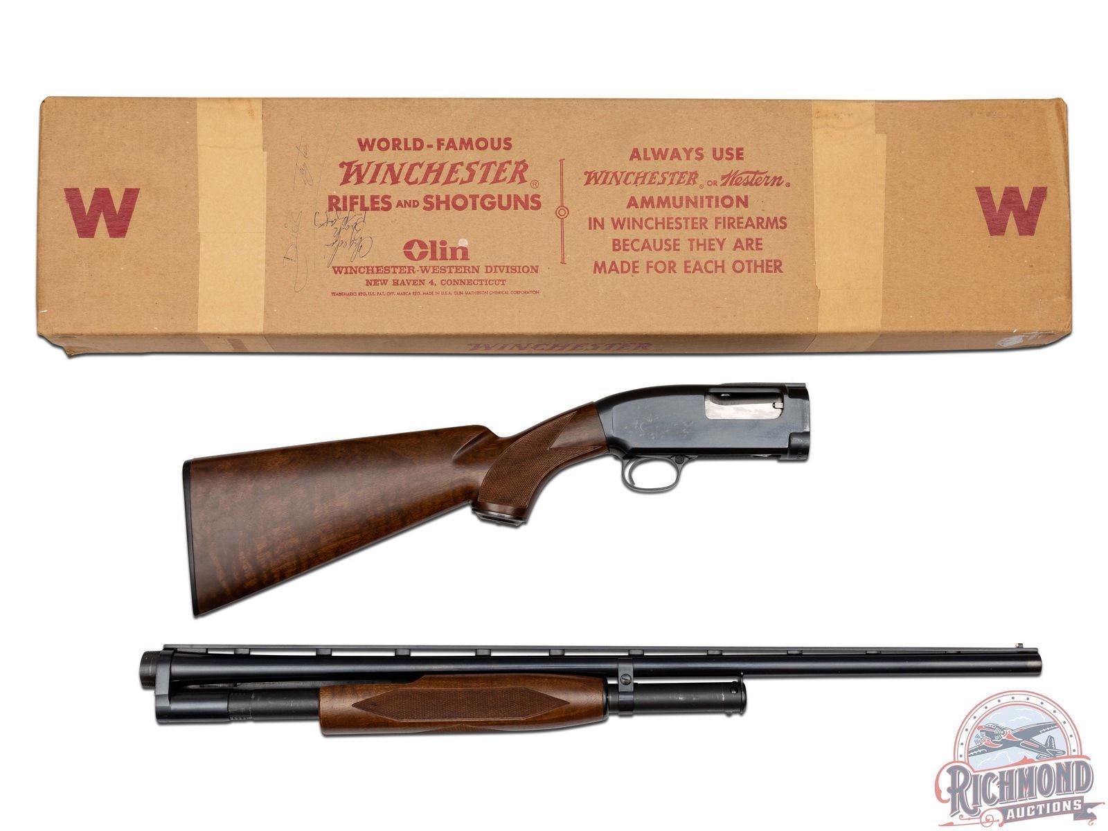 This deluxe perfect repeater shotgun was manufactured in 1959. Features a 28" blued vent rib barrel chambered for 2-3/4" shells with Full choke. All standard Winchester stampings and proof marks. White bead front sight and crossbolt safety. High grade checkered walnut wood stock and matching foregrip, fitted with a Winchester logo checkered synthetic butt plate. Comes in the original factory box with original factory instruction manual. LOP: 13-3/4". DAC: 1". DAH: 1-3/4". CALIBER: 20 GA. S/N: 1849616. FFL STATUS: Curio & Relic.