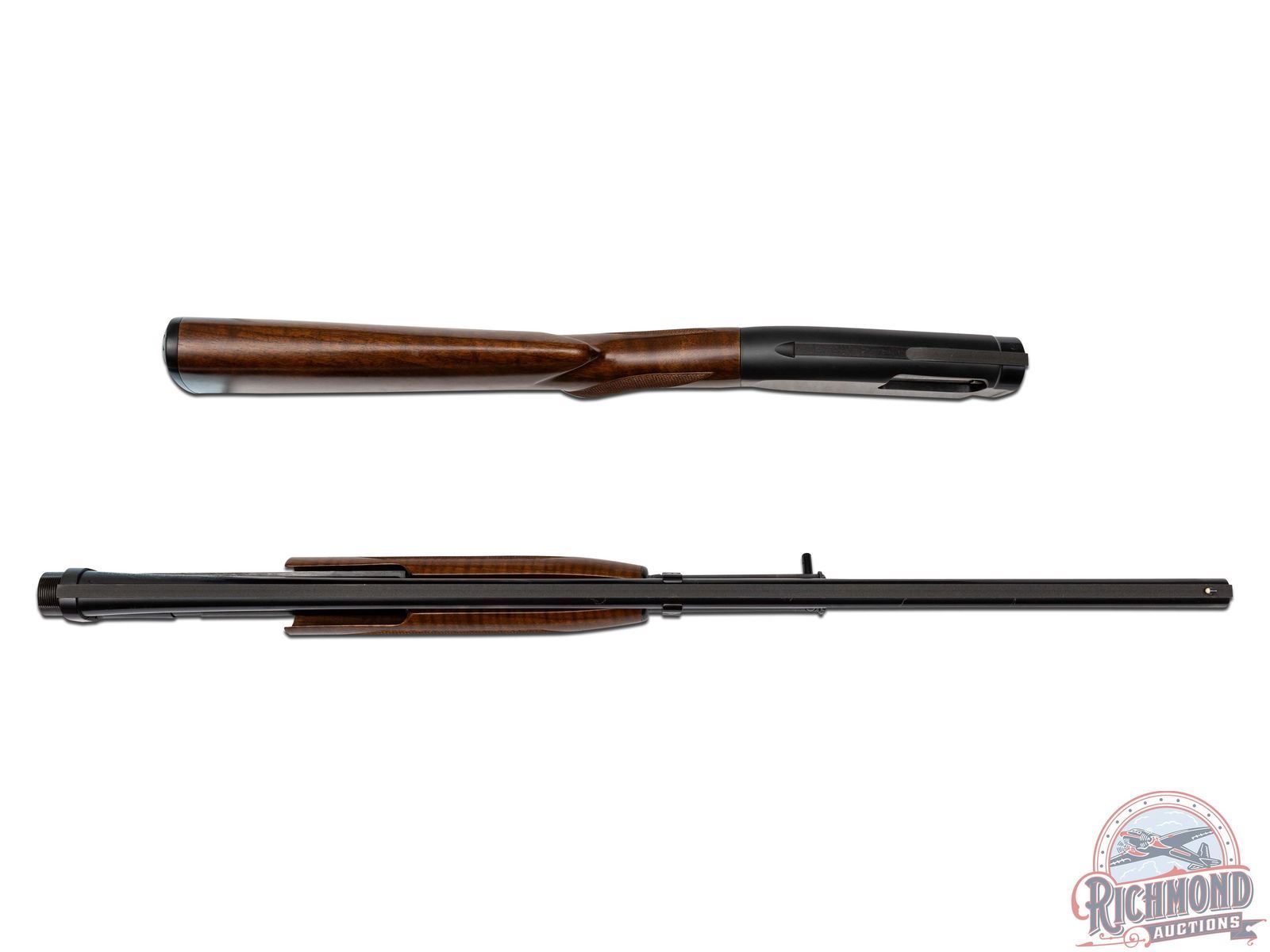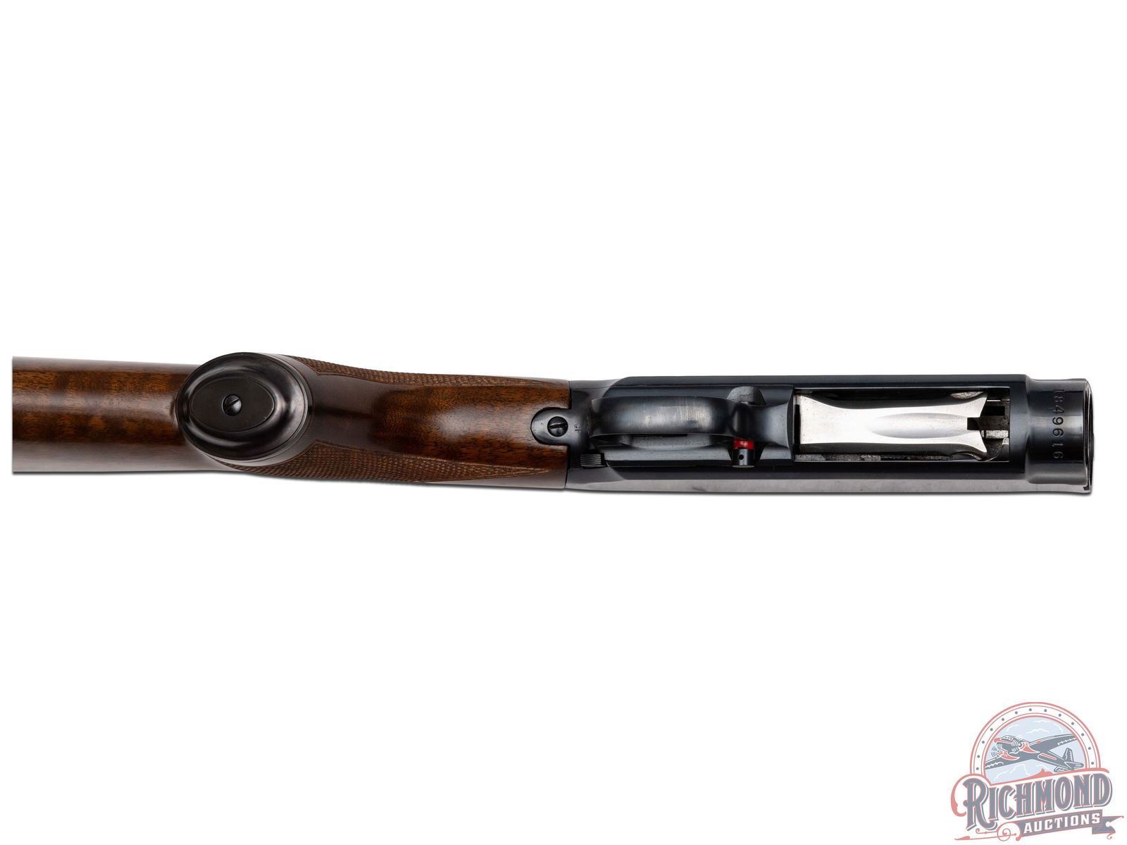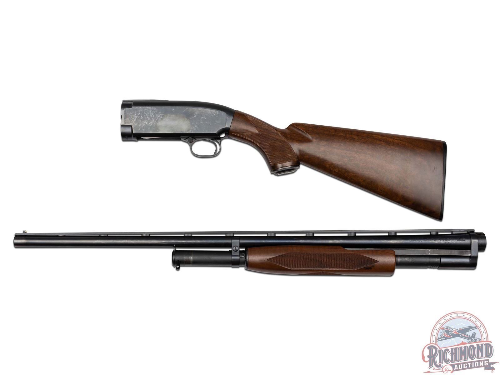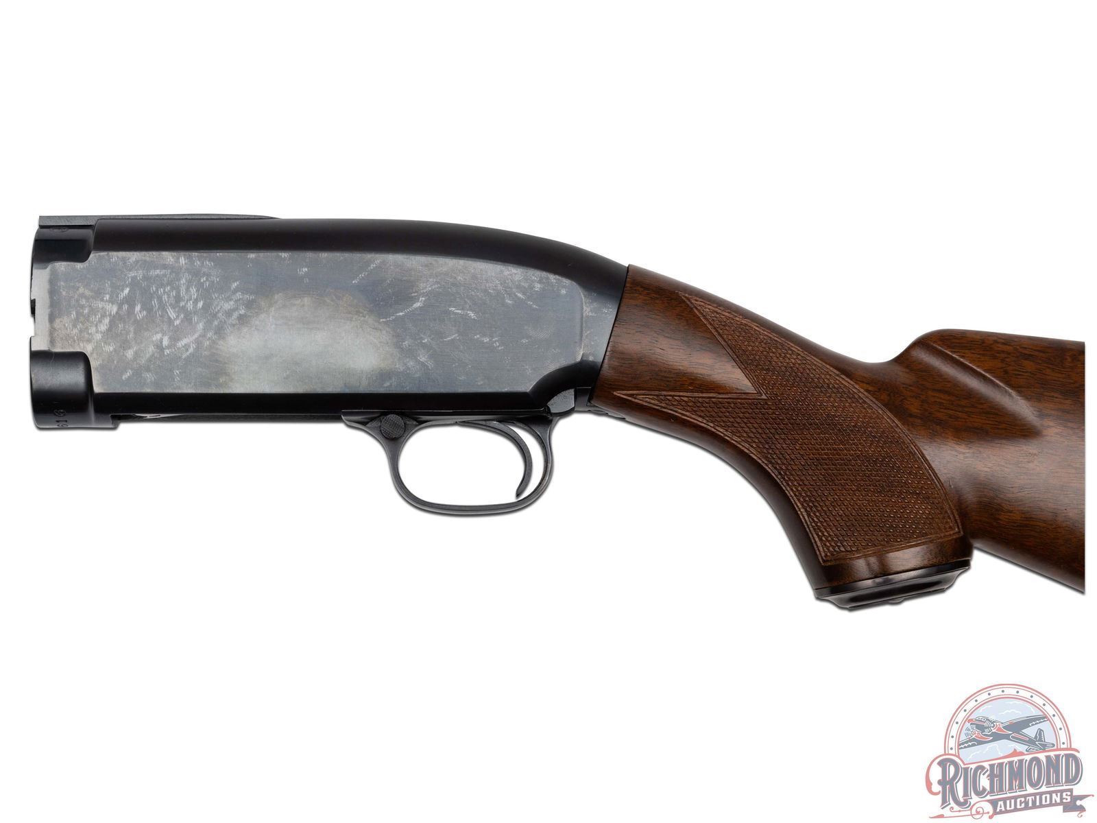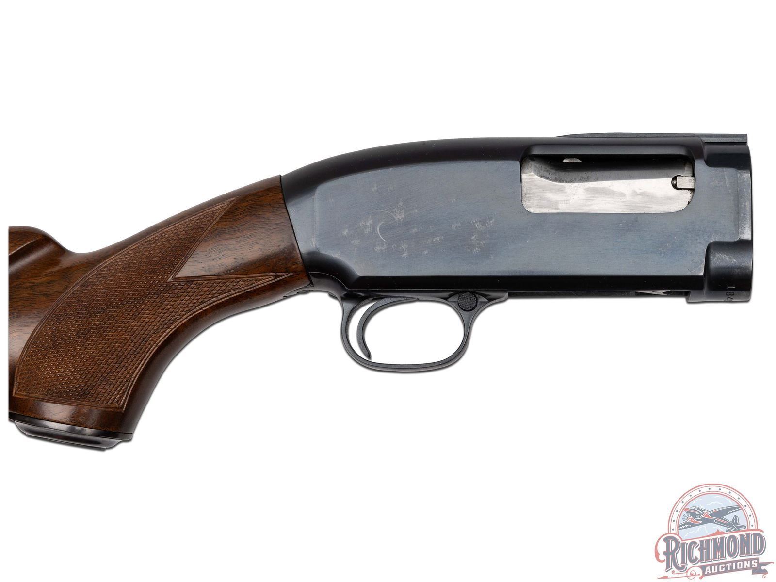 This deluxe perfect repeater shotgun was manufactured in 1959. Features a 28" blued vent rib barrel chambered for 2-3/4" shells with Full choke. All standard Winchester stampings and proof marks. White bead front sight and crossbolt safety. High grade checkered walnut wood stock and matching foregrip, fitted with a Winchester logo checkered synthetic butt plate. Comes in the original factory box with original factory instruction manual. LOP: 13-3/4". DAC: 1". DAH: 1-3/4". CALIBER: 20 GA. S/N: 1849616. FFL STATUS: Curio & Relic.