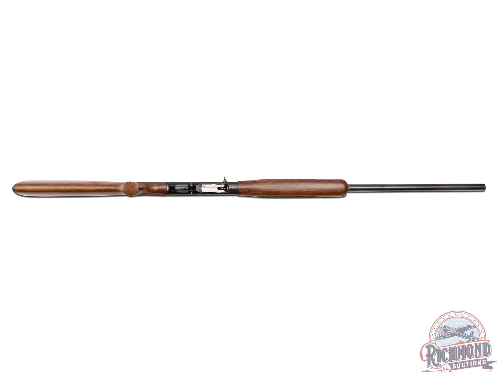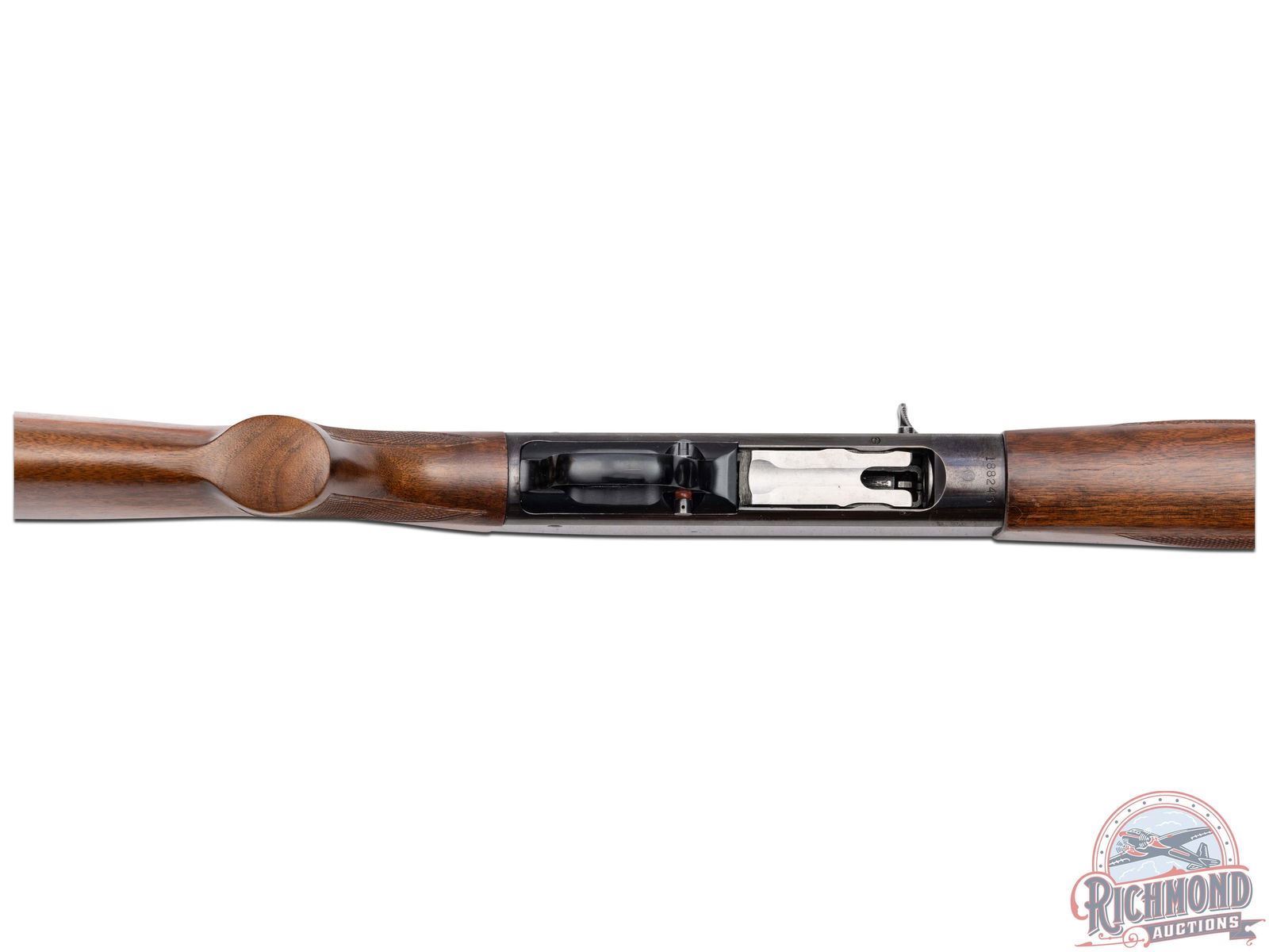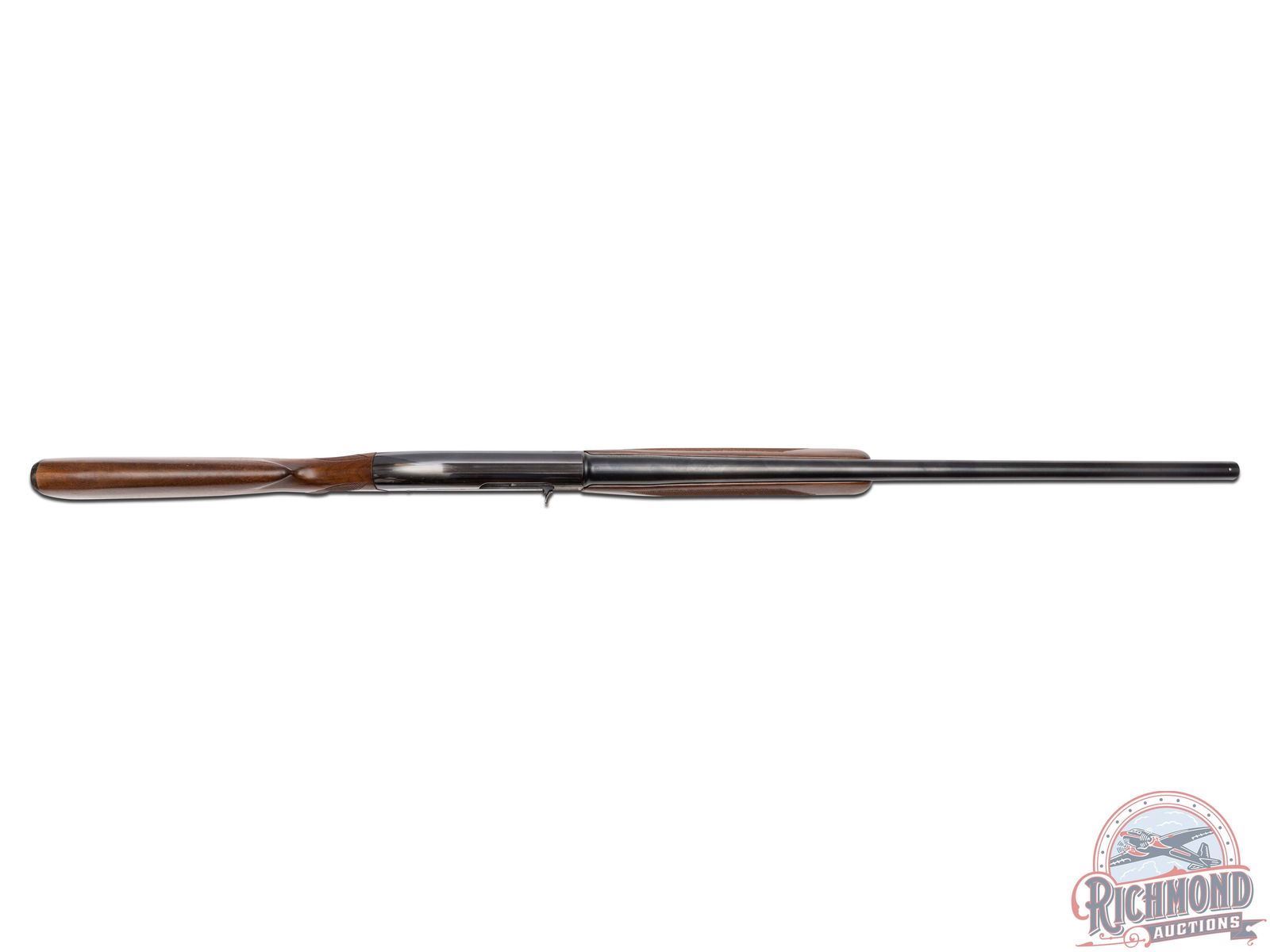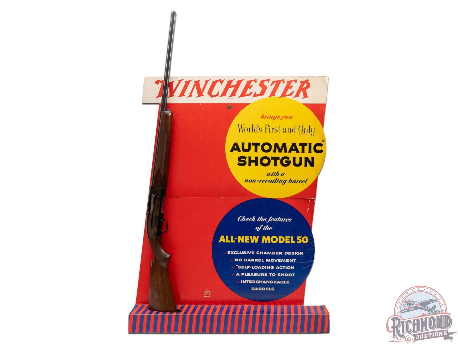 Manufactured in 1961. Features a 28" blued round barrel chambered for 2-3/4" shells with Modified choke. Nickel bead front sight and all the correct Winchester stampings. Blued receiver and crossbolt safety. Straight grain walnut wood stock and trap style forearm. Hand-checkering on pistol grip and both sides of the forearm. Fitted with a factory Winchester checkered butt plate. Advertising cardboard stand made by Olin for Winchester measures 39" tall and 29" wide. Colorful display lists features of the "All-New Model 50" and has a slot in the base for the shotgun to stand in. LOP: 13-3/4". DAC: 1-1/2". DAH: 2". CALIBER: 12 GA. S/N: 188245. FFL STATUS: Curio & Relic.