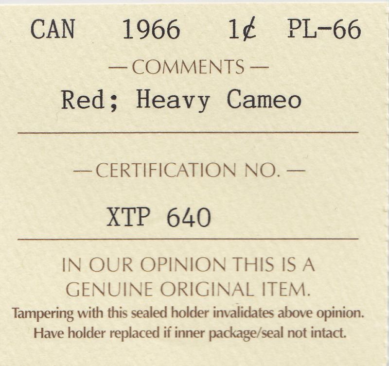 1966 Canadian Small Cent Penny Coin - Graded By ICCS PL-66 -- Book Value $45 (XTP 640)