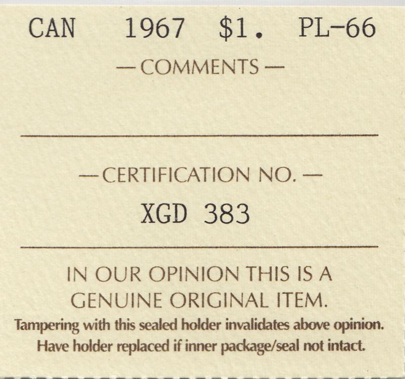 1967 Canadian Silver $1 Dollar Coin - Graded By ICCS - PL-66 -- Book Value $200 (XGD 383)