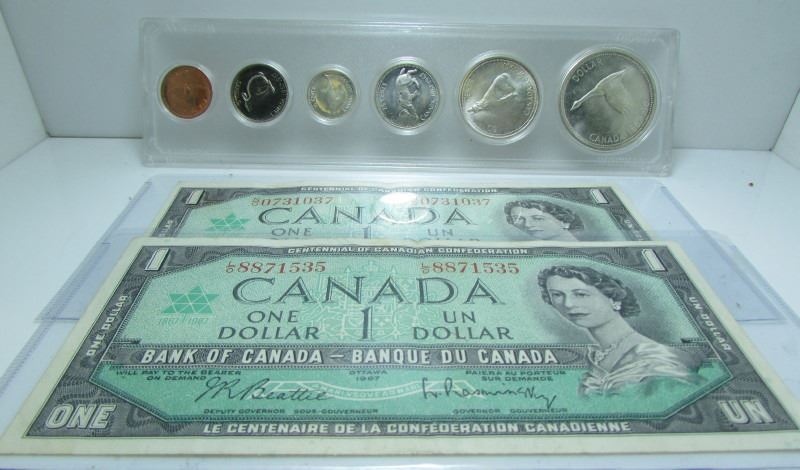 1967 Canadian Currecny Collection - 2 Bank Of Canada Notes & 1 Full Coin Set