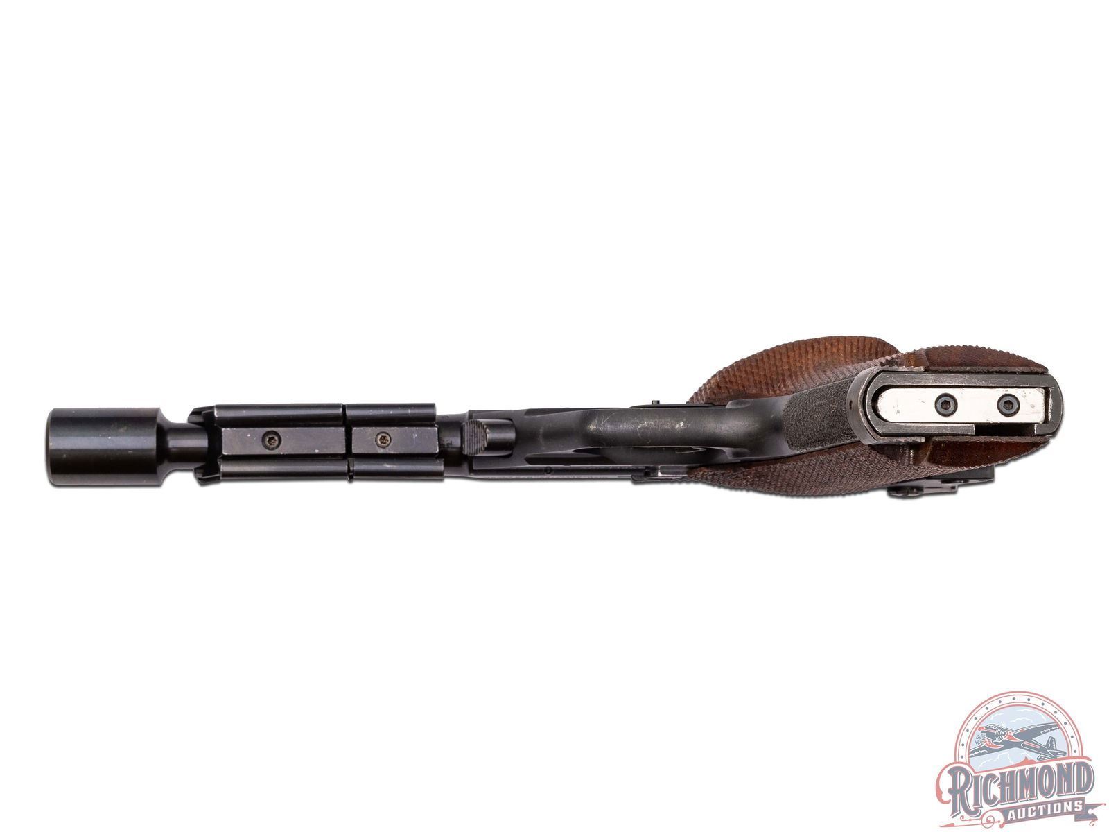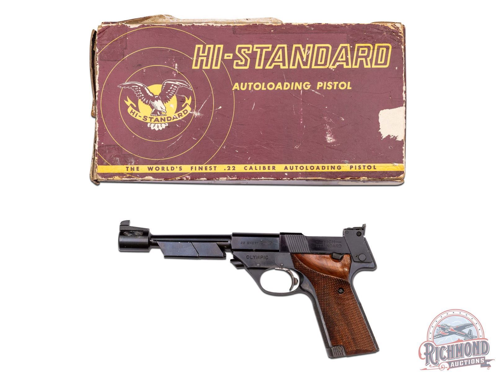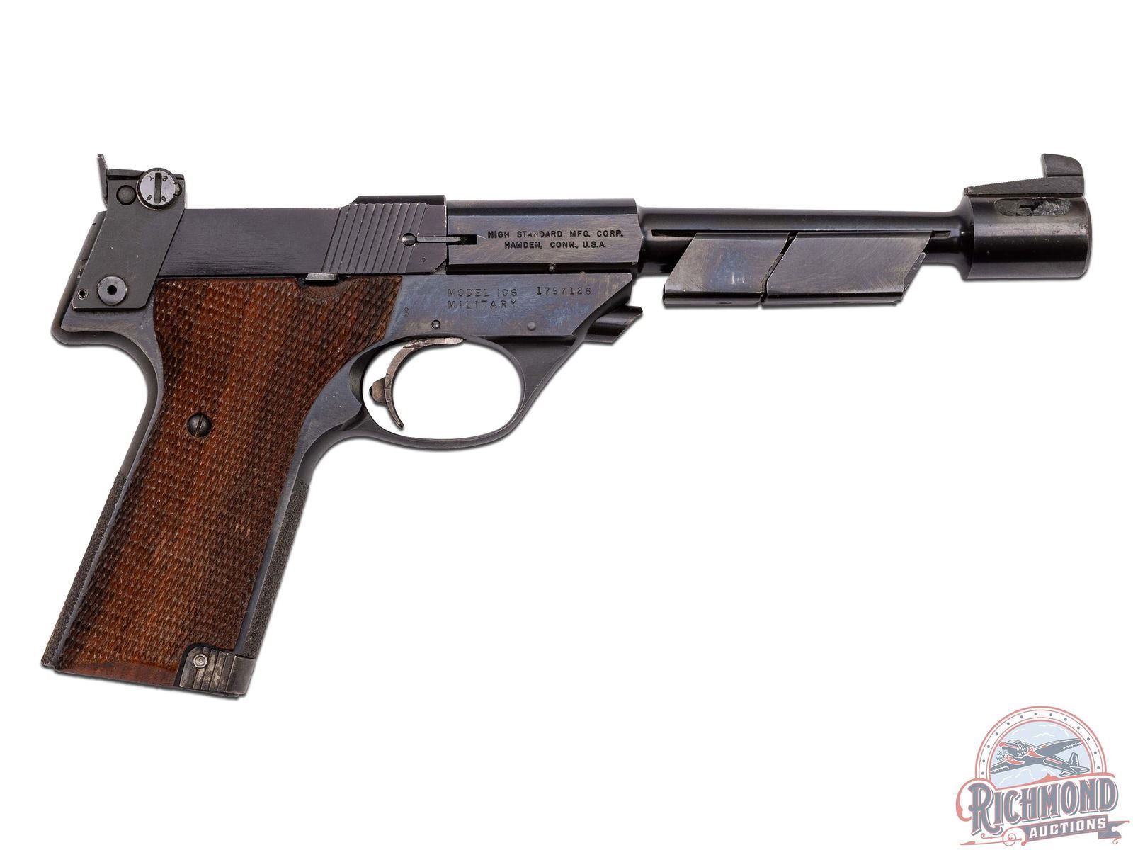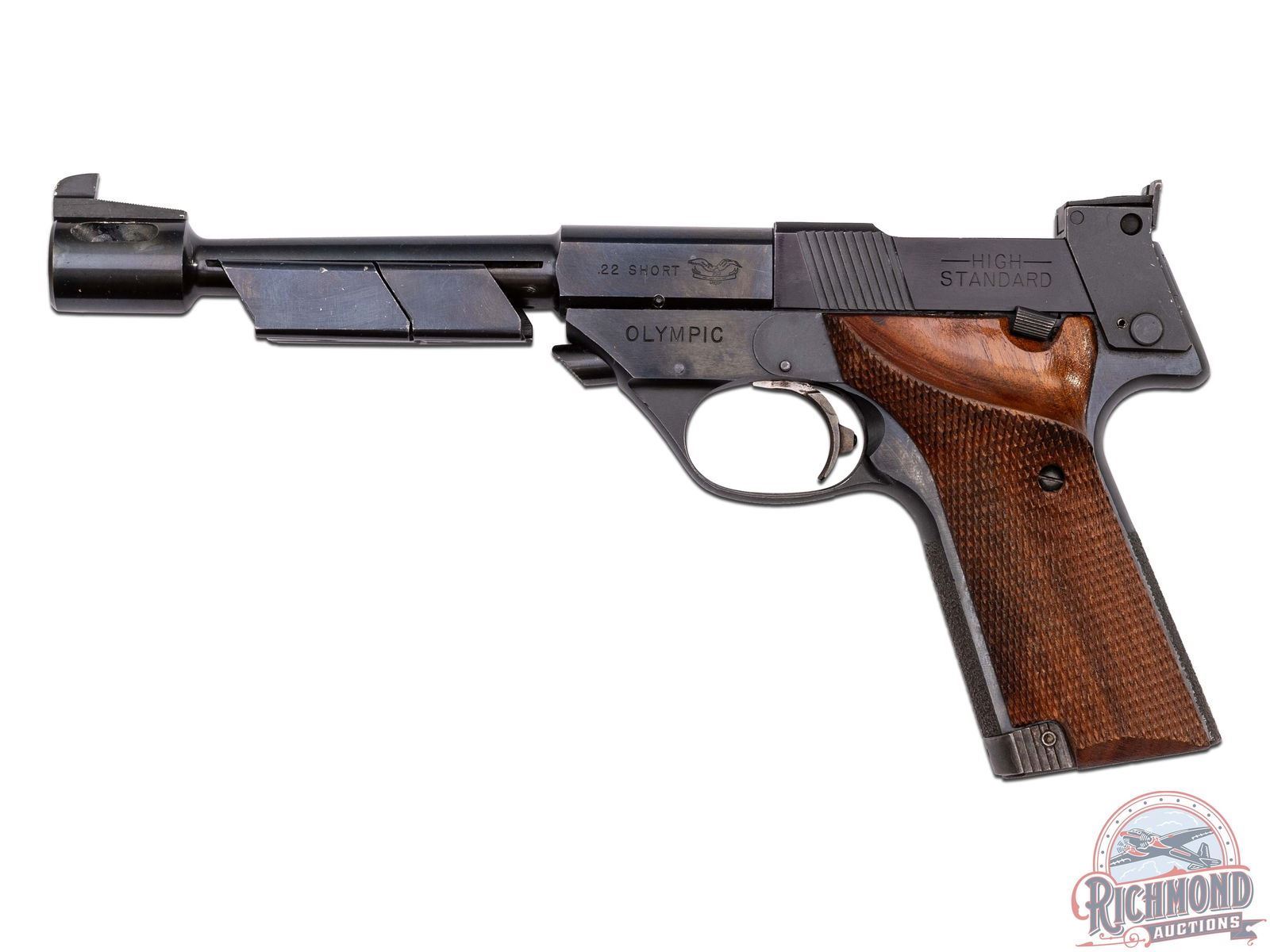 Manufactured in 1967. This great target pistol features a 6-3/4" tapered blued barrel with 2oz and 3oz adjustable weights and an enlarged muzzle-brake. Frame mounted rear adjustable notch sight and ramped blade front sight. Left side of the slide is stamped ".22 SHORT" with the Eagle logo and "- HIGH - / STANDARD". Left side of the frame is stamped "OLYMPIC". Right side of the slide is stamped with the two-line High Standard address, with "MODEL 106 / MILITARY" and serial number stamped on the frame below. Fitted with walnut checkered target style grips with right hand thumb rest. Stippled front and rear grip straps. Includes a 10 round magazine and factory box. CALIBER: 22 SHORT. S/N: 1757126. FFL STATUS: Curio & Relic.