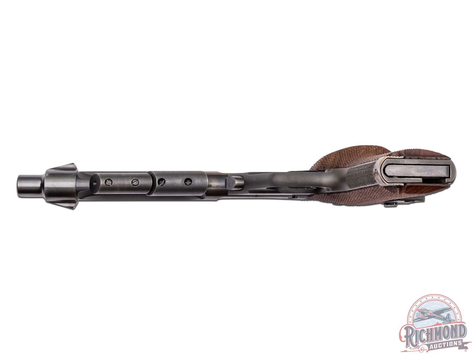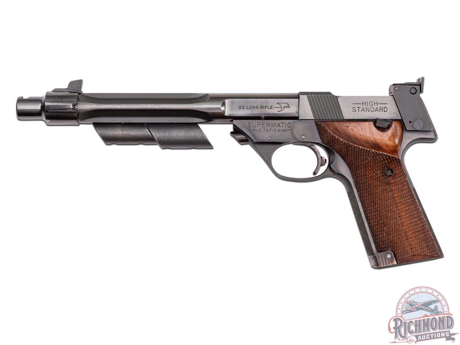 Manufactured in 1969. This great target pistol features a 7-3/4" fluted blued barrel with 2oz and 3oz adjustable weights and an enlarged register at muzzle end to hold a removable muzzle-brake. Rear adjustable notch sight mounted on rear of the frame and ramped blade front sight. Left side of the slide is stamped ".22 LONG RIFLE" with the Eagle logo and "HI-STANDARD". Left side of the frame is stamped "SUPERMATIC / >CITATION<". Right side of the slide is stamped with the two-line High Standard address, and "MODEL 107 / MILITARY" and serial number stamped on the frame below. Matching serial number stamped on top of the slide. Stippled grip straps. Fitted with factory walnut checkered target grips with right hand thumb rest. case-hardened trigger and mag release. Includes a 10-round magazine. CALIBER: 22LR. S/N: 2185270. FFL STATUS: Curio & Relic.