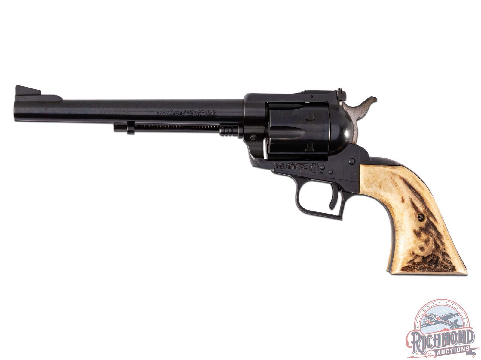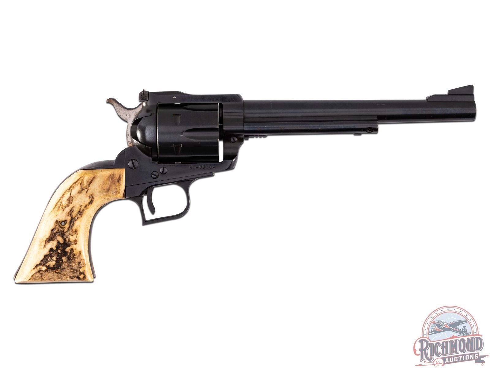 Manufactured in 1969, only the second year of production for the Blackhawk 30 Carbine. Features a 7-1/2" blued barrel with ramp blade front sight and rear adjustable notch sight. Left side of the barrel is stamped "STURM, RUGER & CO / SOUTHPORT, CONN. U.S.A." with the Ruger Phoenix logo. Blued receiver and 6 round fluted cylinder. Left side of the frame is stamped "RUGER SUPER BLACKHAWK / 30 CARBINE CAL". Fitted with nice Stag grips. CALIBER: 30 Carbine. S/N: 50-00104. FFL STATUS: Curio & Relic.