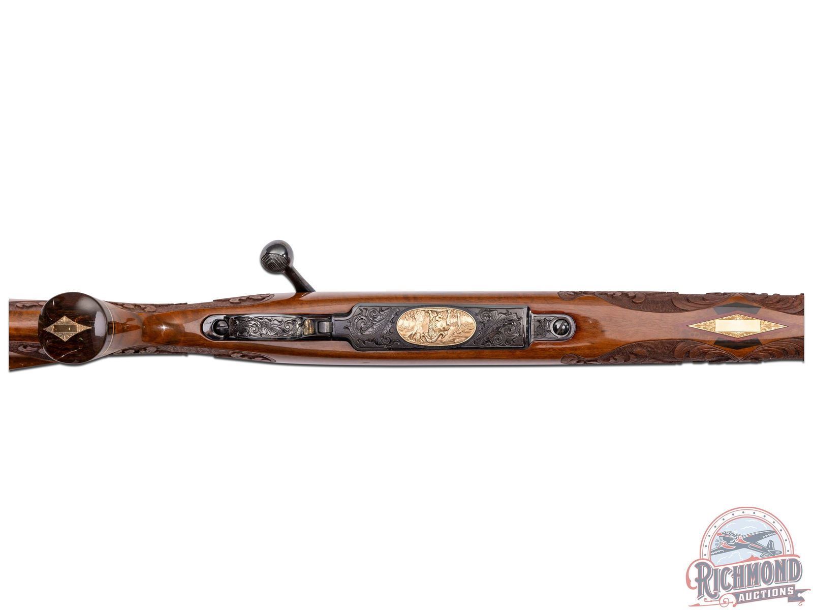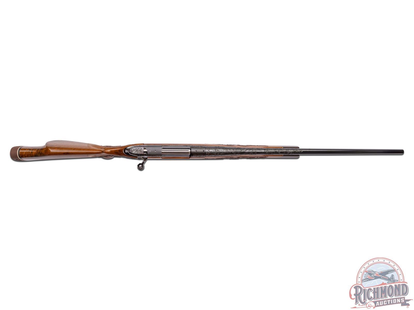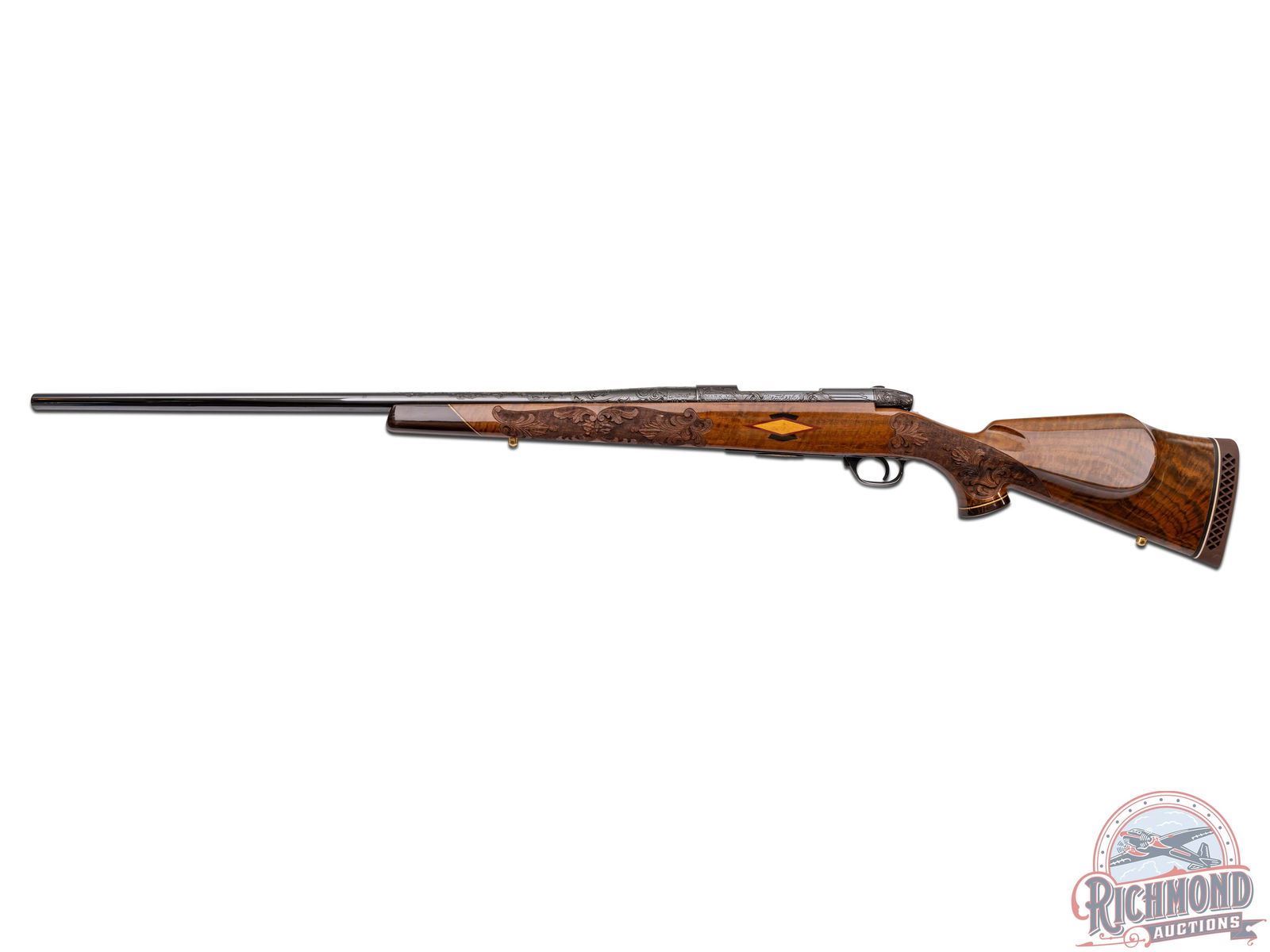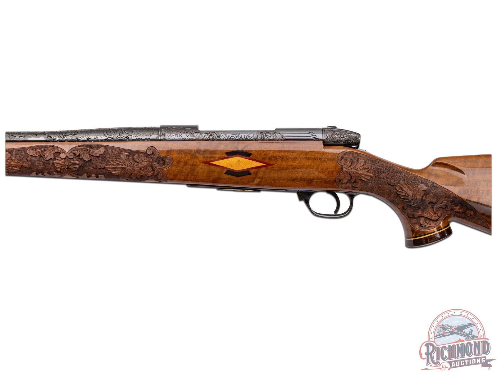 Custom made in West Germany in 1969 and South Gate custom shop engraved. Features a 26" blued sightless tapered barrel. Barrel has 40% coverage featuring floral scroll engraving that extends 11" from receiver. Receiver has matching engraving with 80% coverage. Top of the receiver is drilled for scope mounts. Blued floorplate has 85% coverage with a gold embossed oval featuring a water buffalo in the African Serengeti scene. Two position safety with jeweled bolt and follower and knurled bolt knob. Engraved trigger guard with serrated trigger. Heavy grain factory Weatherby walnut Monte Carlo style stock with contrasting Rosewood forearm tip and pistol grip cap. Pistol grip features a gold engraved diamond shaped inlay. Deep relief factory carved stock featuring a floral scroll pattern with punch dot background. Bottom of foregrip and both sides of the receiver feature a diamond tri-wood inlay consisting of bony, rosewood and birch. Bottom of the forearm inlay features a gold engraved inlaid plate. Right side of the stock has a larger scale diamond tri-wood inlay. Factory gold plate sling studs. Fitted with a Weatherby brown ventilated recoil pad. Includes Weatherby factory paperwork stating upgrades done in 1988 totaling over $3,500. LOP: 13-1/2". CALIBER: 378 WBY MAG. S/N: P34723. FFL STATUS: Curio & Relic.