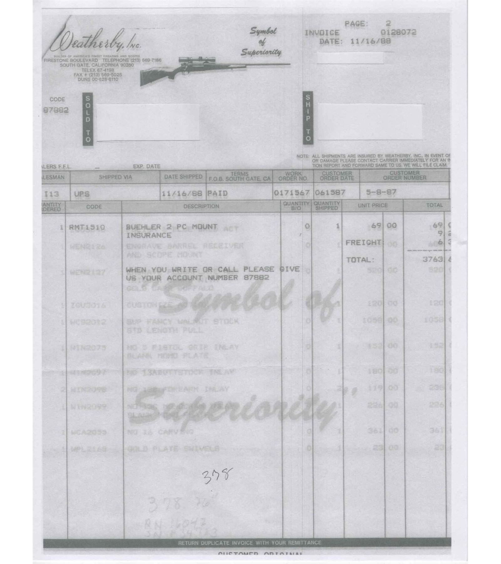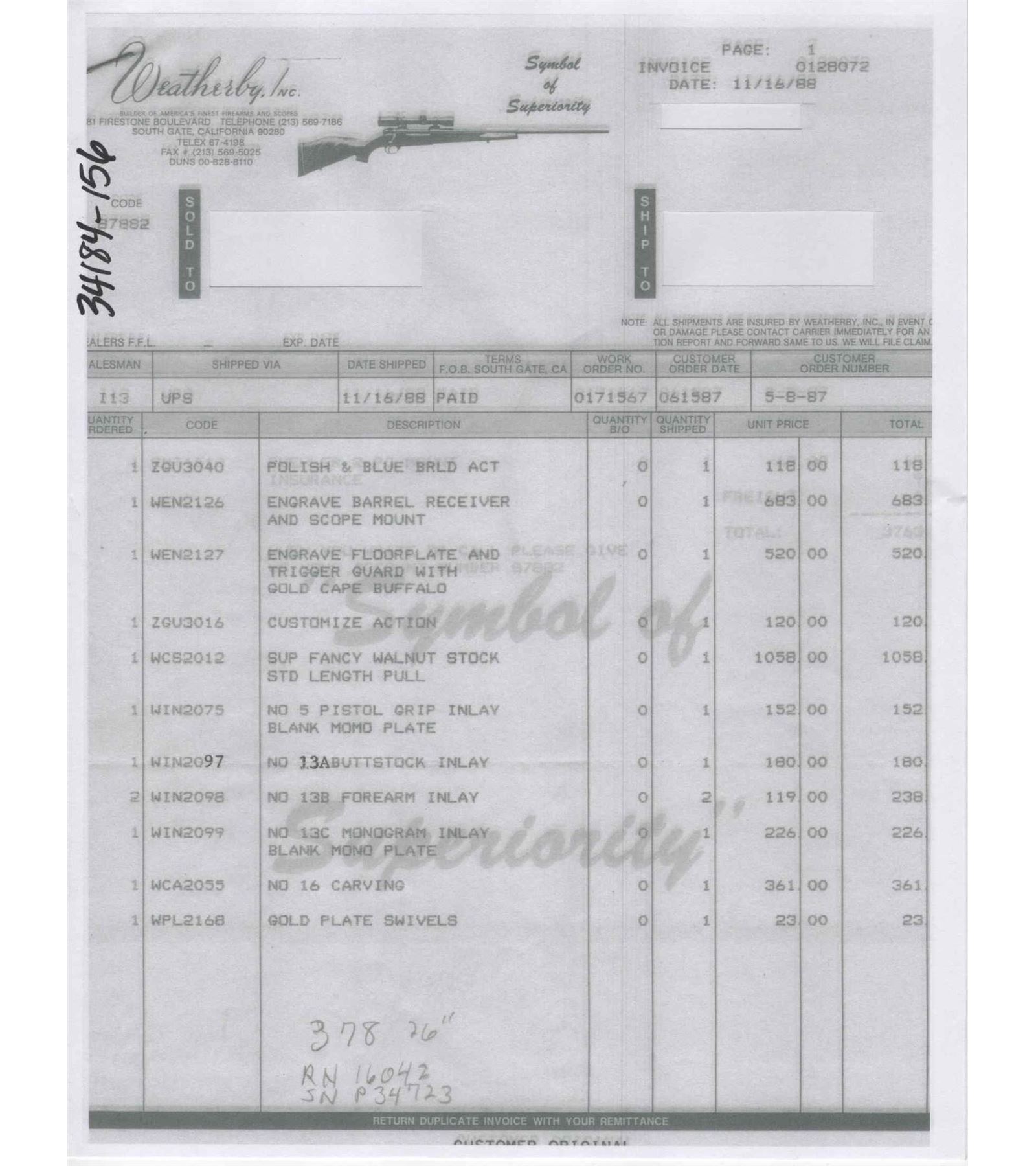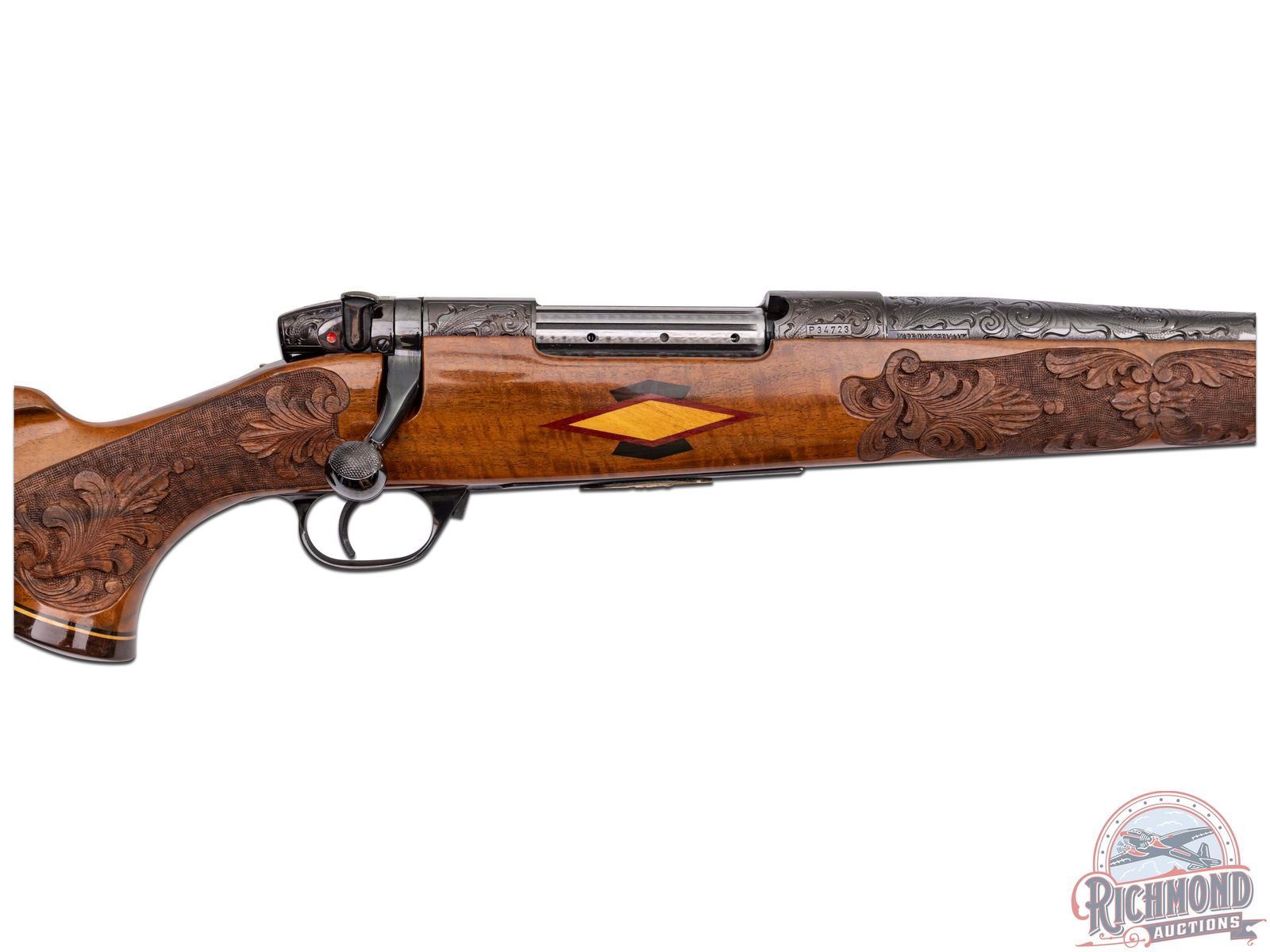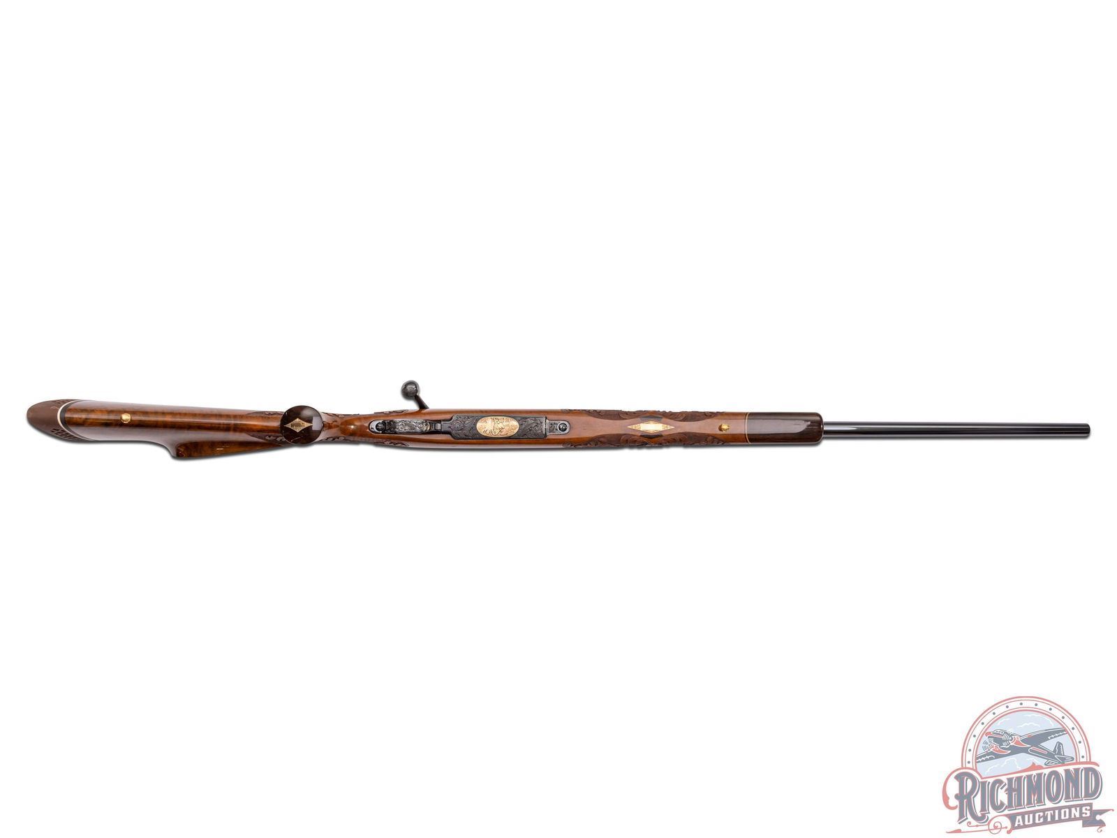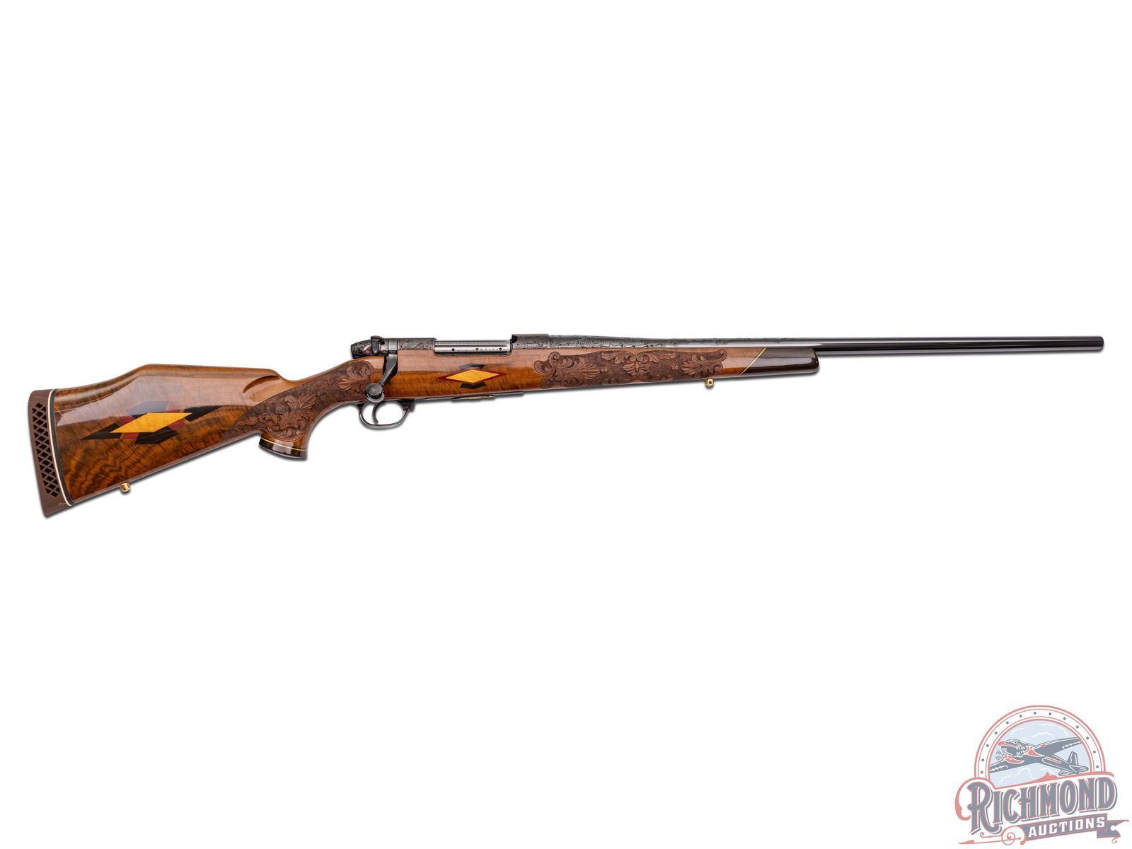 Custom made in West Germany in 1969 and South Gate custom shop engraved. Features a 26" blued sightless tapered barrel. Barrel has 40% coverage featuring floral scroll engraving that extends 11" from receiver. Receiver has matching engraving with 80% coverage. Top of the receiver is drilled for scope mounts. Blued floorplate has 85% coverage with a gold embossed oval featuring a water buffalo in the African Serengeti scene. Two position safety with jeweled bolt and follower and knurled bolt knob. Engraved trigger guard with serrated trigger. Heavy grain factory Weatherby walnut Monte Carlo style stock with contrasting Rosewood forearm tip and pistol grip cap. Pistol grip features a gold engraved diamond shaped inlay. Deep relief factory carved stock featuring a floral scroll pattern with punch dot background. Bottom of foregrip and both sides of the receiver feature a diamond tri-wood inlay consisting of bony, rosewood and birch. Bottom of the forearm inlay features a gold engraved inlaid plate. Right side of the stock has a larger scale diamond tri-wood inlay. Factory gold plate sling studs. Fitted with a Weatherby brown ventilated recoil pad. Includes Weatherby factory paperwork stating upgrades done in 1988 totaling over $3,500. LOP: 13-1/2". CALIBER: 378 WBY MAG. S/N: P34723. FFL STATUS: Curio & Relic.