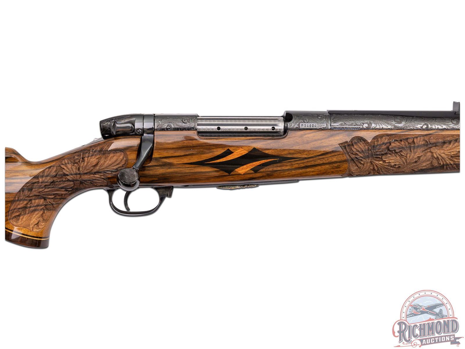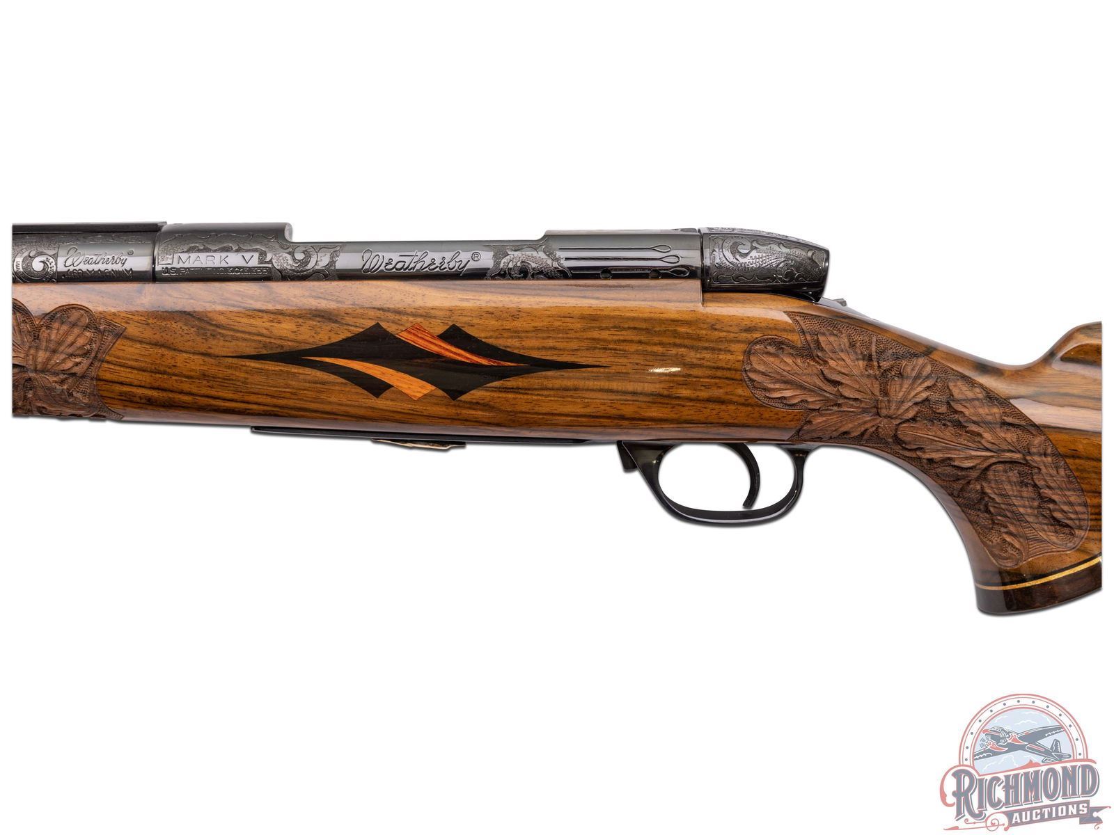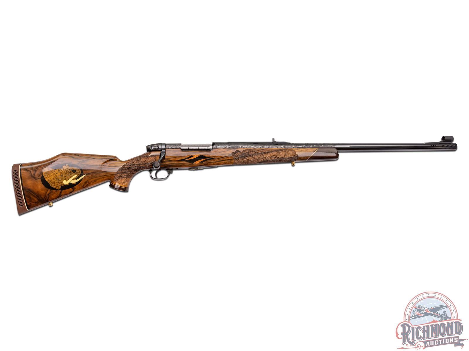 Custom made in West Germany in 1969 and South Gate custom shop engraved. Features a 26" blued round ported barrel with 2-leaf rear notch sight on quarter rib and hooded front sight with brass bead. Barrel has 40% coverage featuring floral scroll engraving that extends 12" from receiver. Receiver has matching engraving with 75% coverage. Top of the receiver is drilled for scope mounts. Blued floorplate has 85% coverage with a gold embossed African elephant bust. Two position safety with jeweled bolt and follower, and knurled bolt knob. Engraved trigger guard with serrated trigger. Heavy grain factory Weatherby 2X walnut Monte Carlo style stock with contrasting rosewood forearm tip and pistol grip cap. Pistol grip features a gold engraved diamond shaped inlay. Deep relief factory carved stock featuring the Weatherby oak leaf and acorn pattern. Bottom of forearm and both sides of the receiver feature a crossed diamond bi-wood inlay consisting of ebony and birch. Bottom of the forearm inlay features a gold engraved inlaid plate. Right side of the stock has an African elephant bust bi-wood inlay of ebony and birch with ivory tusks. Factory gold plate sling studs. Fitted with a Weatherby brown ventilated recoil pad. Includes Weatherby factory paperwork stating all upgrades done in 1989 totaling over $3,300. LOP: 13-3/4". CALIBER: 460 WBY MAG. S/N: P34804. FFL STATUS: Curio & Relic.