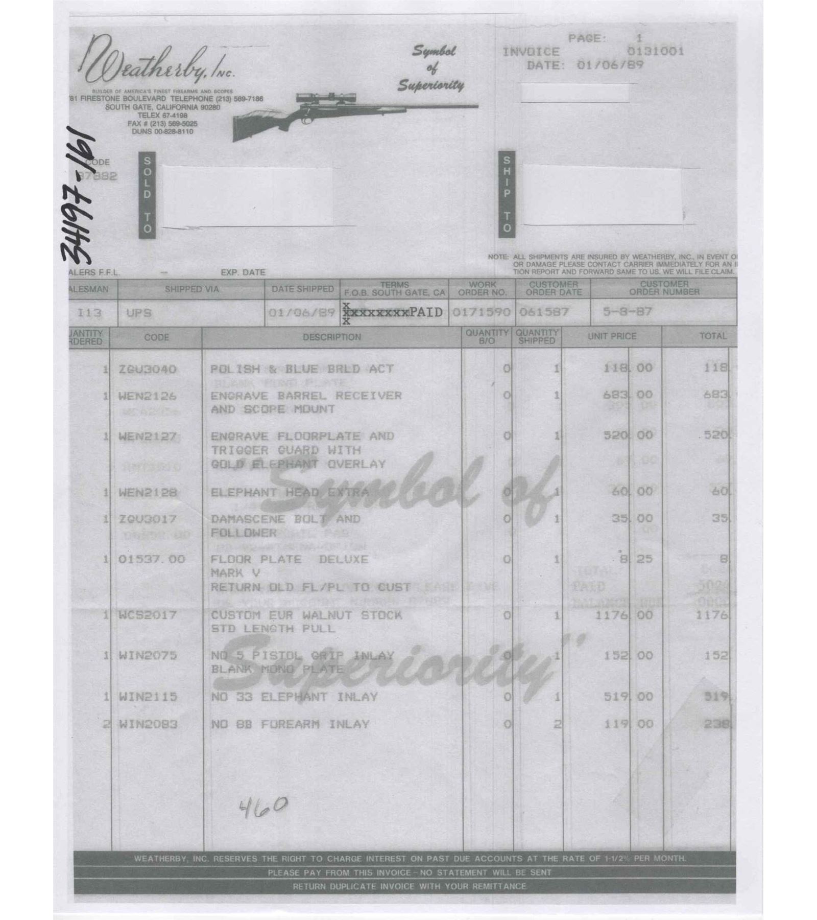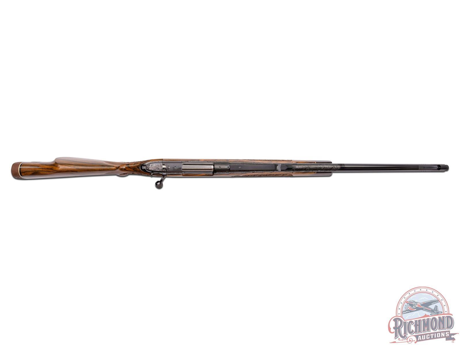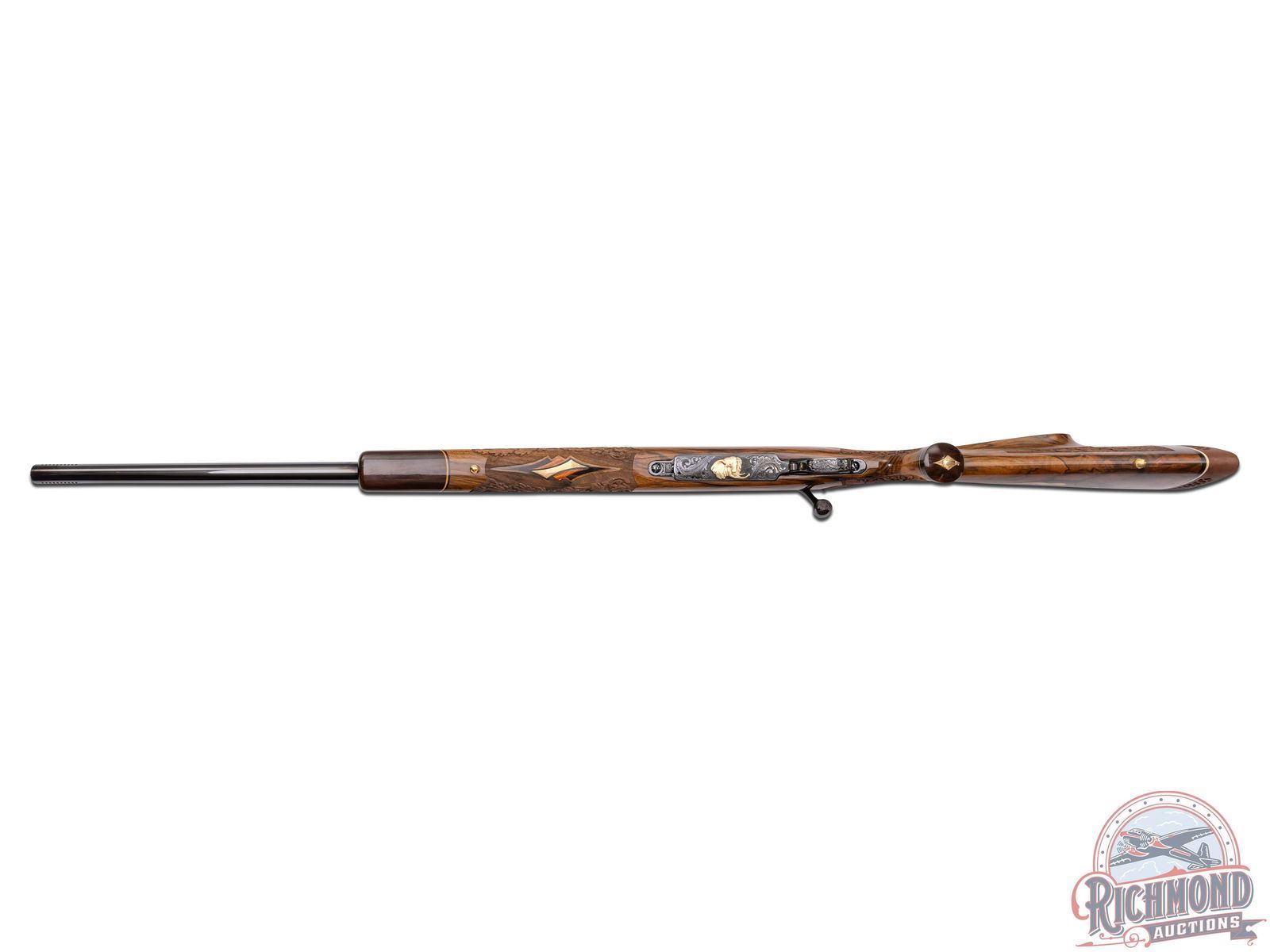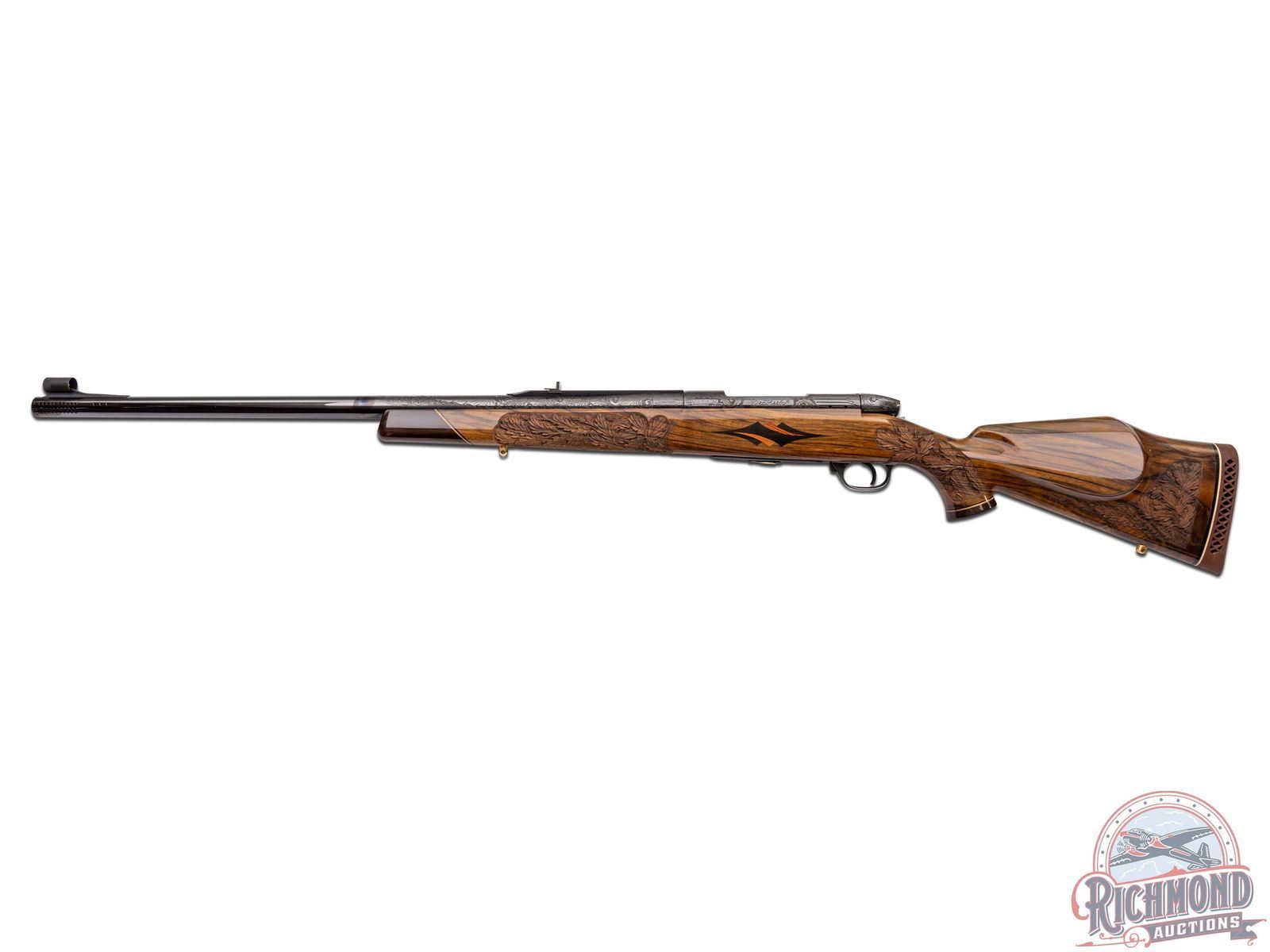 Custom made in West Germany in 1969 and South Gate custom shop engraved. Features a 26" blued round ported barrel with 2-leaf rear notch sight on quarter rib and hooded front sight with brass bead. Barrel has 40% coverage featuring floral scroll engraving that extends 12" from receiver. Receiver has matching engraving with 75% coverage. Top of the receiver is drilled for scope mounts. Blued floorplate has 85% coverage with a gold embossed African elephant bust. Two position safety with jeweled bolt and follower, and knurled bolt knob. Engraved trigger guard with serrated trigger. Heavy grain factory Weatherby 2X walnut Monte Carlo style stock with contrasting rosewood forearm tip and pistol grip cap. Pistol grip features a gold engraved diamond shaped inlay. Deep relief factory carved stock featuring the Weatherby oak leaf and acorn pattern. Bottom of forearm and both sides of the receiver feature a crossed diamond bi-wood inlay consisting of ebony and birch. Bottom of the forearm inlay features a gold engraved inlaid plate. Right side of the stock has an African elephant bust bi-wood inlay of ebony and birch with ivory tusks. Factory gold plate sling studs. Fitted with a Weatherby brown ventilated recoil pad. Includes Weatherby factory paperwork stating all upgrades done in 1989 totaling over $3,300. LOP: 13-3/4". CALIBER: 460 WBY MAG. S/N: P34804. FFL STATUS: Curio & Relic.