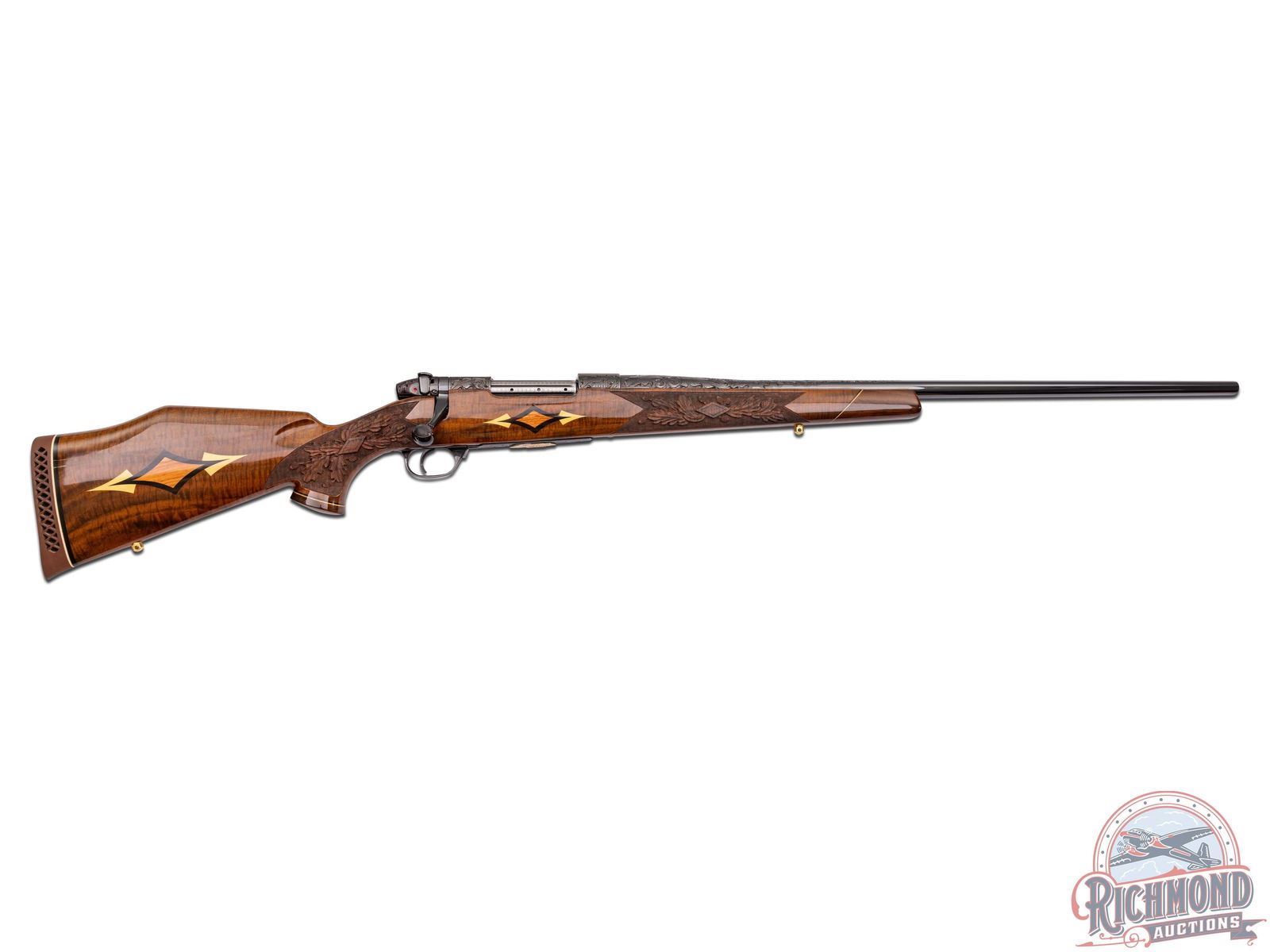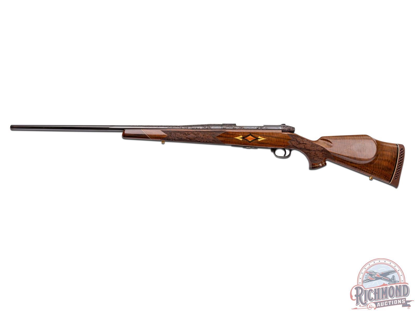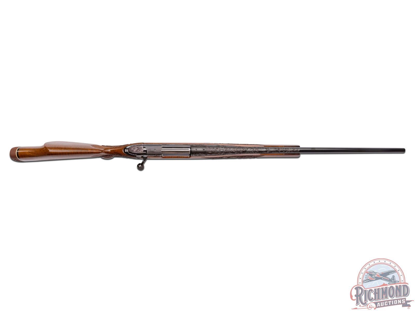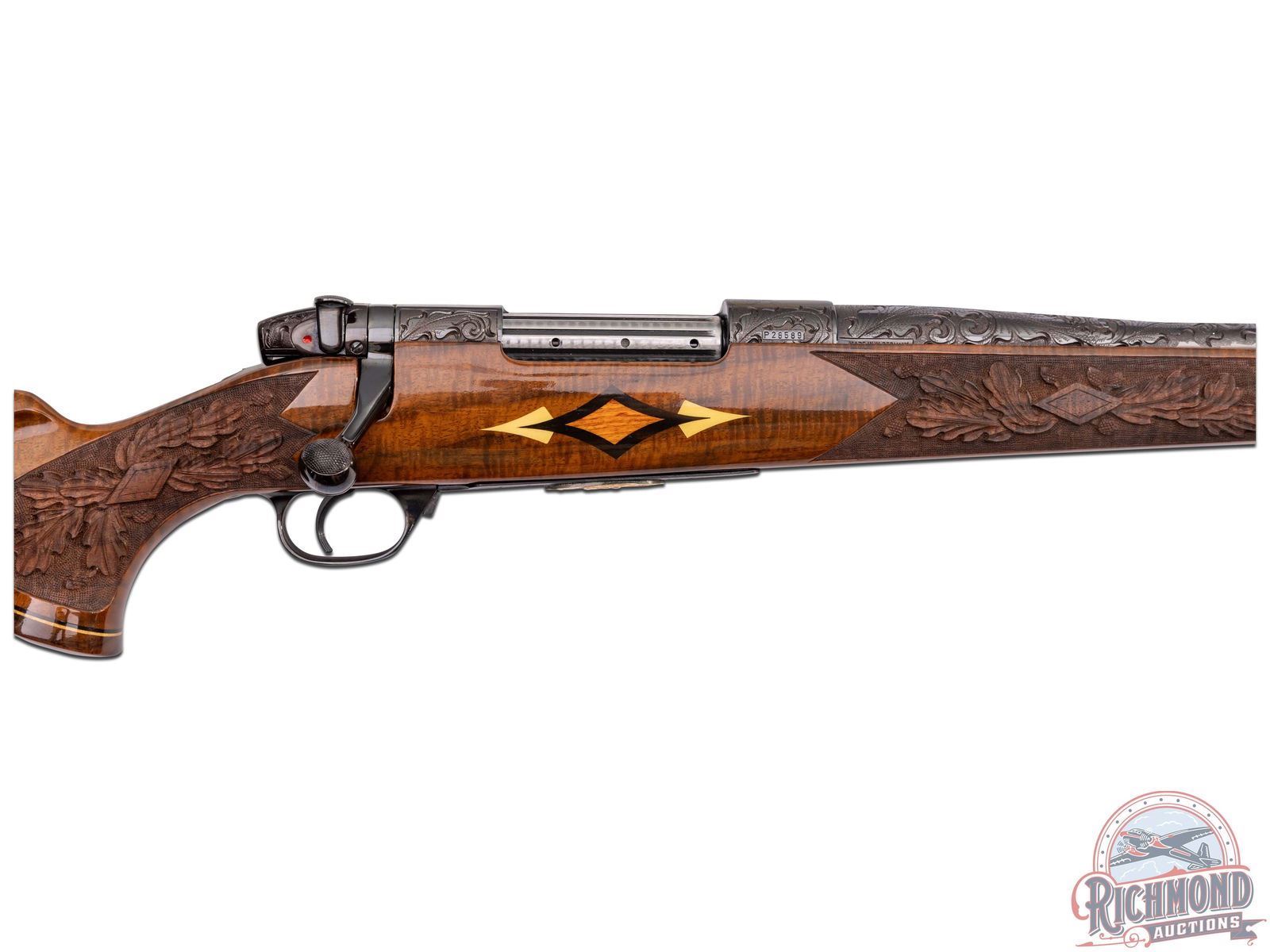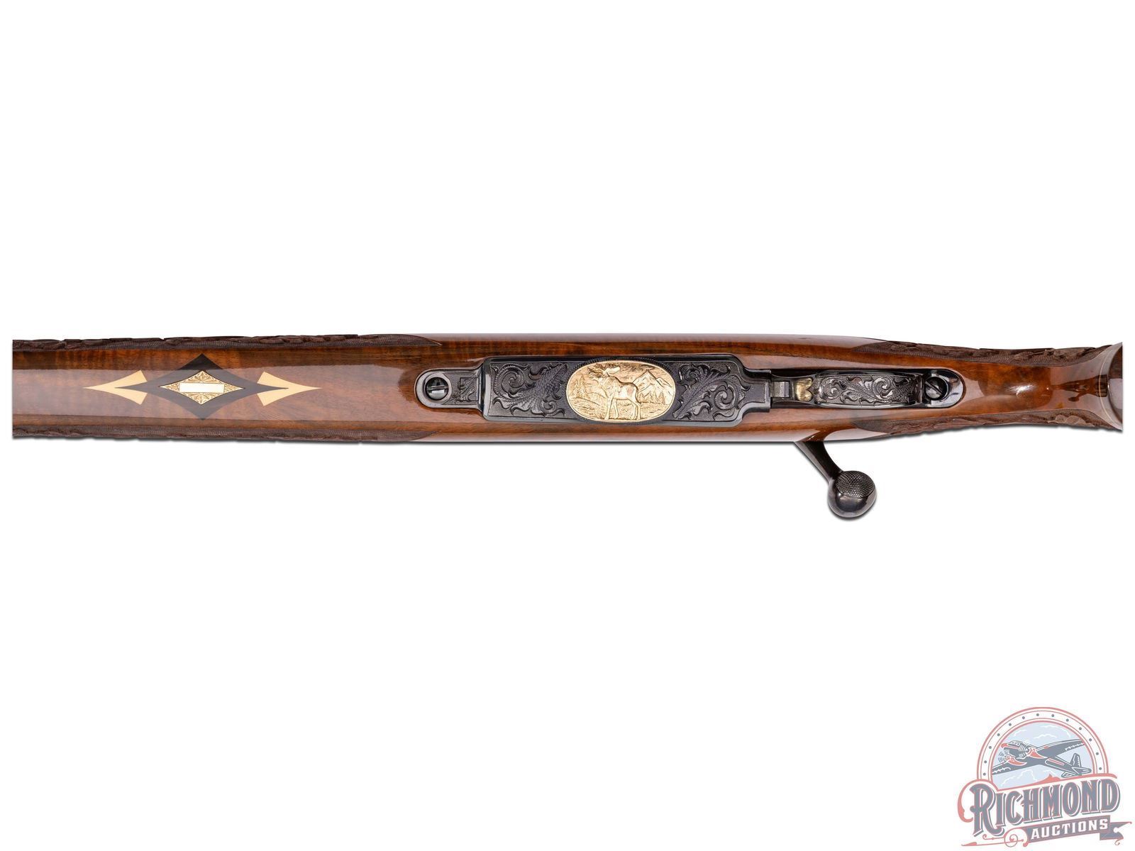 Custom made in West Germany in 1968 and South Gate custom shop engraved. Features a 26" blued sightless tapered barrel. Barrel has 40% coverage featuring floral scroll engraving that extends 11" from receiver. Receiver has matching engraving with 80% coverage. Top of the receiver is drilled for scope mounts. Blued floorplate has 85% coverage with a gold embossed oval featuring a calling moose with mountain background. Two position safety with jeweled bolt and follower and knurled bolt knob. Engraved trigger guard with serrated trigger. Heavy grain factory Weatherby walnut Monte Carlo style stock with contrasting rosewood forearm tip and pistol grip cap. Pistol grip features a gold engraved diamond shaped inlay. Deep relief factory carved stock featuring the Weatherby oak leaf and acorn pattern with diamond centers. Bottom of foregrip and both sides of the receiver feature a stretched diamond tri-wood inlay consisting of birch, bony and rosewood. Bottom of the forearm inlay features a gold engraved inlaid plate. Right side of the stock has a larger, matching tri-wood inlay. Factory gold plate sling studs. Fitted with a Weatherby brown ventilated recoil pad. Includes Weatherby factory paperwork stating upgrades done in 1988, totaling over $3,300. LOP: 13-1/2". CALIBER: 7mm MAG. S/N: P28589. FFL STATUS: Curio & Relic.