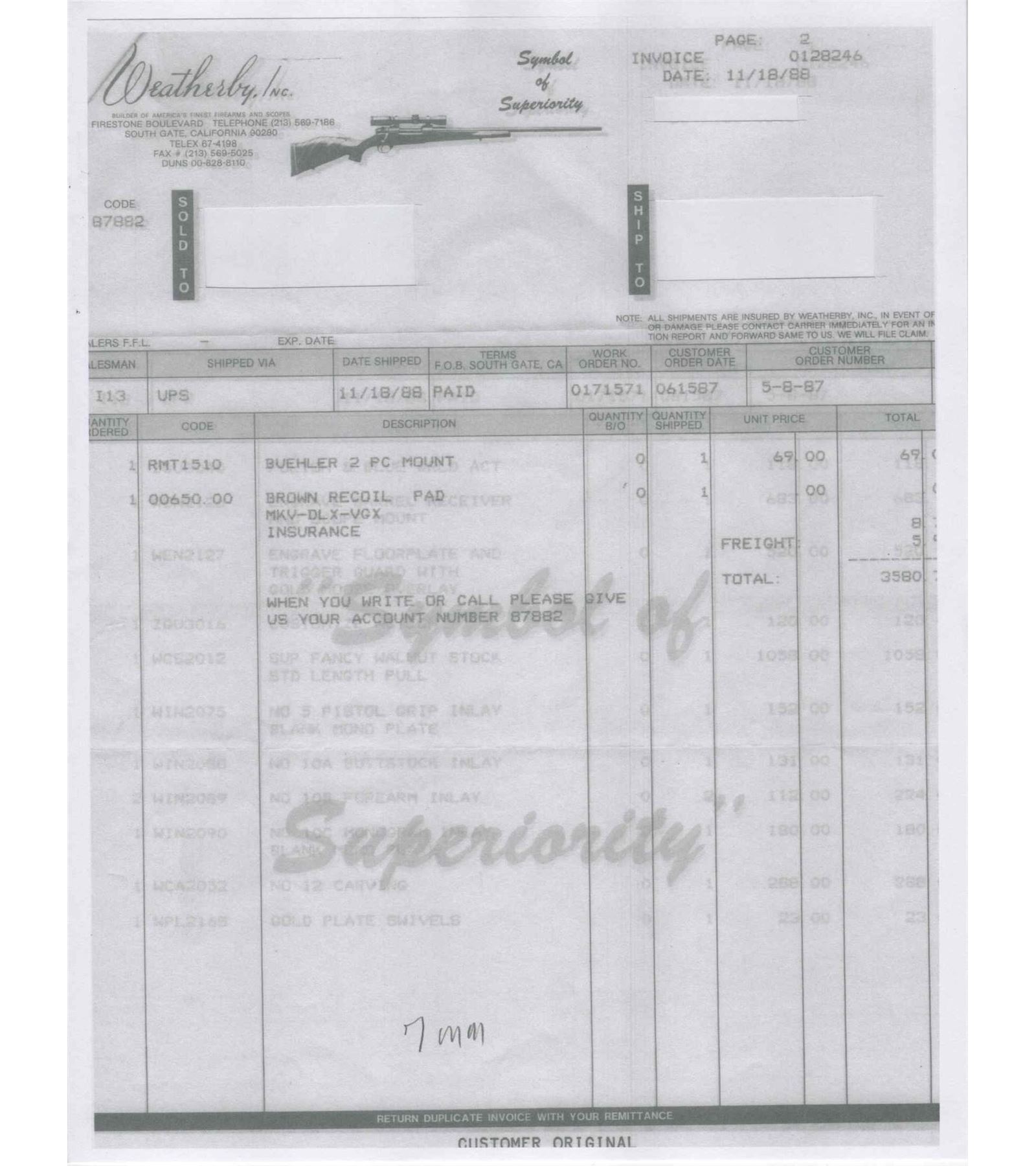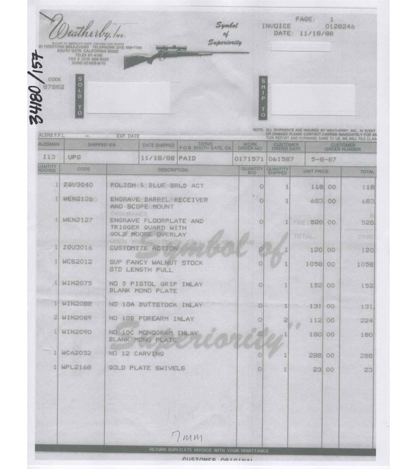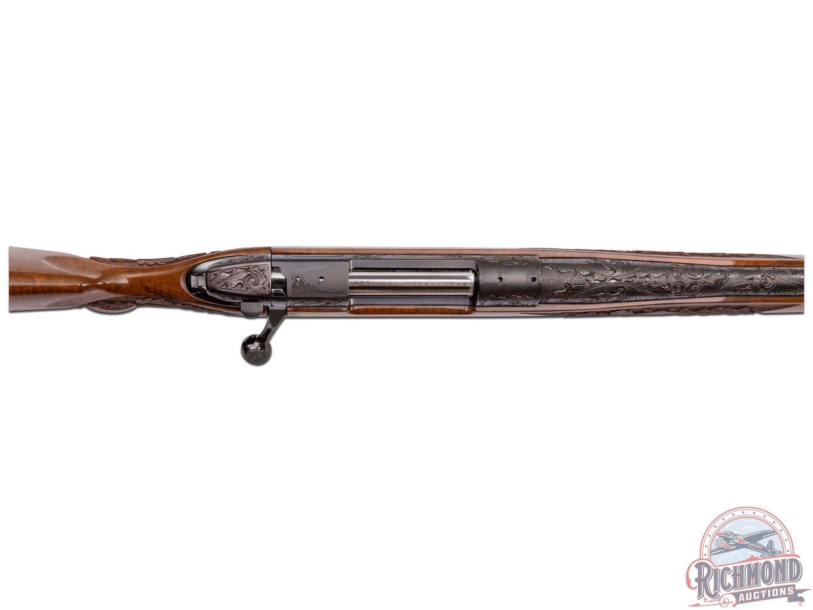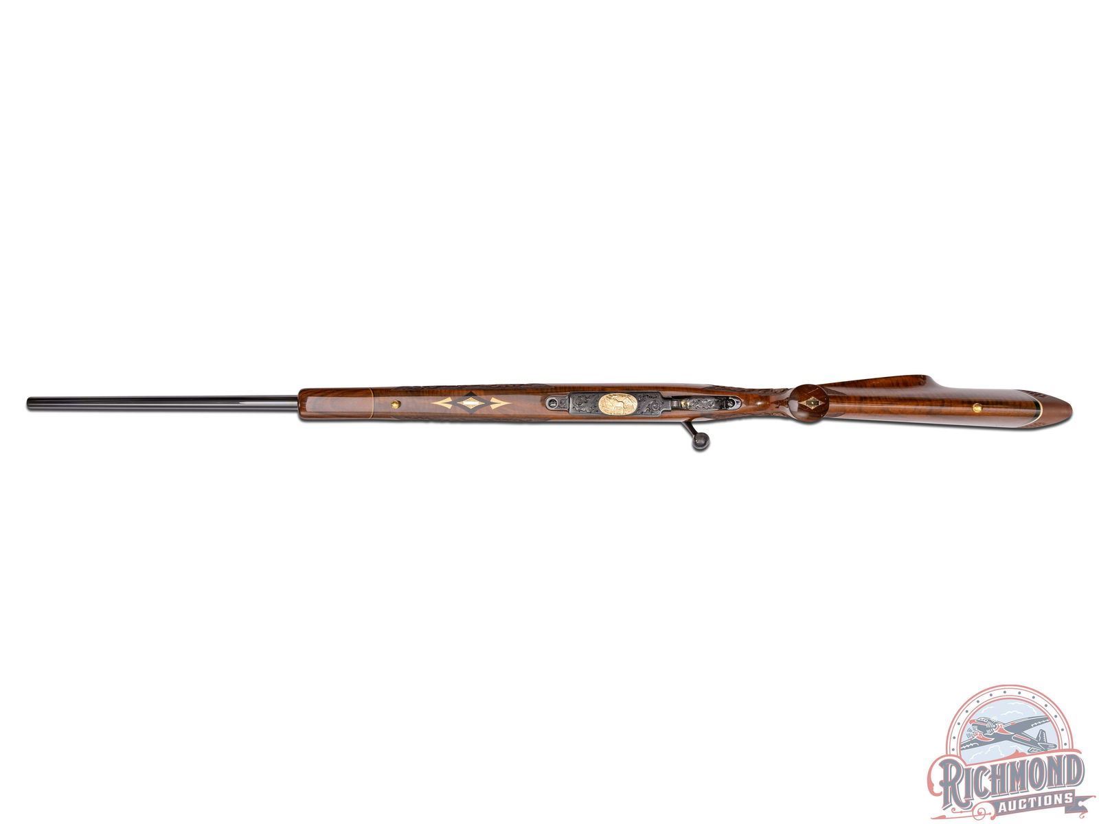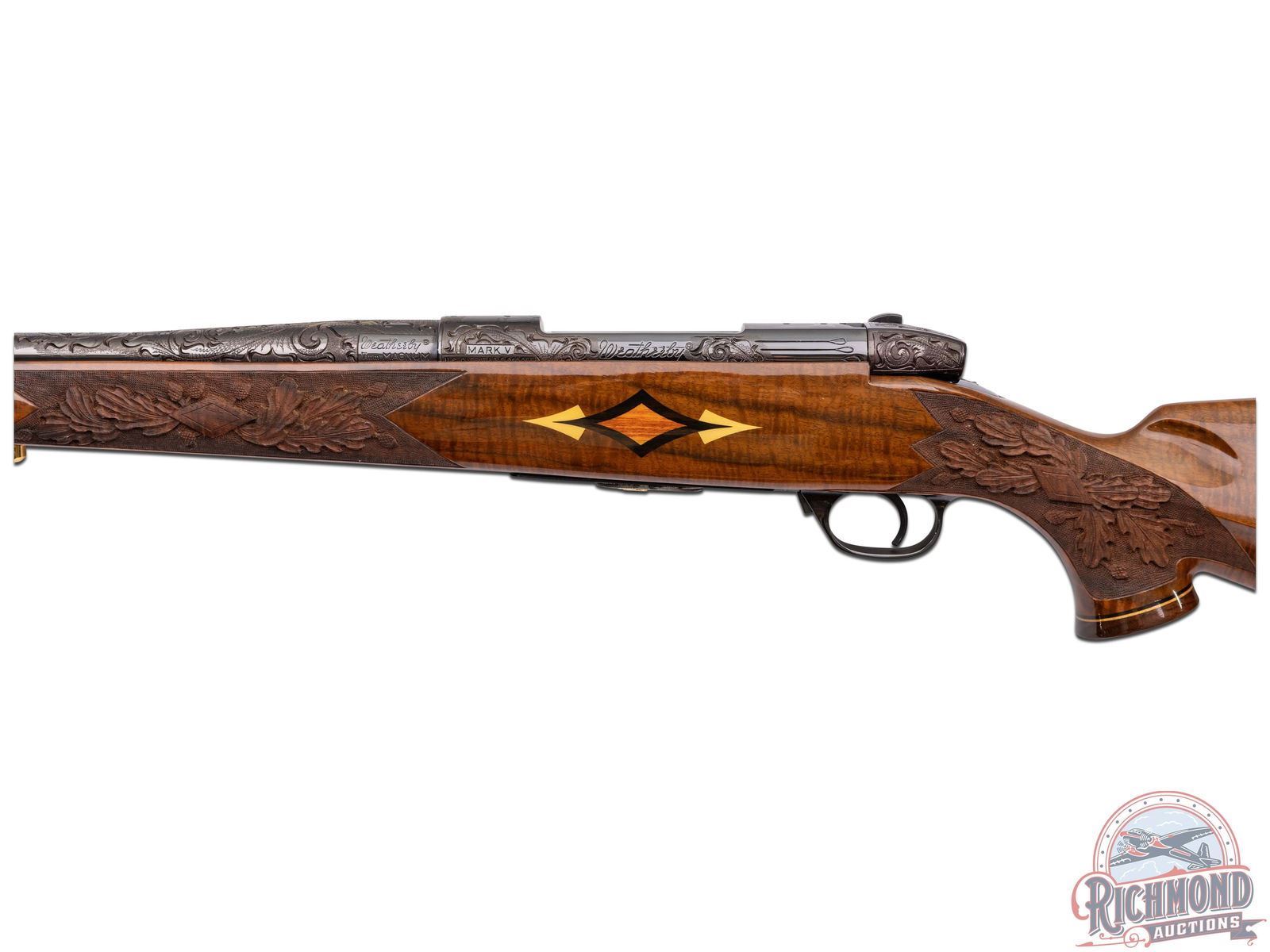 Custom made in West Germany in 1968 and South Gate custom shop engraved. Features a 26" blued sightless tapered barrel. Barrel has 40% coverage featuring floral scroll engraving that extends 11" from receiver. Receiver has matching engraving with 80% coverage. Top of the receiver is drilled for scope mounts. Blued floorplate has 85% coverage with a gold embossed oval featuring a calling moose with mountain background. Two position safety with jeweled bolt and follower and knurled bolt knob. Engraved trigger guard with serrated trigger. Heavy grain factory Weatherby walnut Monte Carlo style stock with contrasting rosewood forearm tip and pistol grip cap. Pistol grip features a gold engraved diamond shaped inlay. Deep relief factory carved stock featuring the Weatherby oak leaf and acorn pattern with diamond centers. Bottom of foregrip and both sides of the receiver feature a stretched diamond tri-wood inlay consisting of birch, bony and rosewood. Bottom of the forearm inlay features a gold engraved inlaid plate. Right side of the stock has a larger, matching tri-wood inlay. Factory gold plate sling studs. Fitted with a Weatherby brown ventilated recoil pad. Includes Weatherby factory paperwork stating upgrades done in 1988, totaling over $3,300. LOP: 13-1/2". CALIBER: 7mm MAG. S/N: P28589. FFL STATUS: Curio & Relic.