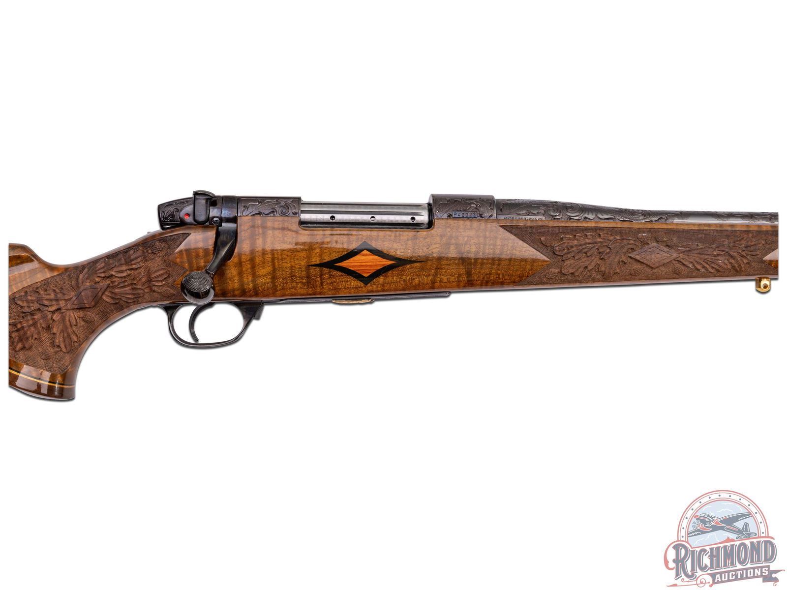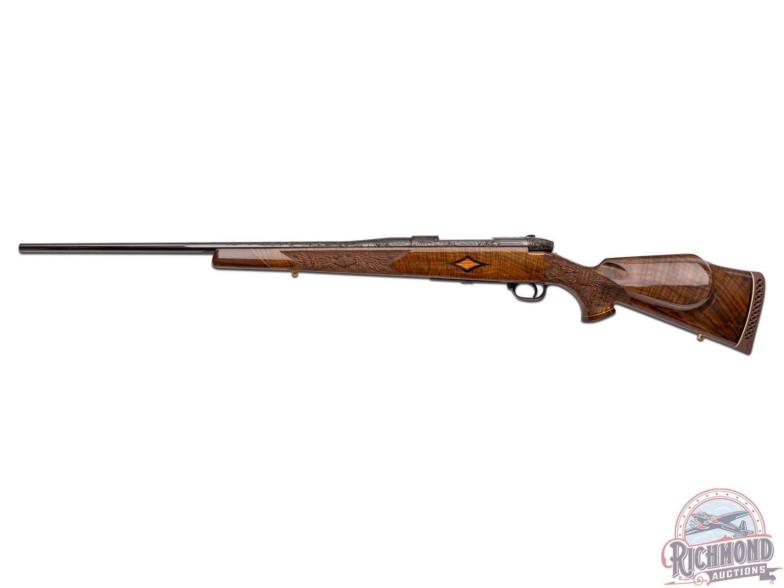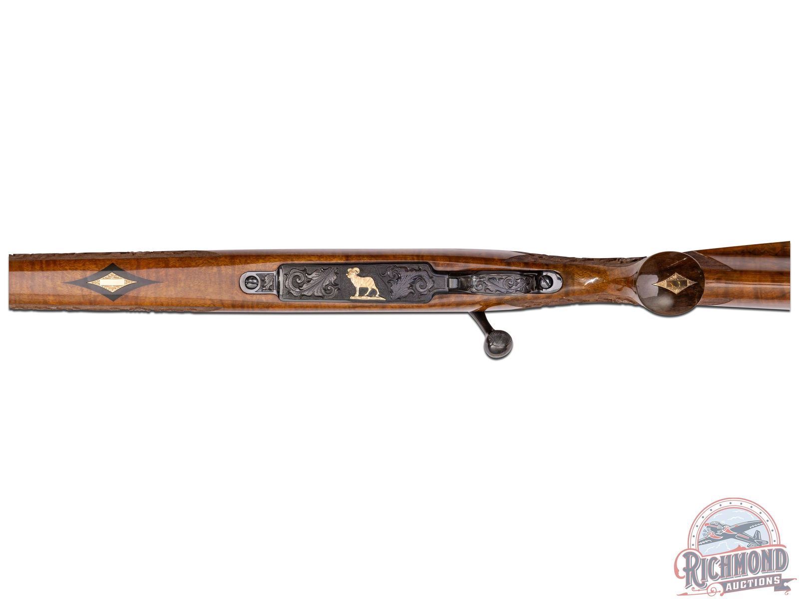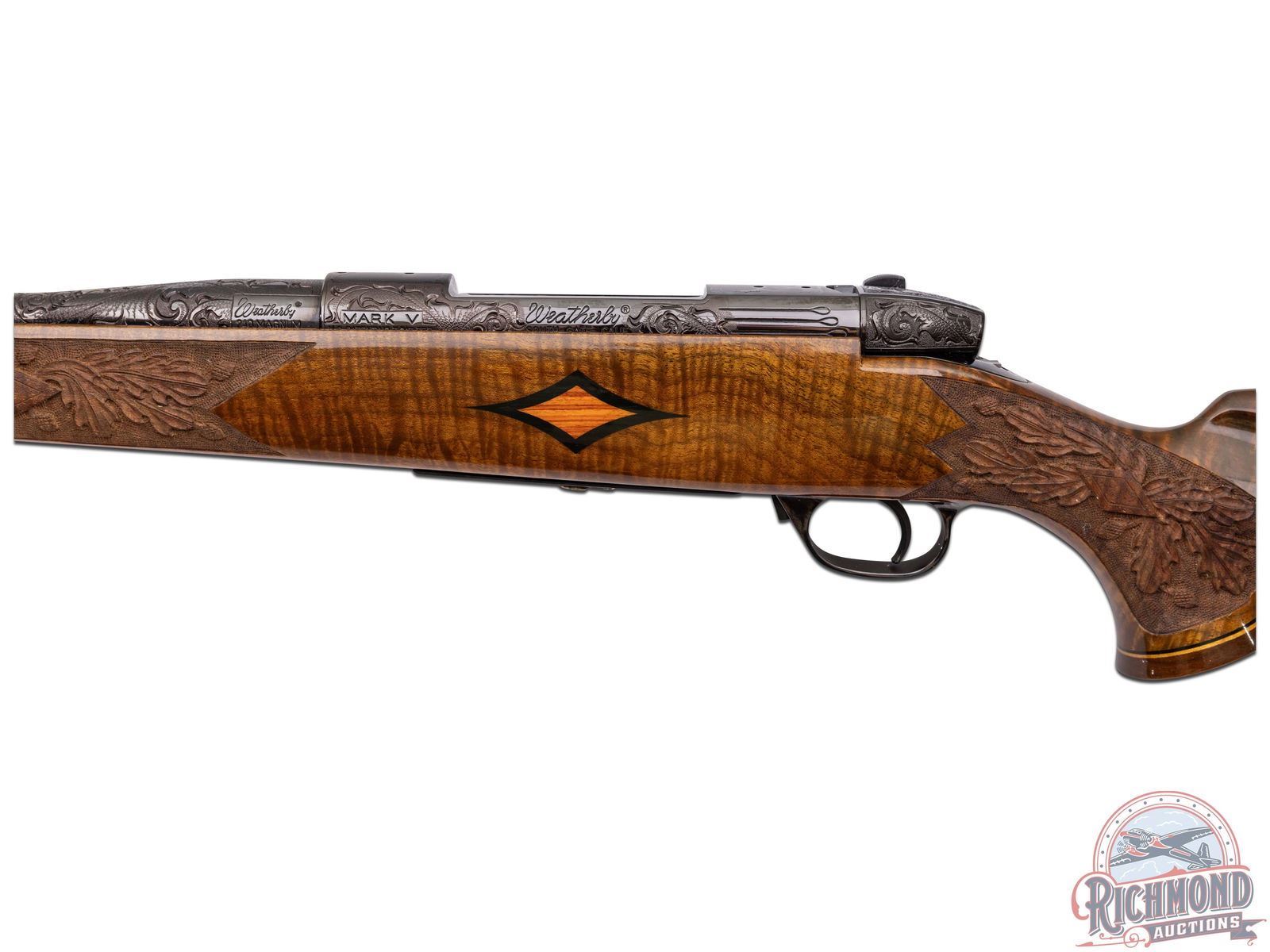 Custom made in West Germany in 1970 and South Gate custom shop engraved. Features a 26" blued sightless tapered barrel. Barrel has 40% coverage featuring floral scroll engraving that extends 11" from receiver. Receiver has matching engraving with 80% coverage. Top of the receiver is drilled for scope mounts. Blued floorplate has 85% coverage with a gold embossed Bighorn Sheep. Two position safety with jeweled bolt and follower and knurled bolt knob. Engraved trigger guard with serrated trigger. Heavy grain fancy factory Weatherby walnut Monte Carlo style stock with contrasting dark walnut forearm tip and pistol grip cap. Pistol grip features a gold engraved diamond shaped inlay. Deep relief factory carved stock featuring the Weatherby oak leaf and acorn pattern with diamond centers. Both sides of the receiver feature a diamond bi-wood inlay consisting of bony and rosewood. Bottom of the forearm is inlaid with an ebony diamond and gold engraved inlaid plate. Right side of the stock has a larger scale, matching bi-wood inlay. Factory gold plate sling studs. Fitted with a Weatherby brown ventilated recoil pad. Includes Weatherby factory letter stating all the upgrades done in 1988 totaling over $3,300. LOP: 13-1/2". CALIBER: 240 WBY MAG. S/N: P40022. FFL STATUS: Curio & Relic.