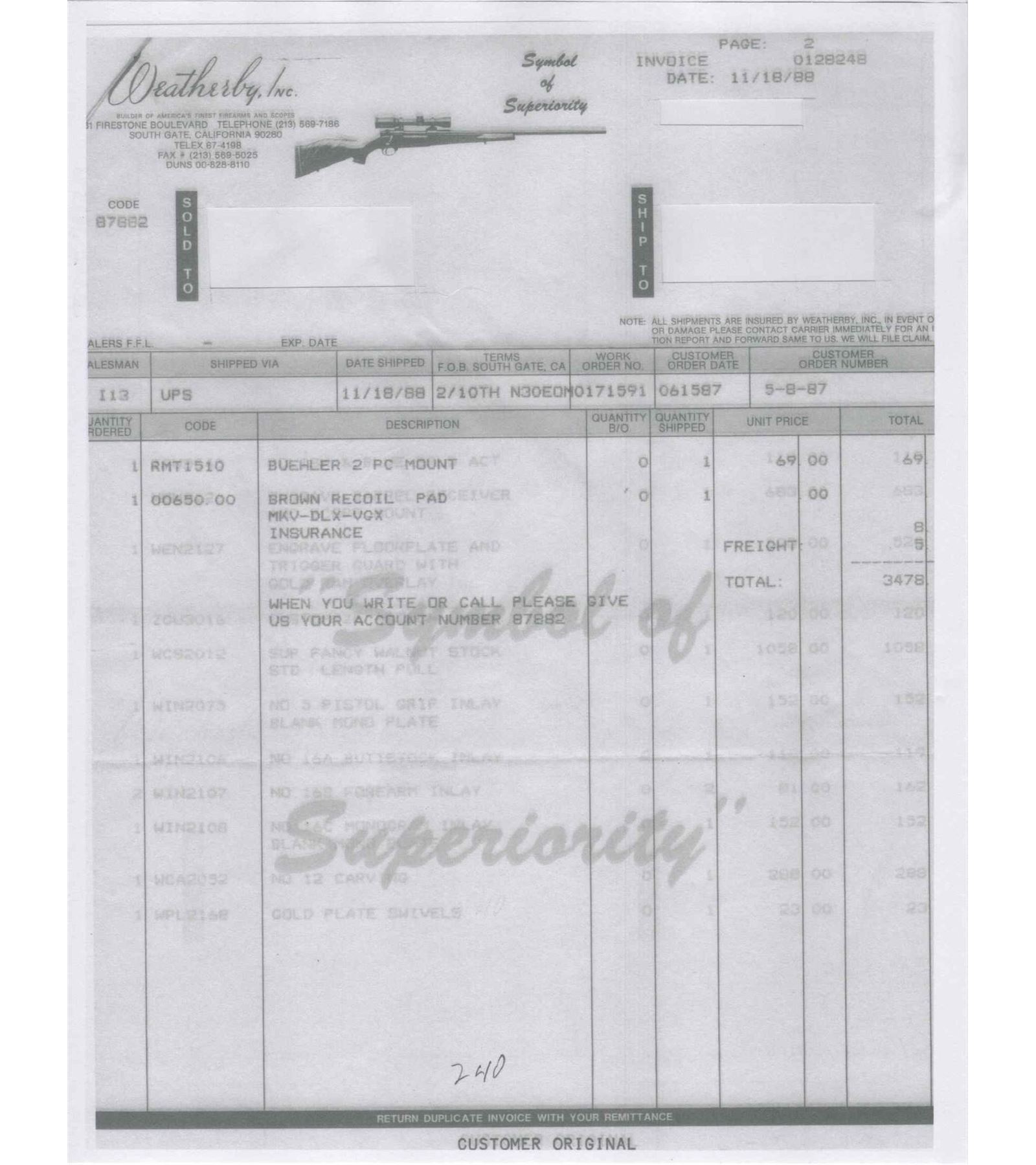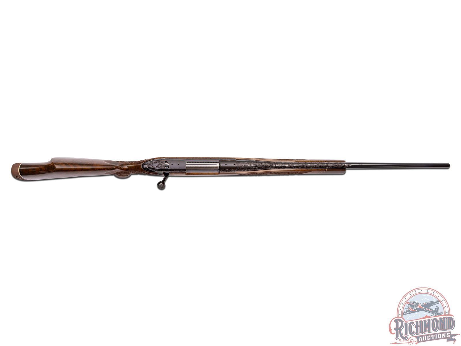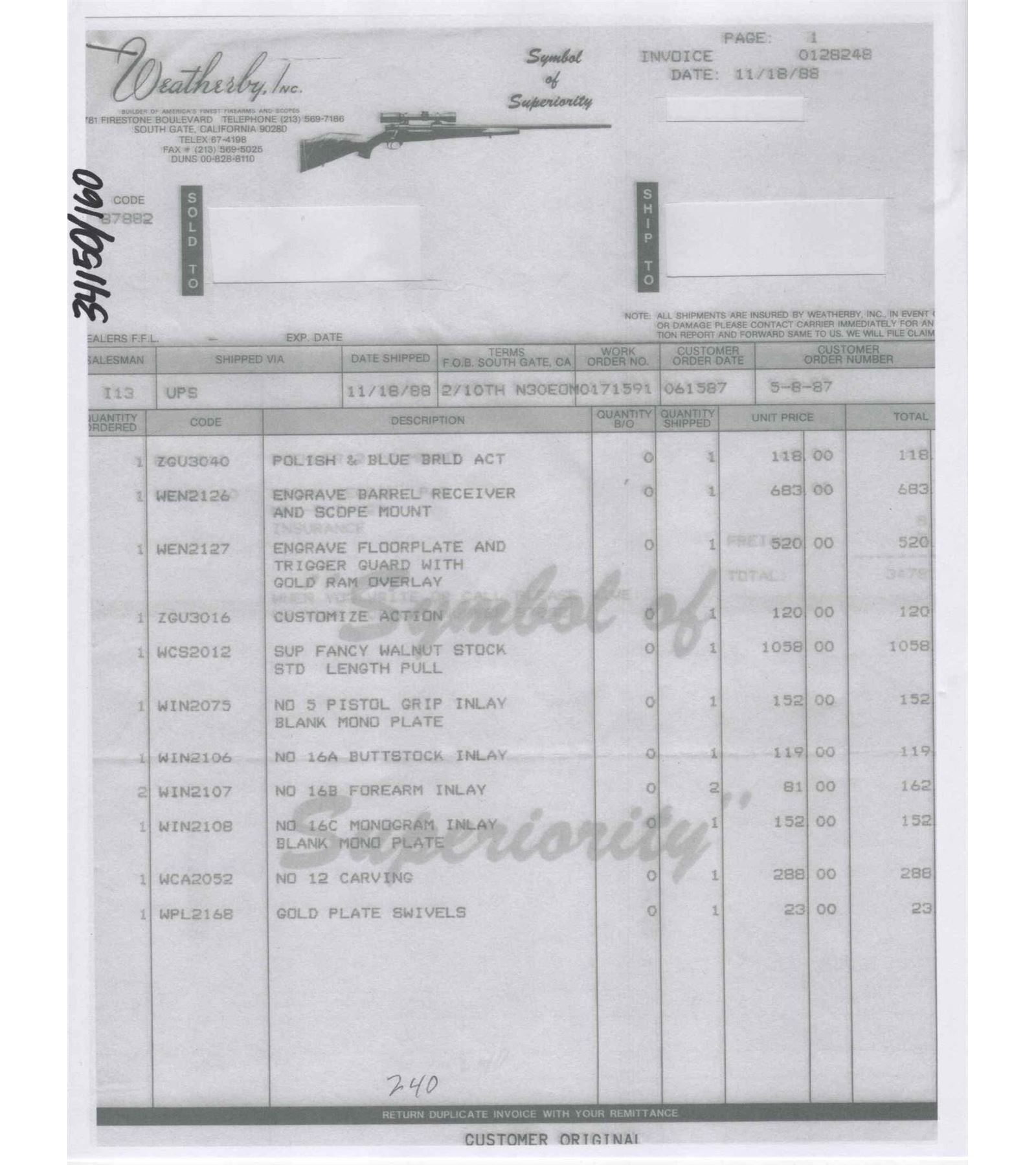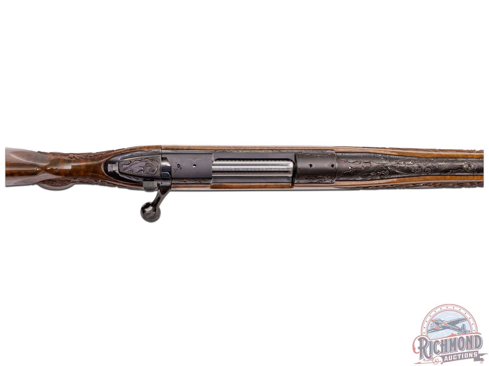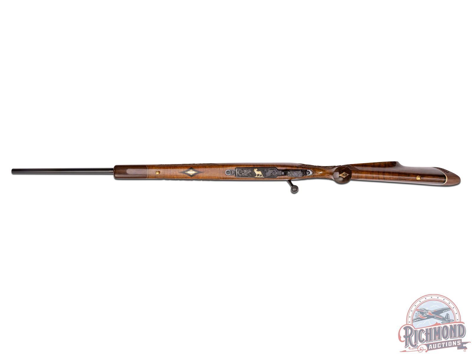 Custom made in West Germany in 1970 and South Gate custom shop engraved. Features a 26" blued sightless tapered barrel. Barrel has 40% coverage featuring floral scroll engraving that extends 11" from receiver. Receiver has matching engraving with 80% coverage. Top of the receiver is drilled for scope mounts. Blued floorplate has 85% coverage with a gold embossed Bighorn Sheep. Two position safety with jeweled bolt and follower and knurled bolt knob. Engraved trigger guard with serrated trigger. Heavy grain fancy factory Weatherby walnut Monte Carlo style stock with contrasting dark walnut forearm tip and pistol grip cap. Pistol grip features a gold engraved diamond shaped inlay. Deep relief factory carved stock featuring the Weatherby oak leaf and acorn pattern with diamond centers. Both sides of the receiver feature a diamond bi-wood inlay consisting of bony and rosewood. Bottom of the forearm is inlaid with an ebony diamond and gold engraved inlaid plate. Right side of the stock has a larger scale, matching bi-wood inlay. Factory gold plate sling studs. Fitted with a Weatherby brown ventilated recoil pad. Includes Weatherby factory letter stating all the upgrades done in 1988 totaling over $3,300. LOP: 13-1/2". CALIBER: 240 WBY MAG. S/N: P40022. FFL STATUS: Curio & Relic.