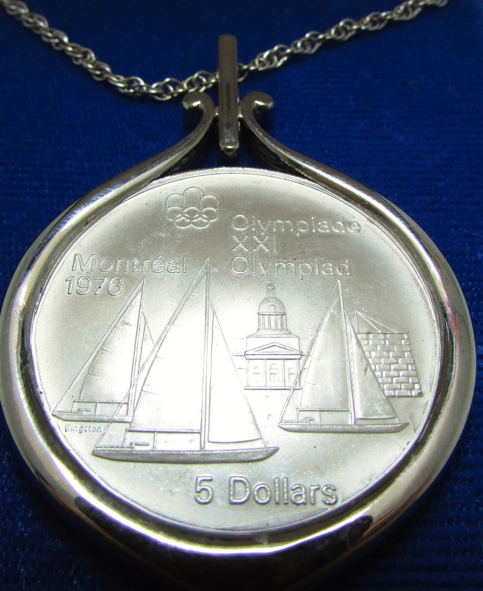1973 Canadian Sterling Silver Medallion (.72 Oz ASW) Representing Sailing At The Montreal 1976 Summer Olympics In Bezel On 22" Sterling Silver Chain. Total Weight Of Entire Piece Is 38.85 Grams (1.15 Oz ASW) - Includes Original Box
