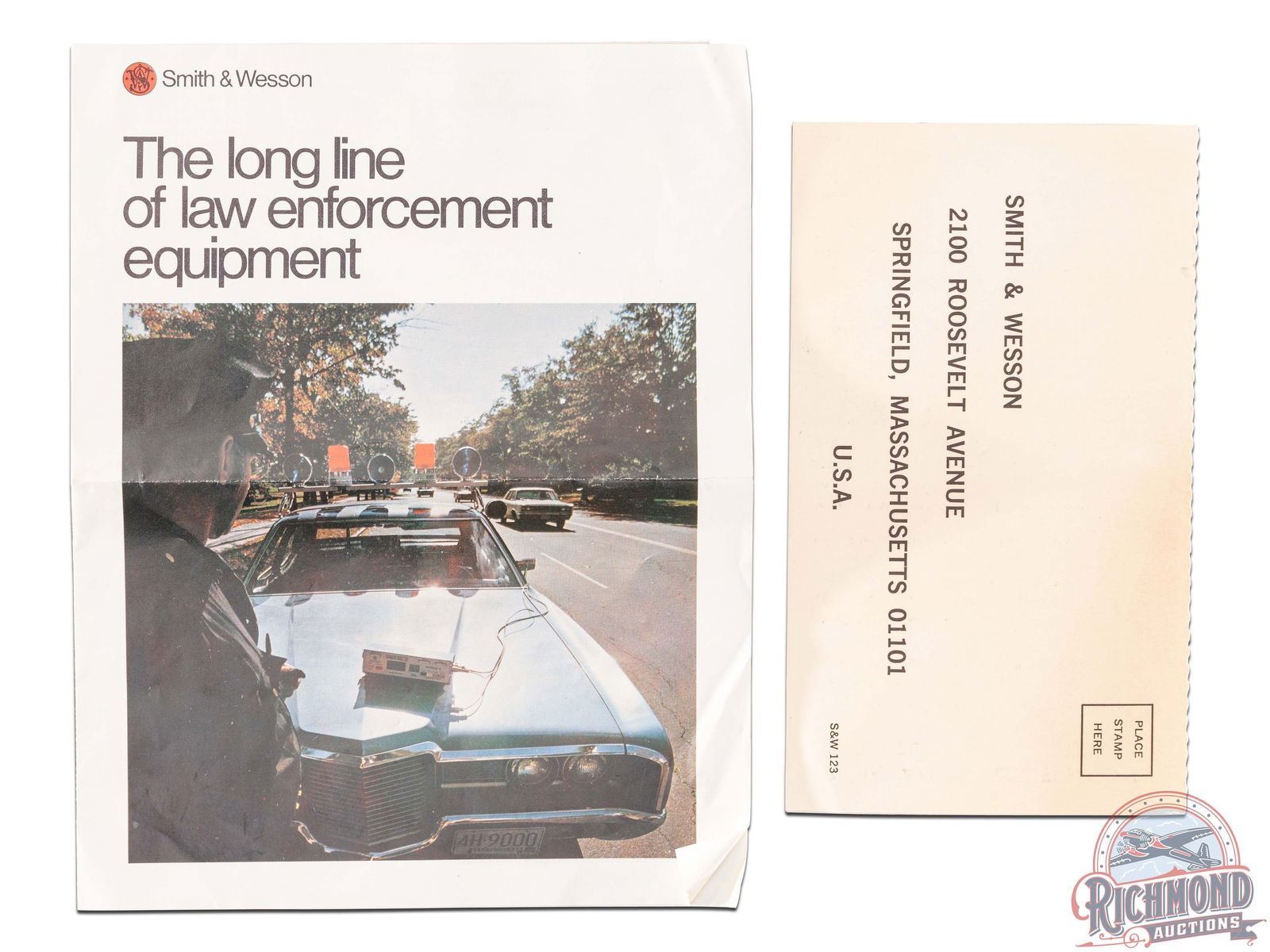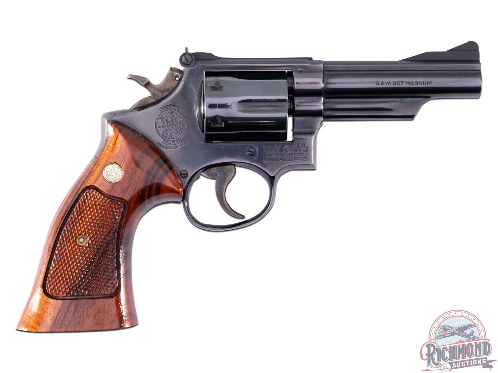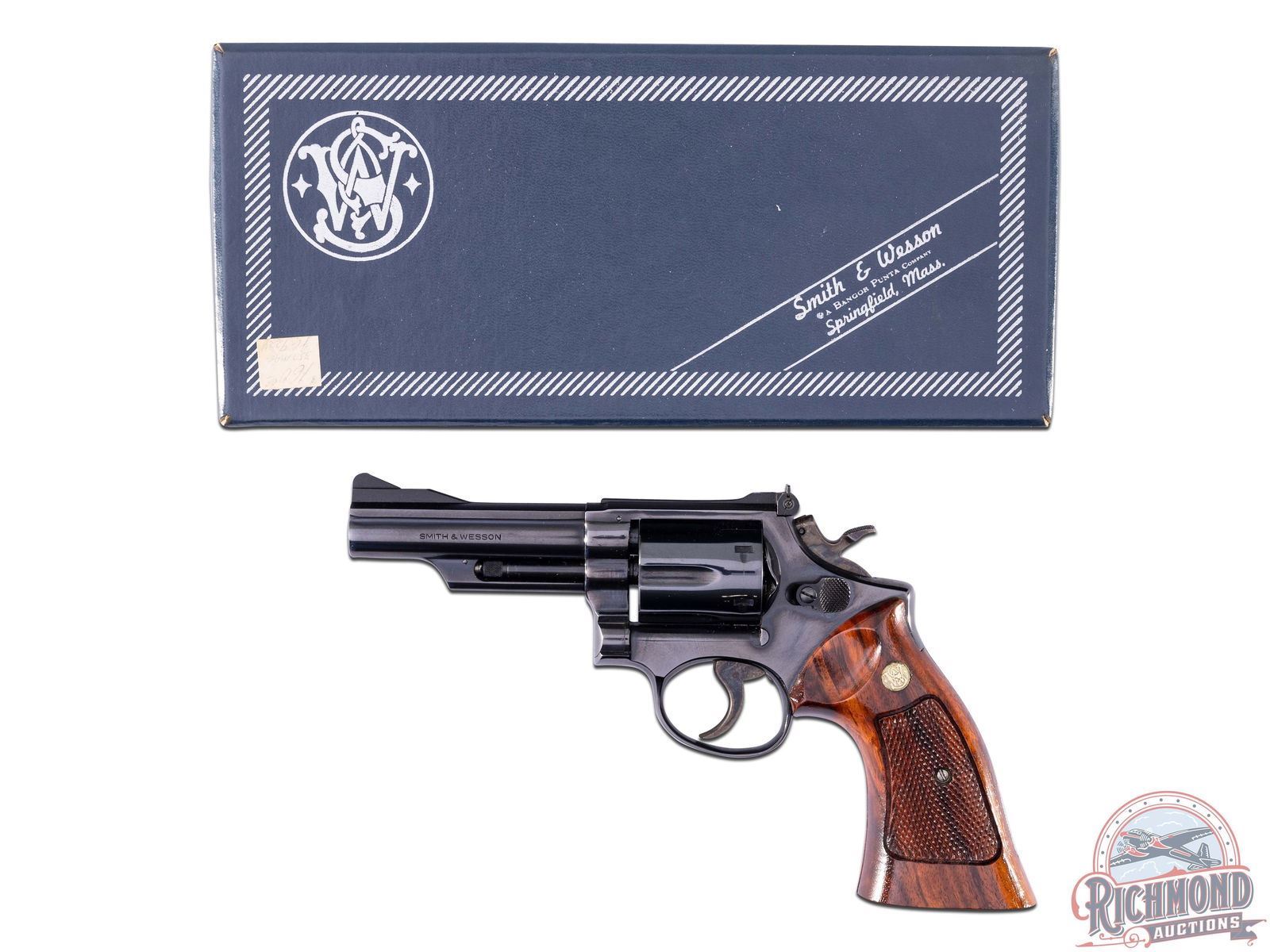 Manufactured in 1974. Features a 4" pinned ribbed barrel, front ramp sight and rear adjustable Partridge sight. Blued finish on the K target frame with shrouded ejector rod. Swing out recessed cylinder with six rounds for the powerful .357 magnum with ejector rod. Hammer and trigger are case-hardened. Original factory wood grips with checkered centers and gold tone S&W medallions, and serrated backstrap. Comes in the original blue box with warranty card and factory wax paper. CALIBER: 357 MAG. S/N: 4K81350. FFL STATUS: Curio & Relic.
