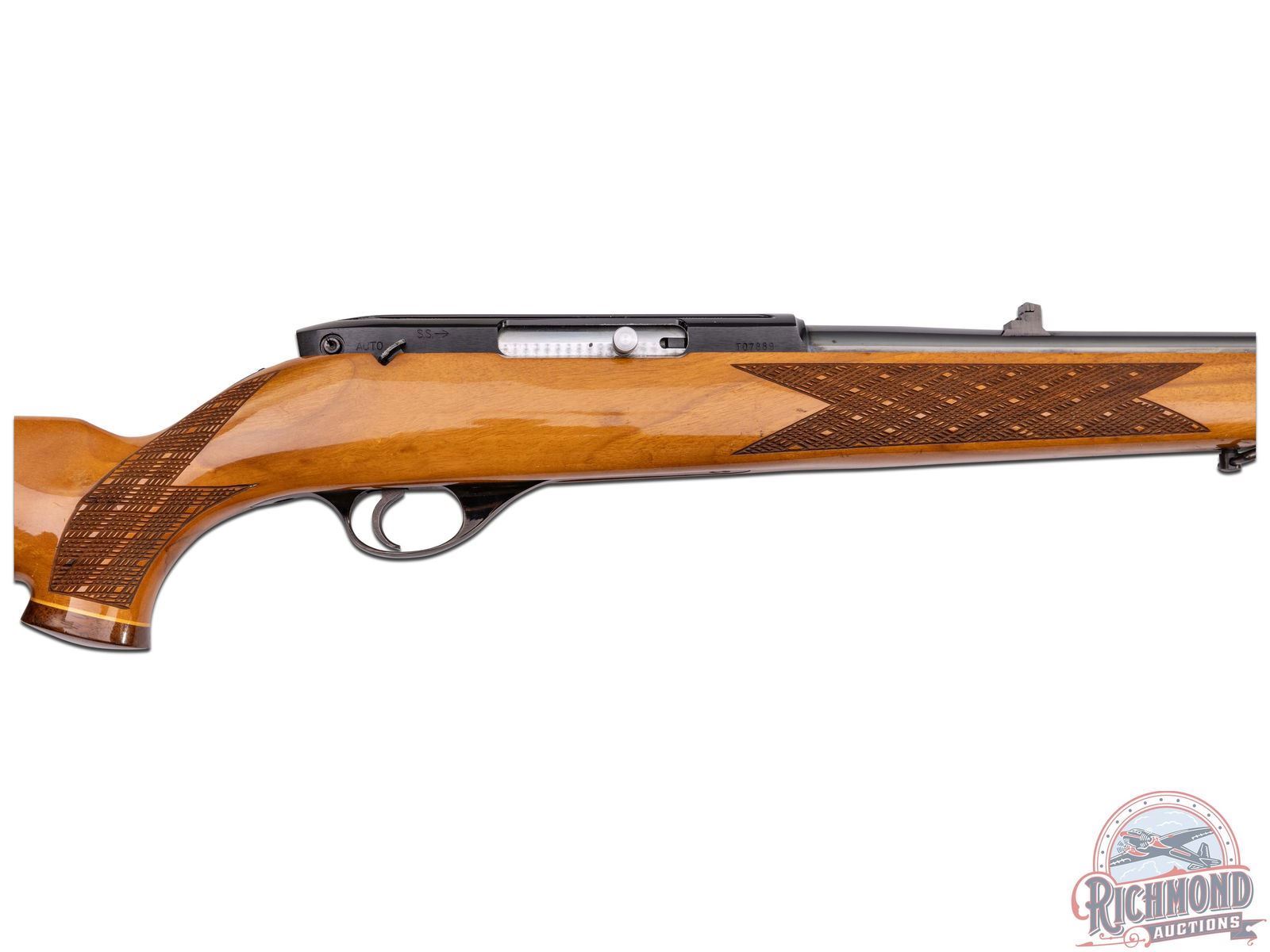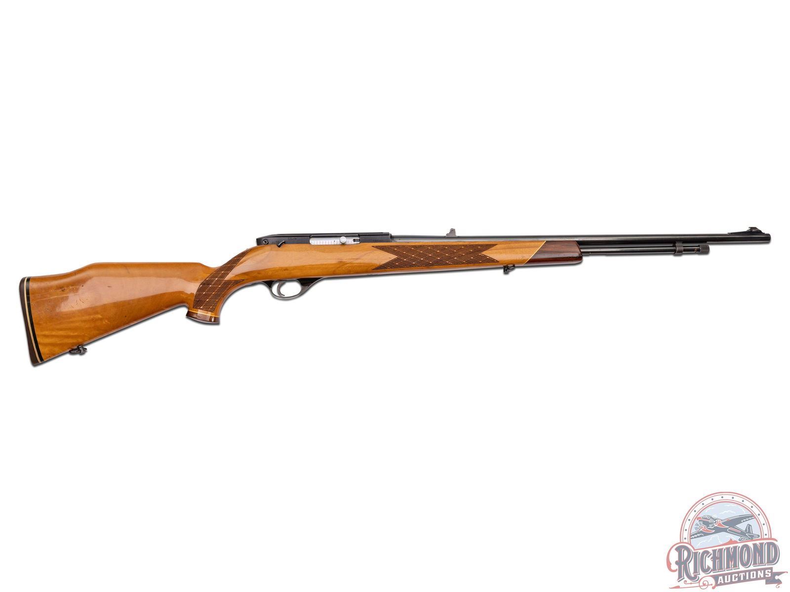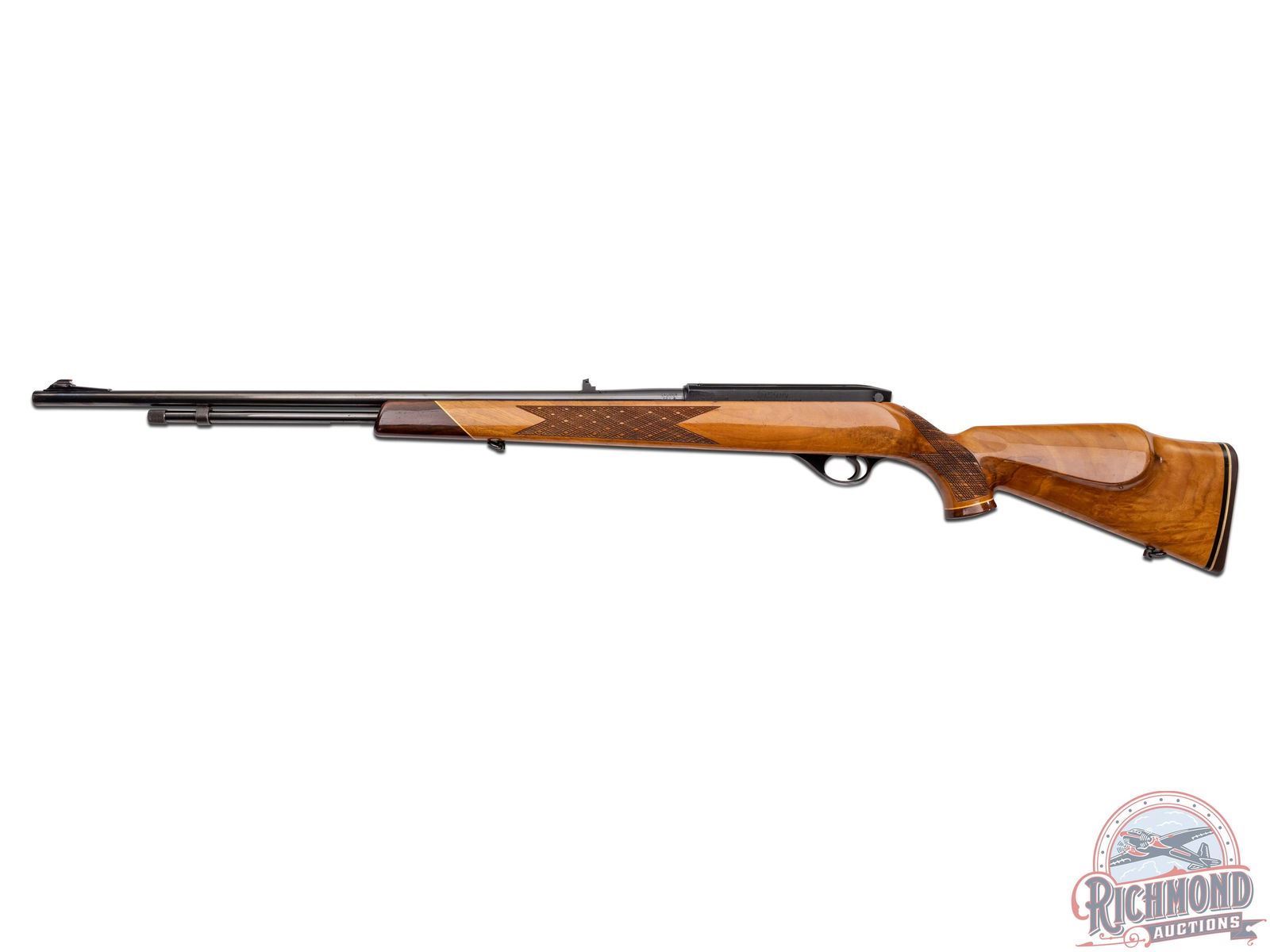 Manufactured circa 1975 by Weatherby in Japan. Features a 24" blued tapered barrel with 3-range leaf flip-up rear notch and blade with brass bead front sight. Tubular magazine feeds a semi-automatic action with half jeweled bolt. Blued receiver with dovetail groove. Tang mounted manual thumb safety and blued steel trigger guard. High gloss wood birch stock with skip-line hand checkering on pistol grip and forearm. Right side cheekpiece. White lined Rosewood tip and pistol grip cap with white diamond inlay. Black and white lined factory brown recoil pad and equipped with sling swivels. LOP: 13-1/2". CALIBER: 22 LR. S/N: T07889. FFL STATUS: Modern.